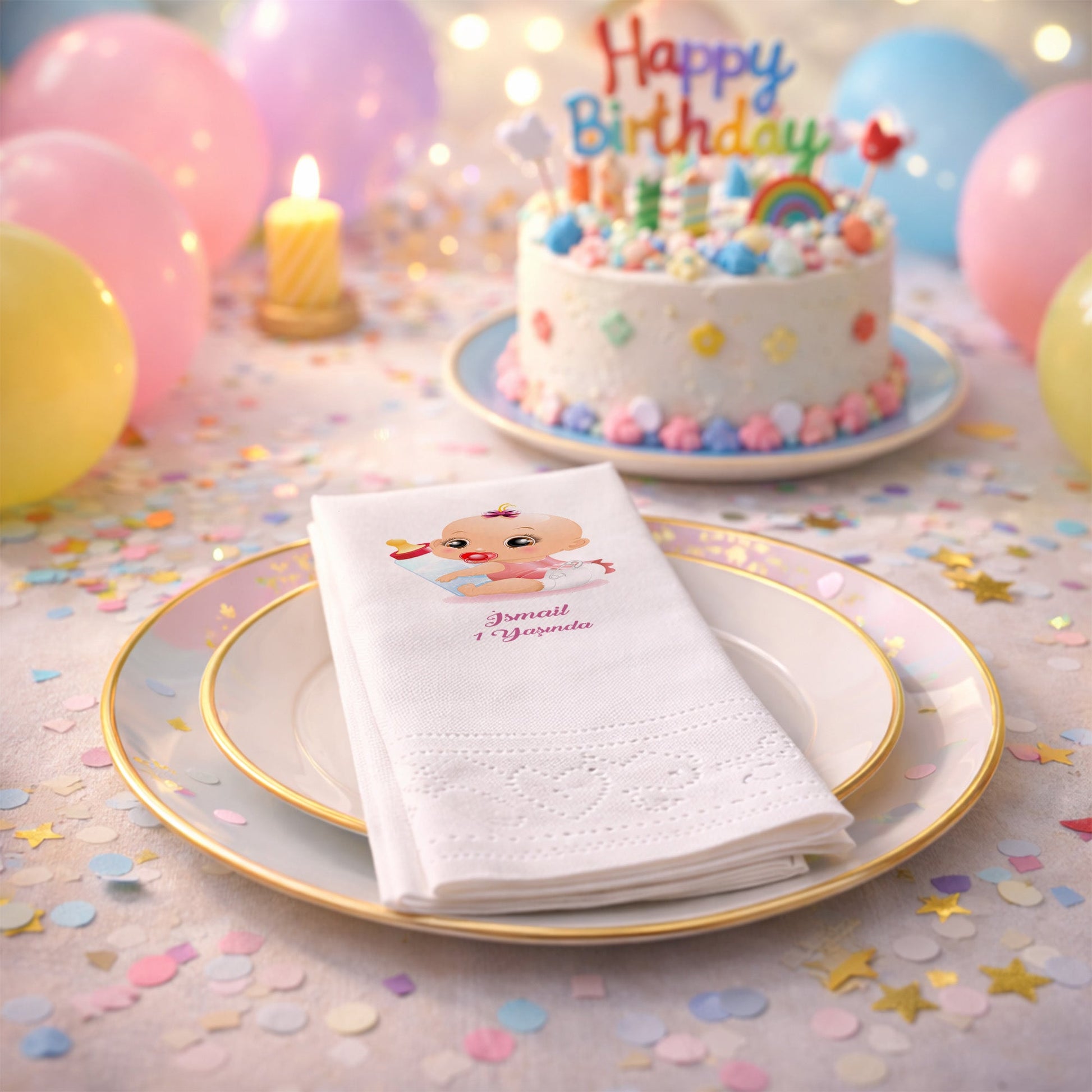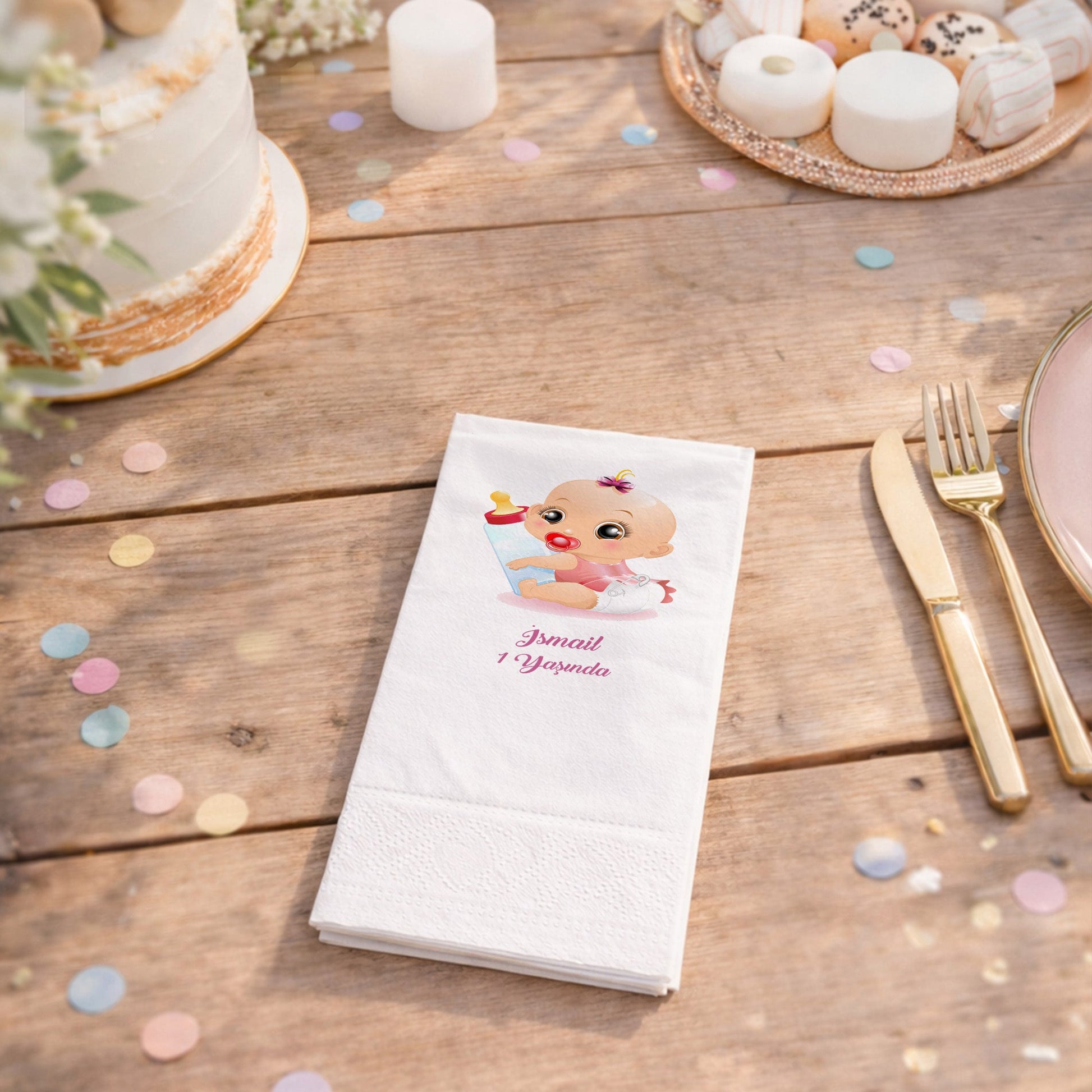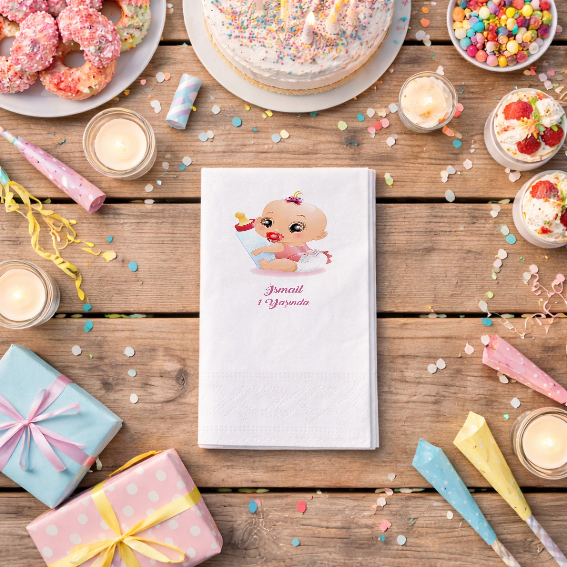 İsmail bebeğin ilk doğum günü partisine canlılık katacak bu peçete, büyük gözlü sevimli bebek ve biberon figürüyle eğlenceli bir konsept sunar. Pembe tonlarının hakim olduğu tasarım, isme özel baskısıyla masanızda fark yaratır. 1. yaş günü kutlamalarında hem çocukların hem de yetişkinlerin ilgisini çekecek bu illüstrasyon, yüksek kaliteli kağıt malzemesiyle birleşmiştir. Emici dokusu ikram sırasında kolaylık sağlarken, özel tasarımı sayesinde masanızın yıldız parçası olur. Yenidoğan partileri, diş buğdayı veya doğum günleri için tercih edilebilecek bu ürün, kutlamanızı daha profesyonel ve özenli gösterir. İsmail yazısı ve kutlama mesajıyla zenginleştirilen bu peçeteler, her ayrıntısı düşünülmüş bir organizasyonun en tatlı parçasıdır.