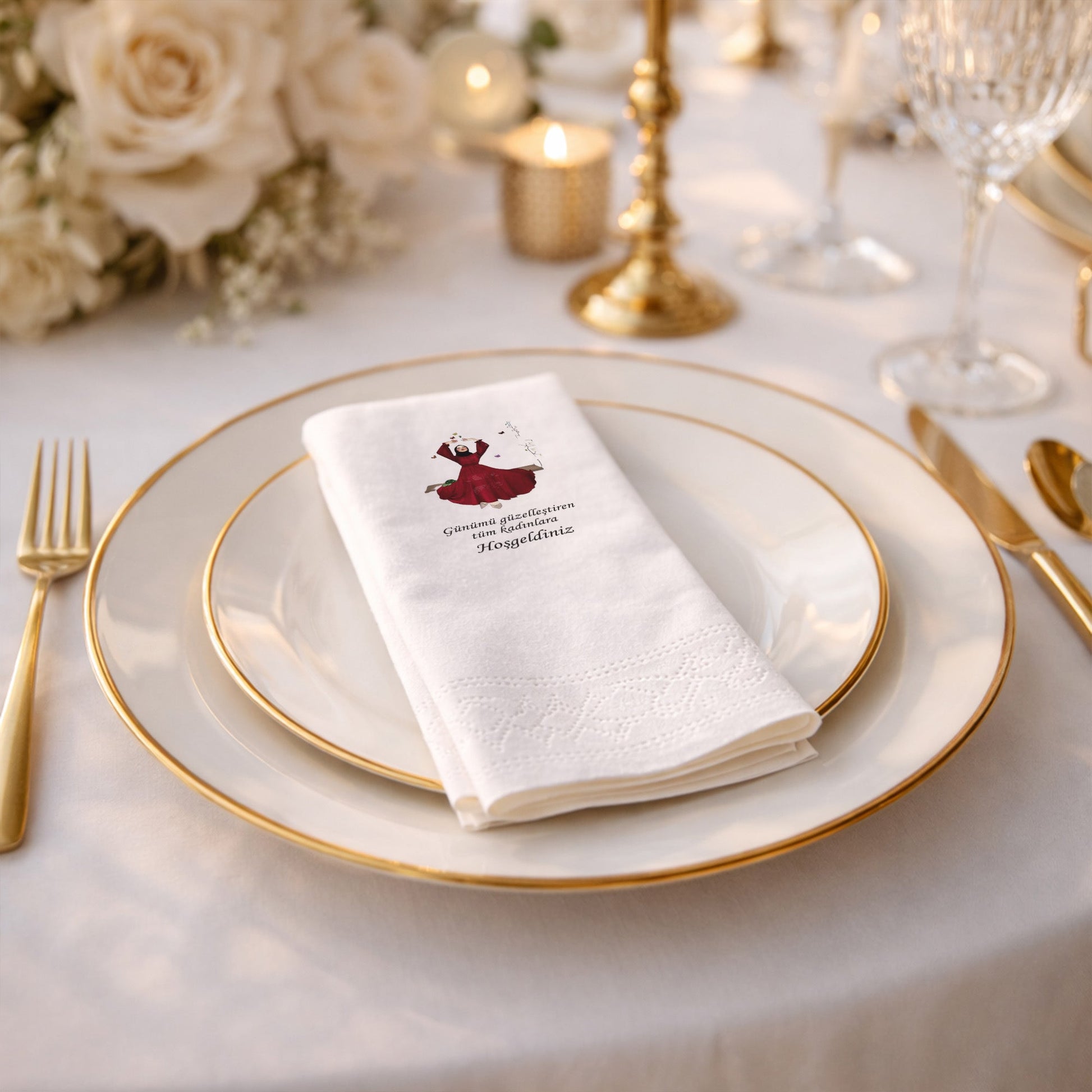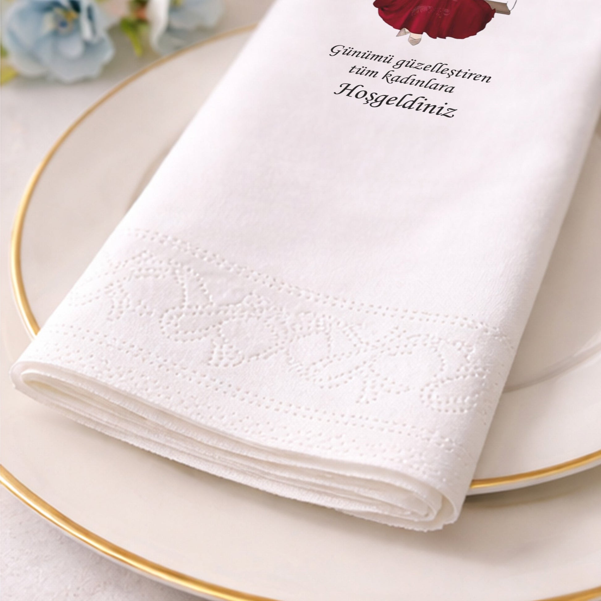 "Günümü güzelleştiren tüm kadınlara Hoşgeldiniz" mesajıyla kalpleri kazanan bu tasarım, salıncakta sallanan gelin figürüyle huzurlu ve estetik bir atmosfer yaratıyor. Çiçeklerin ve kelebeklerin eşlik ettiği bu baskılı peçete, kına gecesi organizasyonlarınızda davetlilerinizle kurduğunuz bağı simgeler. Modern illüstrasyon tarzıyla hazırlanan ürün, soft renk paletiyle her türlü masa dekoruna uyum sağlar. Özel gün peçetesi olarak tercih edildiğinde, sunumun zarafetini tamamlar ve konuklarınıza verdiğiniz değeri hissettirir. Yüksek emicilik özelliği ve pürüzsüz yüzeyi ile hem pratik hem de dekoratiftir. Kına gecesi hazırlıklarında fark yaratmak, anlamlı bir detayla geceyi taçlandırmak isteyenler için bu ürün eşsiz bir seçimdir. Estetik ve duygusallığın buluştuğu bu peçete ile unutulmaz anılar biriktirin.