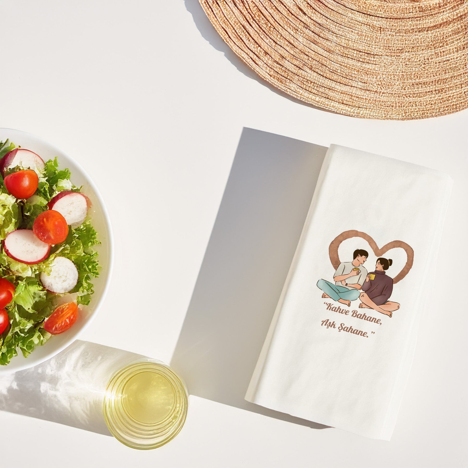 Kahvenin bahaneye, aşkın şahane anlara dönüştüğü sofralar için tasarlanan Kahve Desenli Baskılı Peçete, kalp figürü içinde kahve içen çift illüstrasyonu ve “Kahve bahane, aşk şahane” mesajıyla romantik bir atmosfer oluşturur. Sevgi, sohbet ve paylaşımı simgeleyen bu tasarım, kahve ikramlarını anlamlı bir ritüele dönüştürür.