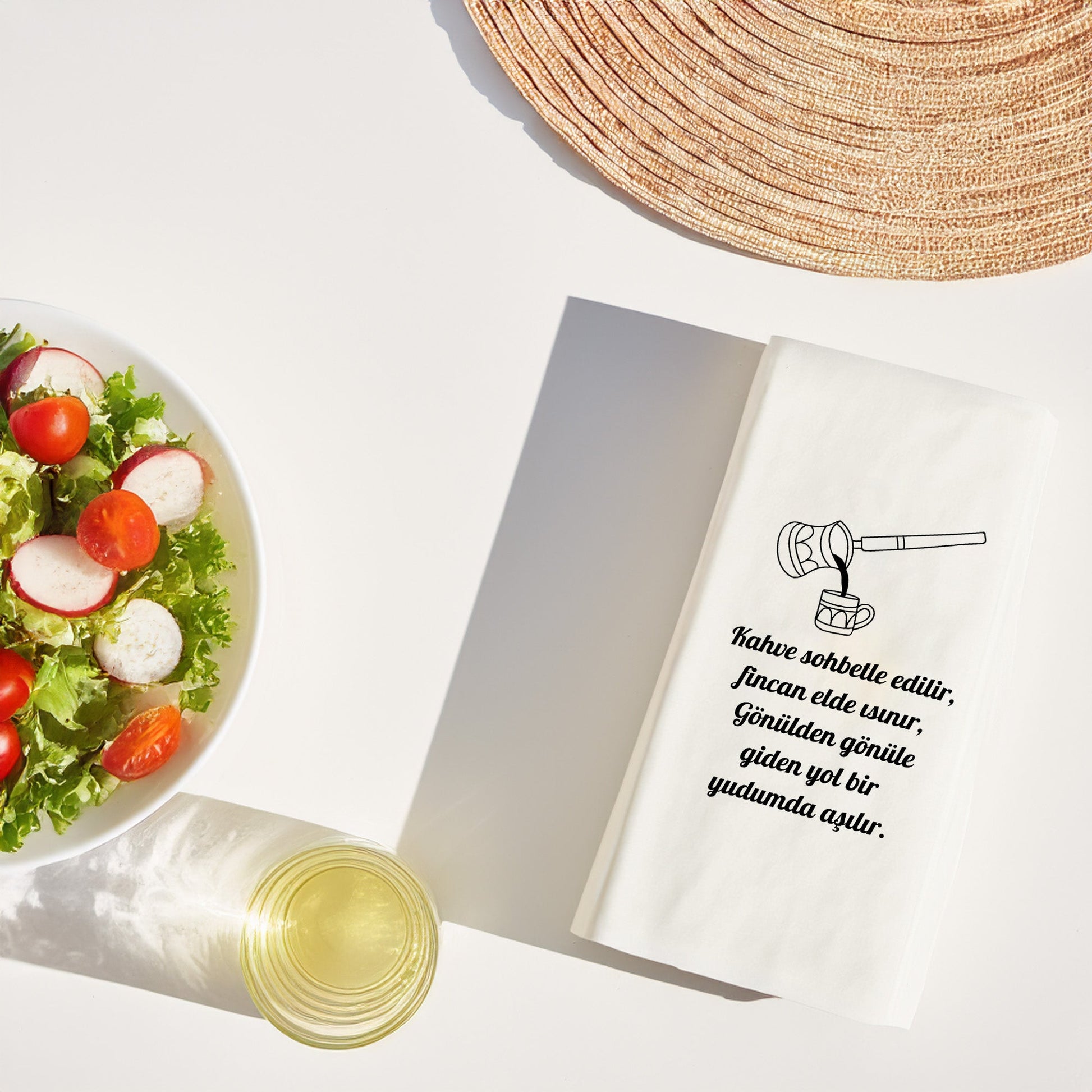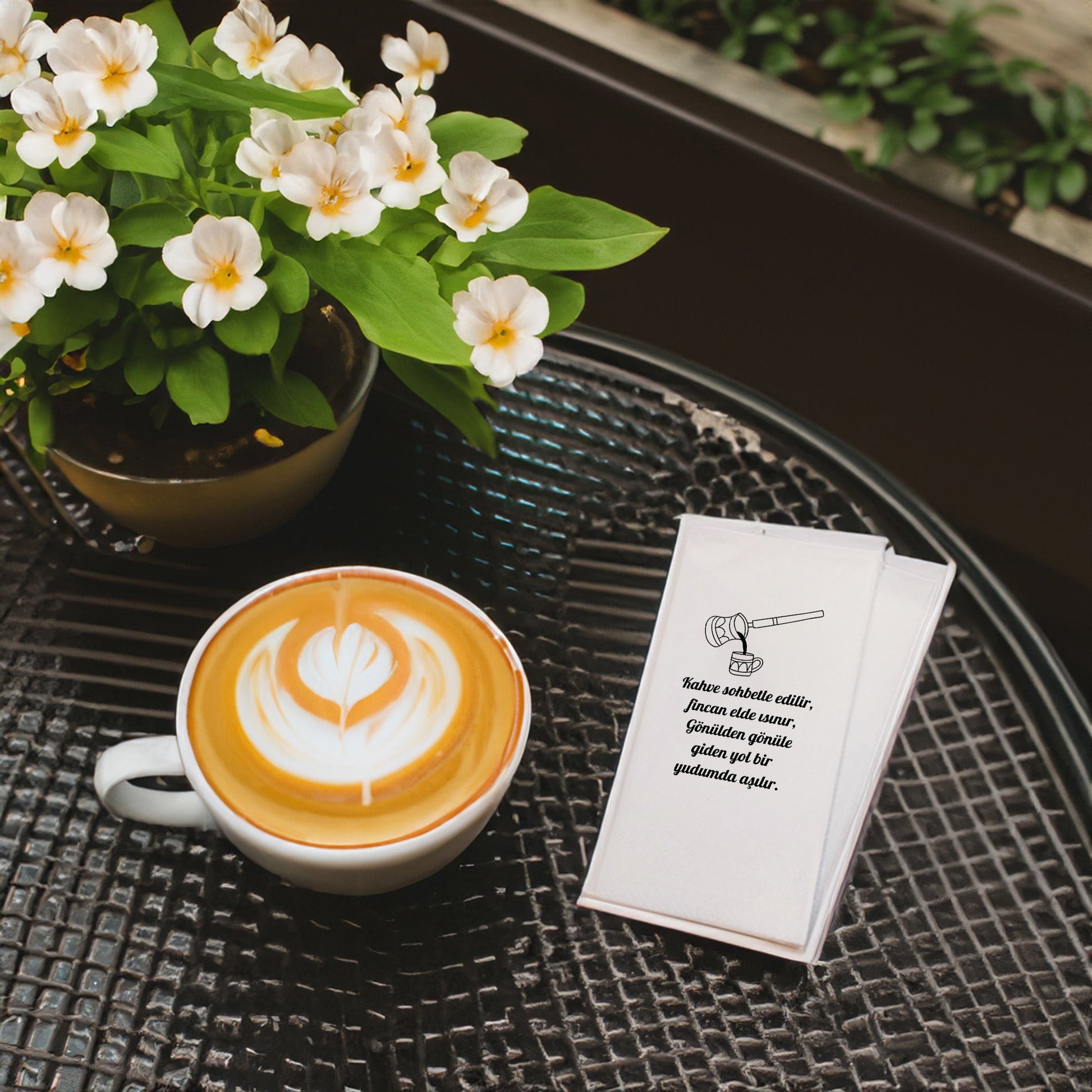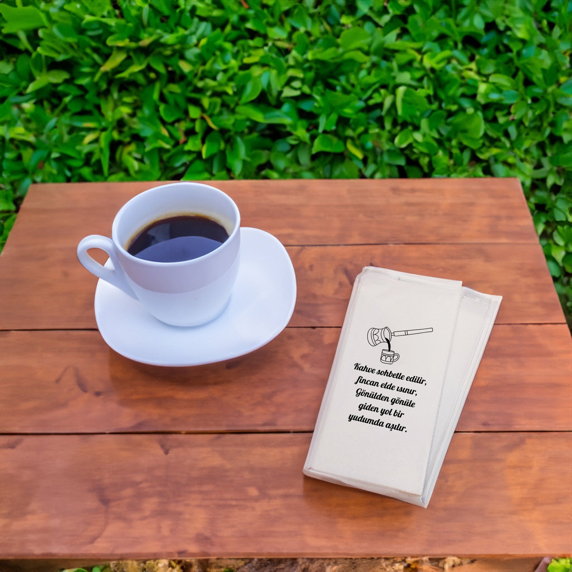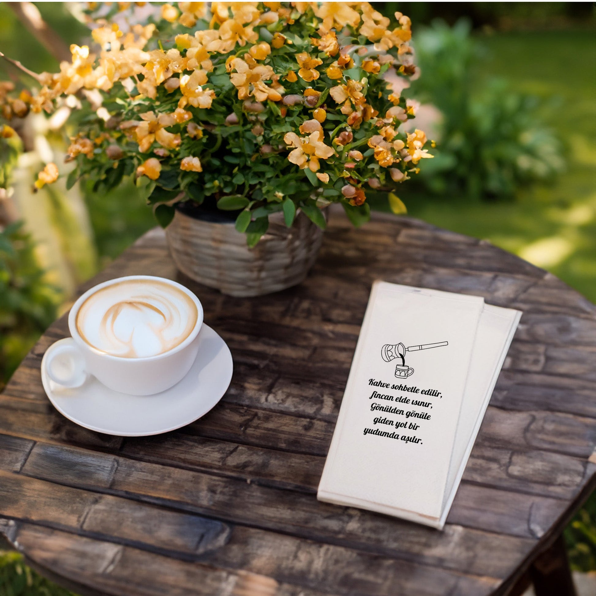 Kahve sunumlarına sade ve zarif bir dokunuş katan Kahve Desenli Baskılı Peçete, minimal fincan ve cezve illüstrasyonu ile klasik kahve ritüelini modern bir çizgide yansıtır. Yazısız tasarımı sayesinde her tarz sofra, organizasyon ve mekânla uyum sağlar. Türk kahvesi sunumları, misafir ağırlama ve günlük kahve keyfi için ideal bir tamamlayıcıdır.