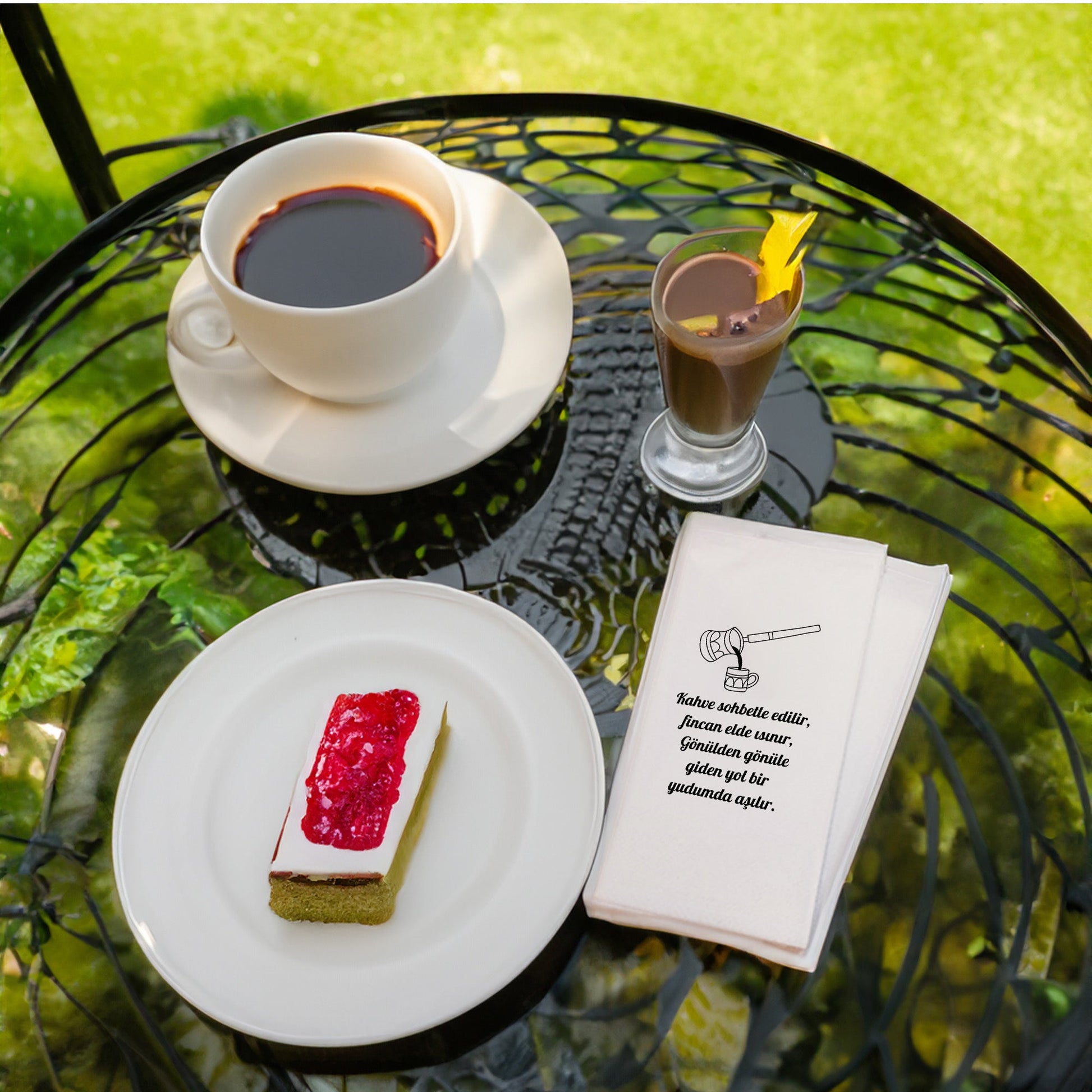 33x33 cm ölçülerinde, çift katlı %100 selülozik beyaz peçeteden üretilmiştir. Baskılar, solvent içermeyen ve gıda ile temasa uygun boyalar kullanılarak yapılır. Yumuşak dokusu, dayanıklı yapısı ve sağlıklı içeriği ile hem estetik hem de güvenli bir kullanım sunar. Garson katlama (16x8 cm) formu sayesinde masada düzenli ve profesyonel bir görünüm oluşturur.