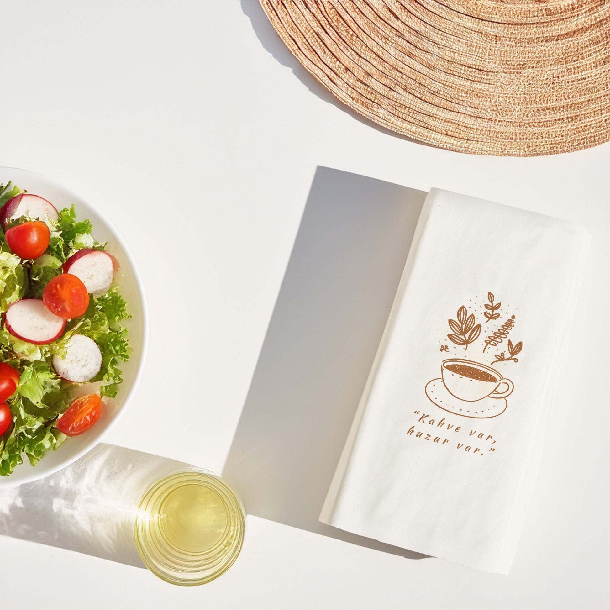 “Kahve var, huzur var.” mesajını sade ve zarif bir çizim diliyle sunan bu Kahve Desenli Baskılı Peçete, kahve fincanı ve bitkisel motiflerle dingin bir atmosfer oluşturur. Minimal tasarımı sayesinde göz yormaz, masada doğal bir şıklık sağlar. Kahveyi yalnızca bir içecek değil, bir anı ve ritüel olarak görenler için tasarlanmıştır.