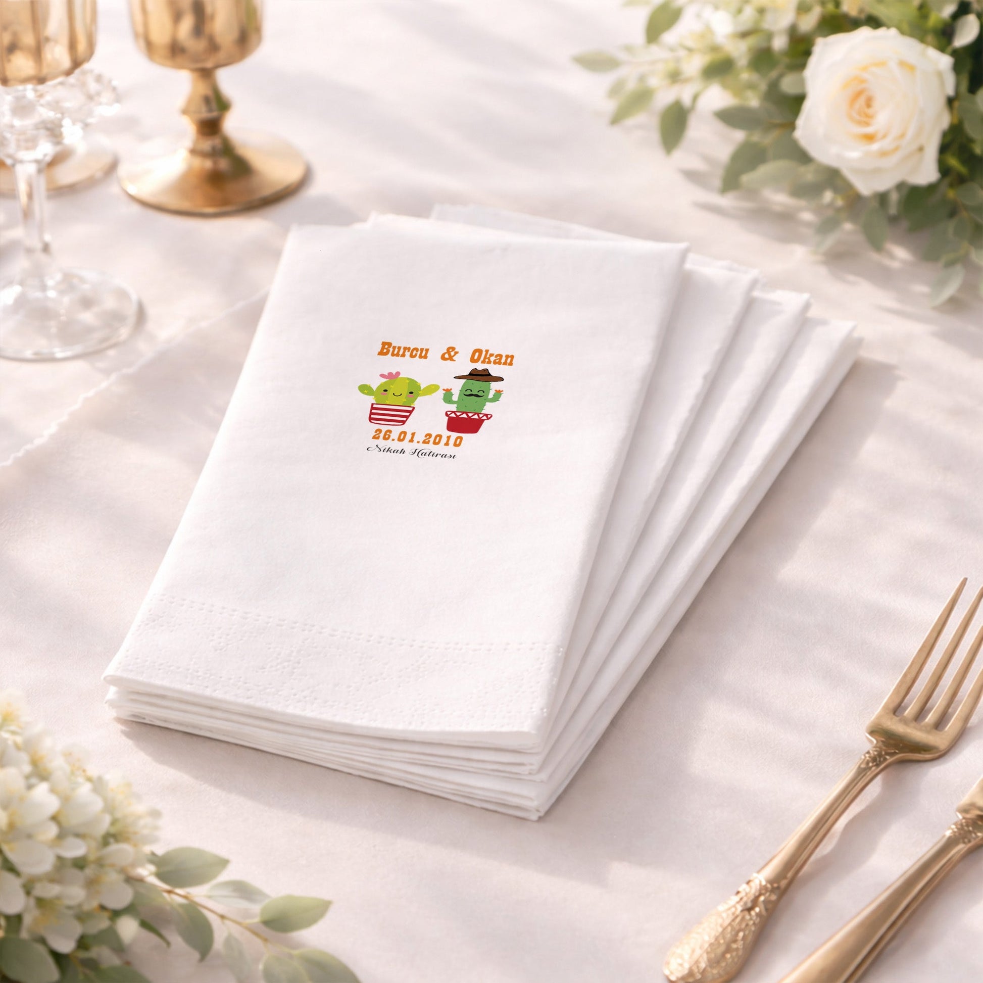 Sevimli kaktüs figürleriyle hazırlanan bu baskılı peçete, nikah ve kına organizasyonları için eğlenceli ve enerjik bir stil sunar. İsim ve tarih detaylarıyla kişiselleştirilebilen tasarım, özel gün peçetesi olarak davetlere samimi bir hava katar. Organizasyon peçetesi olarak konseptli ve butik kutlamalarda öne çıkar. Kına peçetesi ve nikah peçetesi olarak kullanıma uygundur. Baskılı peçete yapısı sayesinde renkler canlı ve net görünür. Klasik tasarımların dışında, neşeli ve özgün bir alternatif arayan çiftler için ideal bir üründür.