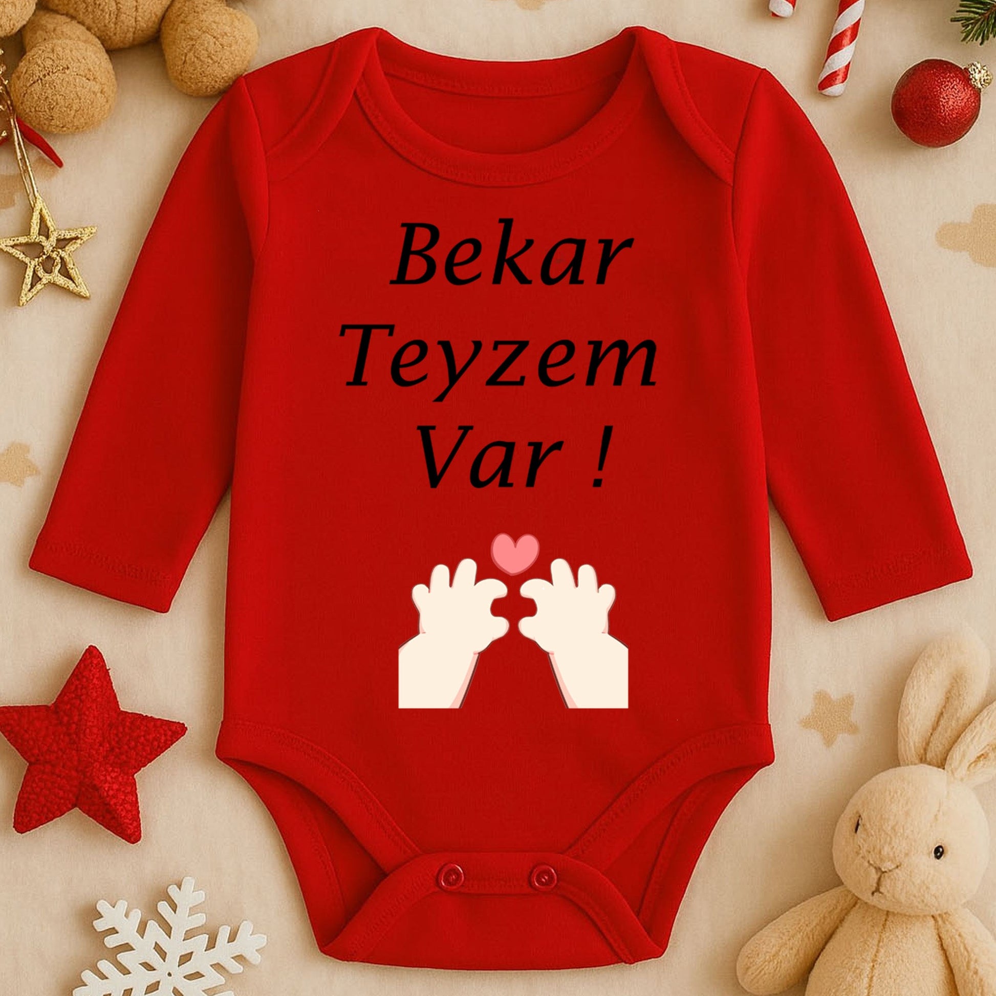 Bu özel tasarım zıbın, bebeğinize duyulan sevgiyi sade ve sıcak bir görselle yansıtır.