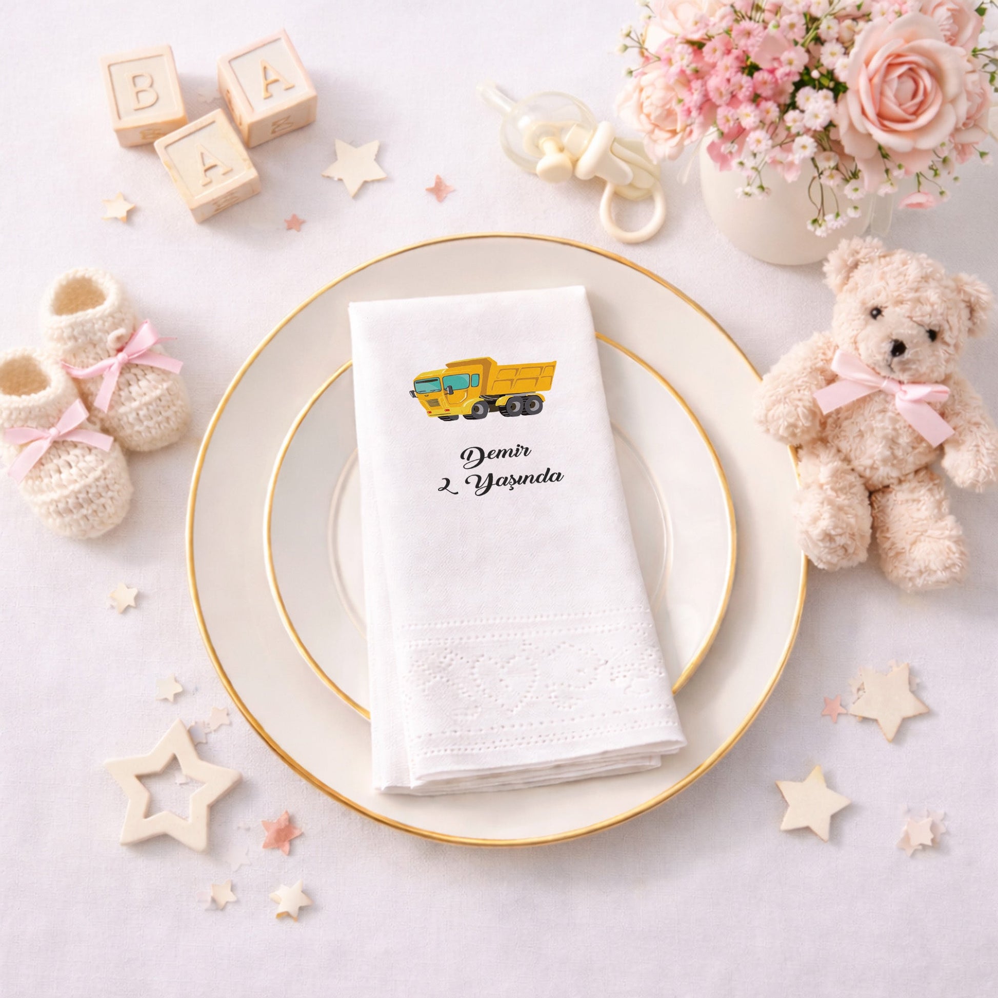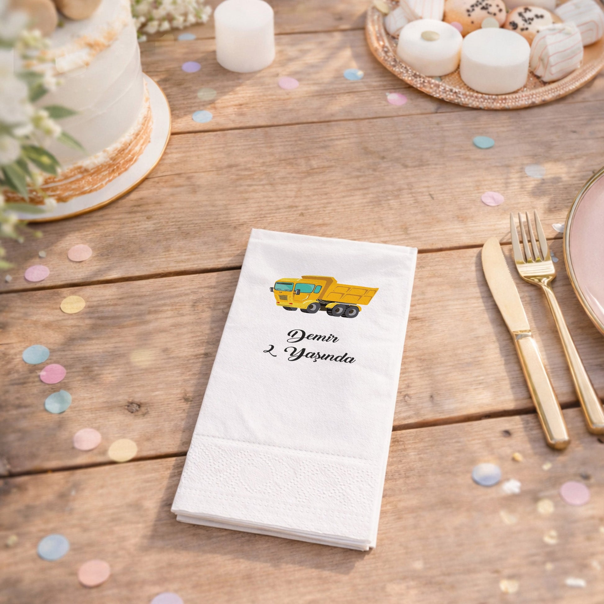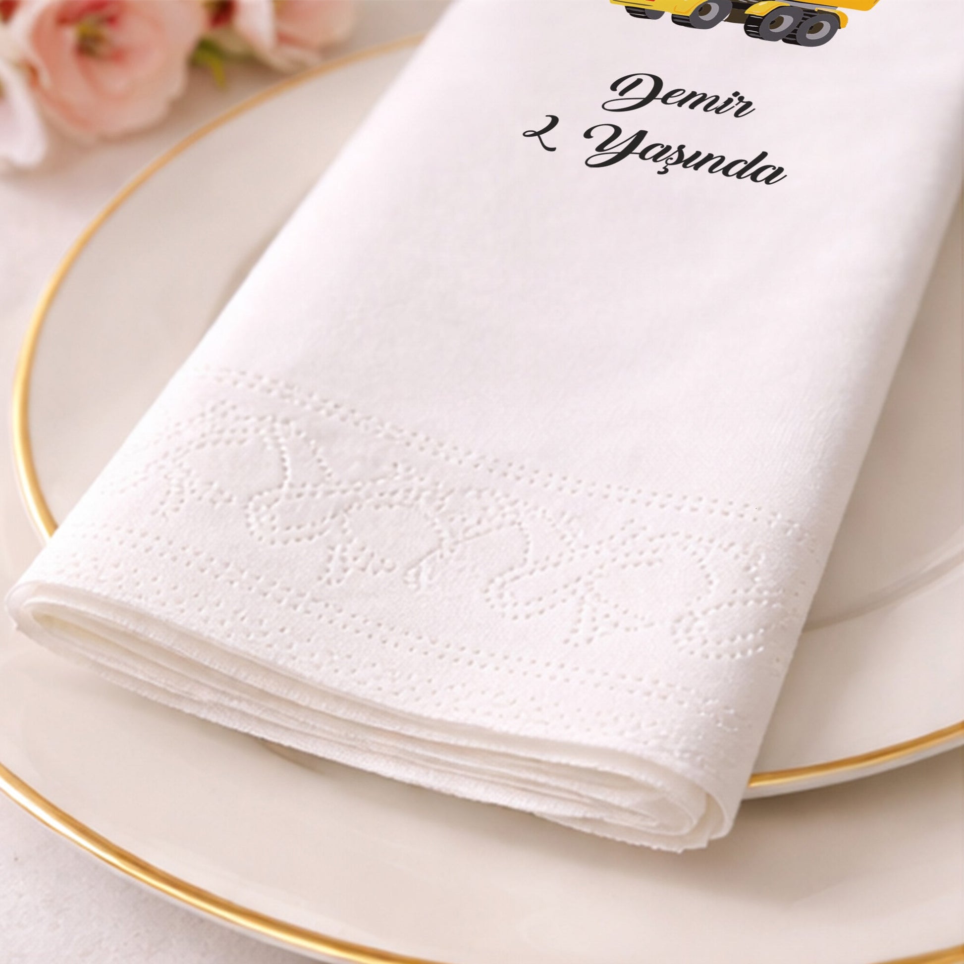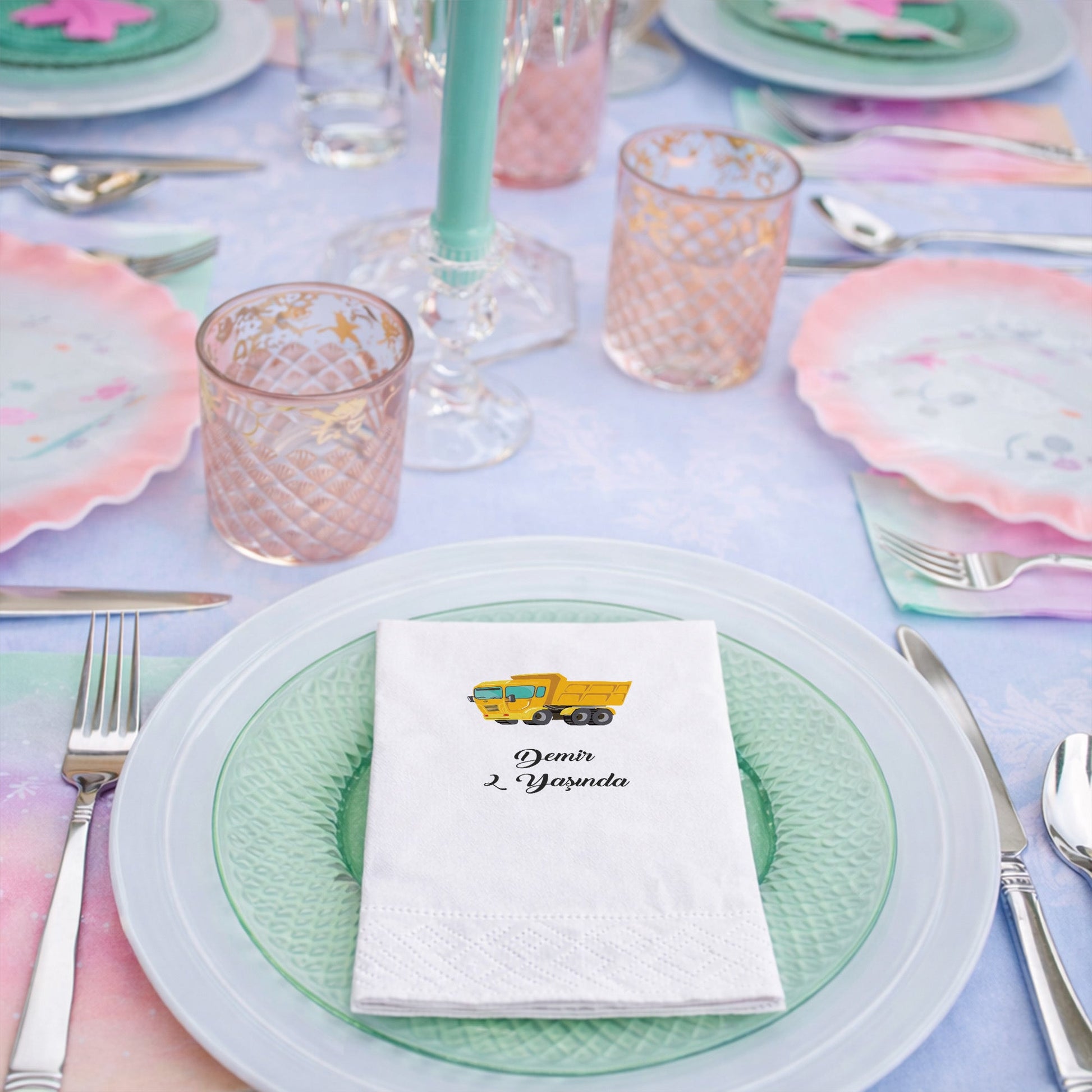 Damperli kamyon tasarımı ile hazırlanan bu peçete, araç temalı doğum günü organizasyonlarına dinamizm katar. Kişiye özel isim ve yaş bilgisiyle basılabilen tasarımı sayesinde kutlamanızı tamamen özgün hale getirir. Çift katlı ve yumuşak dokulu yapısı, hem dayanıklılık hem de konforlu kullanım sunar. Gıda temasına uygun baskı teknolojisi ile güvenle kullanılabilir. Doğum günü masasında pasta ve ikram sunumlarını temaya uygun şekilde tamamlar. Ev partileri, bahçe kutlamaları ve profesyonel organizasyonlar için ideal bir tercihtir. Erkek çocuklar için eğlenceli, ebeveynler için düzenli bir masa sunar.