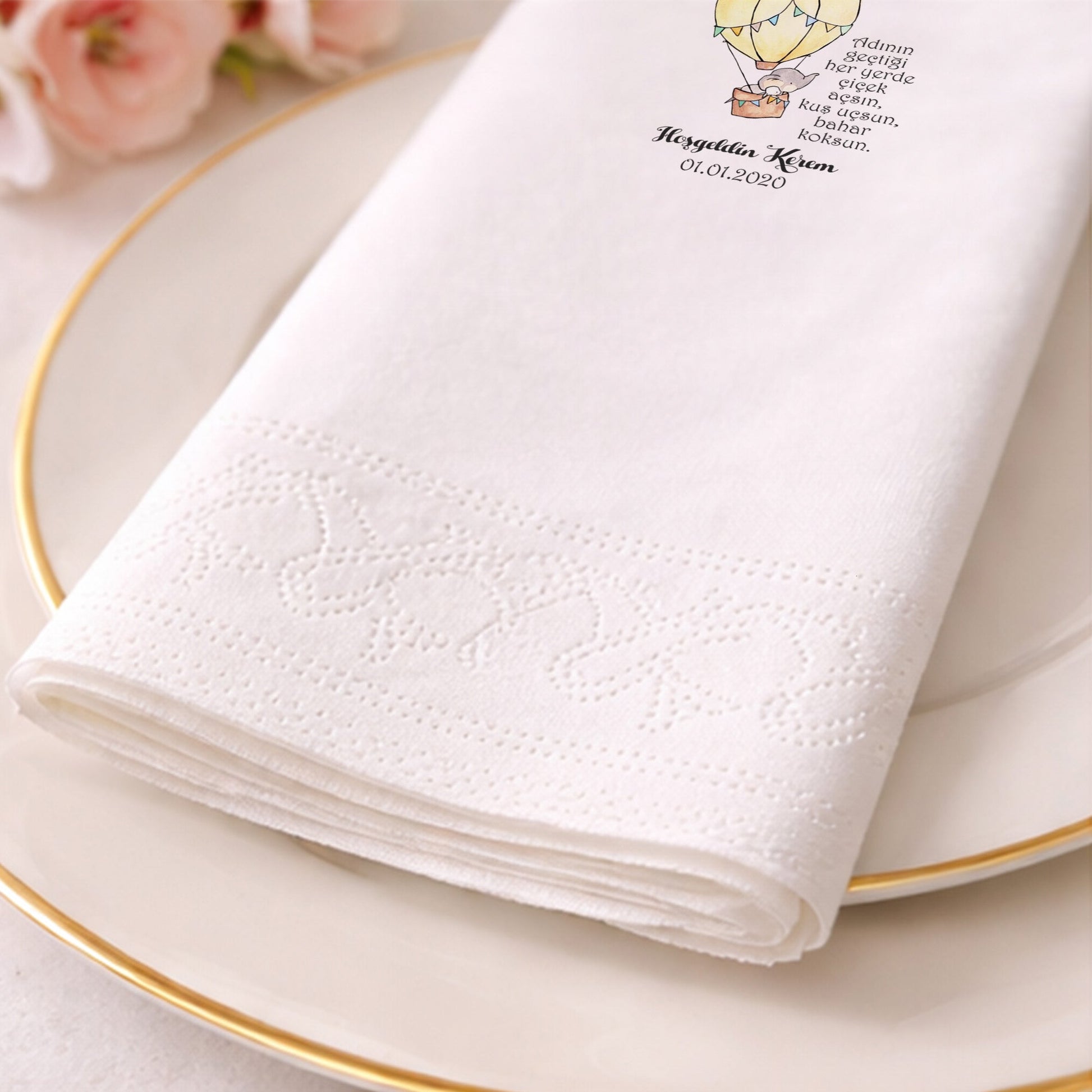 Modern ve sofistike bir kutlama arayanlar için siyah zemin üzerine altın sarısı uçan balon ve sevimli fil figürüyle tasarlanan bu peçete, fark yaratan bir şıklık sunar. Üzerinde yer alan "Adının geçtiği her yerde çiçek açsın" temennisiyle duygusal bir derinlik taşır. Kerem bebeğin doğum günü veya hoş geldin partisi için hazırlanan bu tasarım, klasik çocuk motiflerini şık bir arka planla birleştirir. Yüksek kontrastlı baskısı sayesinde masalarda iddialı bir duruş sergiler. Hem kaliteli hem de görsel açıdan zengin olan bu ürün, bebek partilerinde alışılmışın dışına çıkmak isteyen ebeveynler için harikadır. Estetik tasarımı ve anlamlı metniyle konuklarınız için kalıcı bir anı niteliği taşır. Gece mavisi veya gold temalı süslemelerle mükemmel bir kombin oluşturarak sofranızın yıldızı olur.