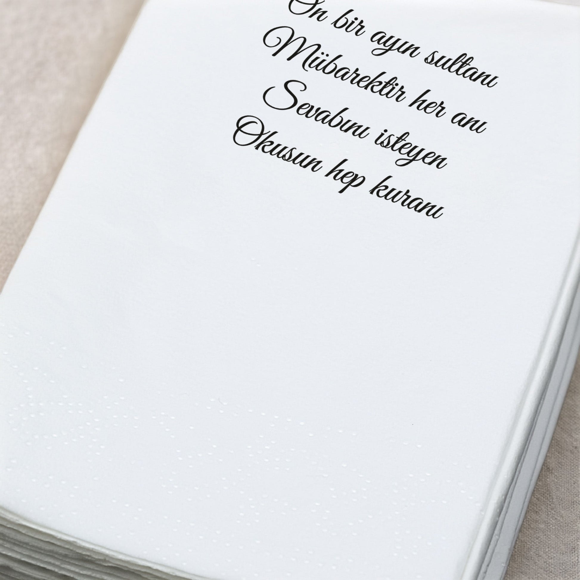 Kidzia’nın özel Ramazan koleksiyonundan Kur’an-ı Kerim Silüeti ve Mani Baskılı Peçete, Ramazan ayının maneviyatını ve huzurunu sofralara taşıyan zarif bir tasarımdır.