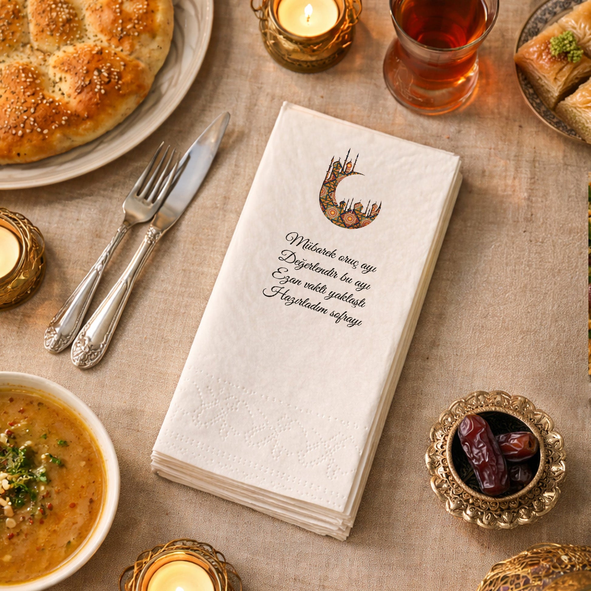 Renkli hilal figürü, asılı fenerler ve yıldız motifleriyle bu peçete; iftar ve sahur sofralarına hem zarif hem modern bir estetik katar. Geleneksel Ramazan manisi ise sunuma anlamlı bir dokunuş ekler.