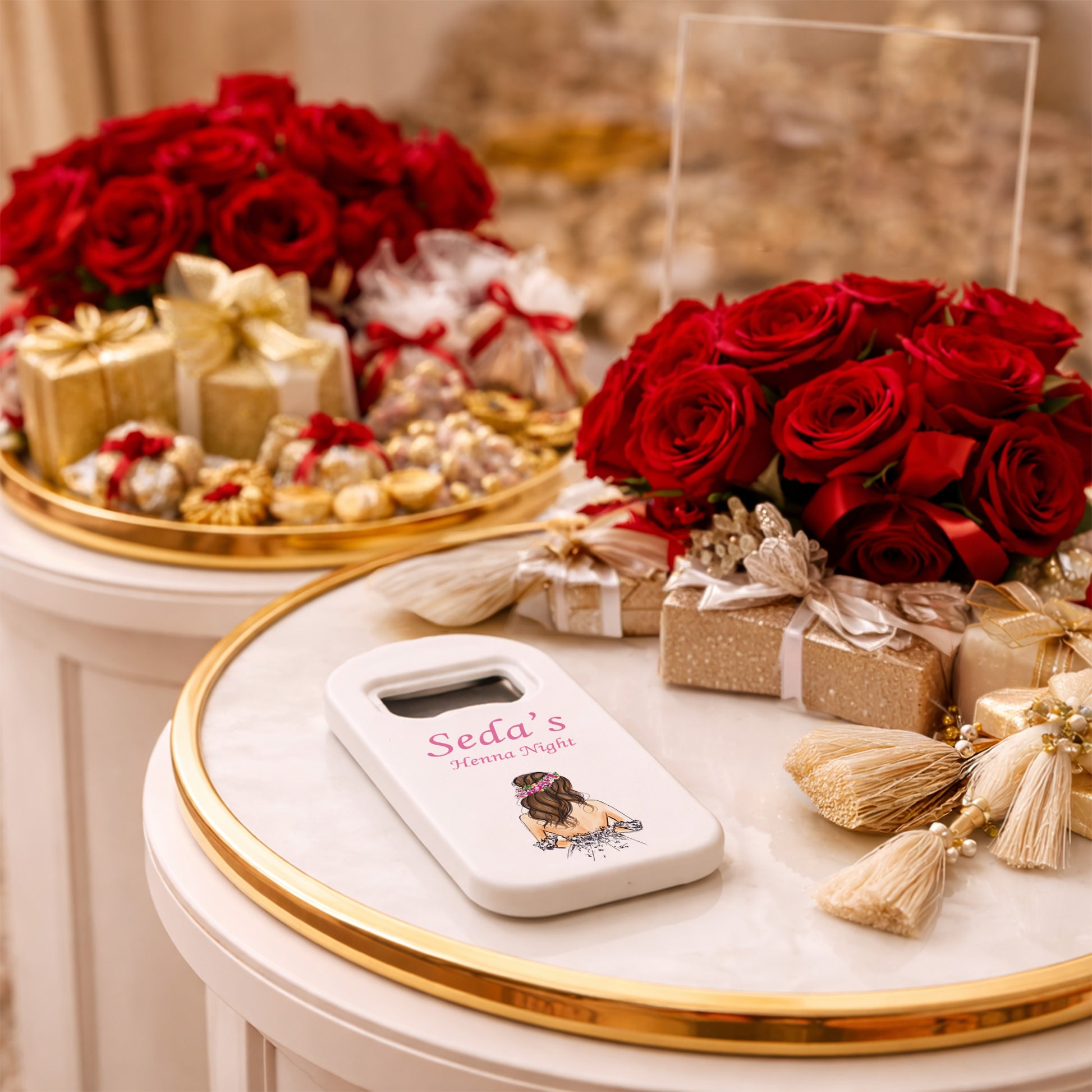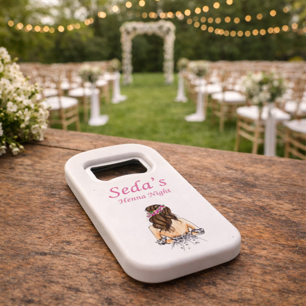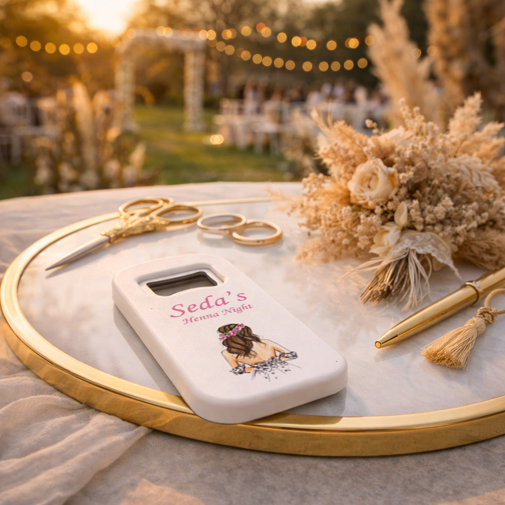 Kına gecesi ve bekarlığa veda organizasyonları için özel olarak tasarlanan bu magnet açacak, gelin temalı zarif illüstrasyonu ve kişiye özel isim detayı ile unutulmaz bir hatıra sunar. Modern ve romantik çizim tarzı ile hazırlanan gelin figürü, ürünün estetik görünümünü tamamlayarak organizasyonunuza şık bir dokunuş katar.