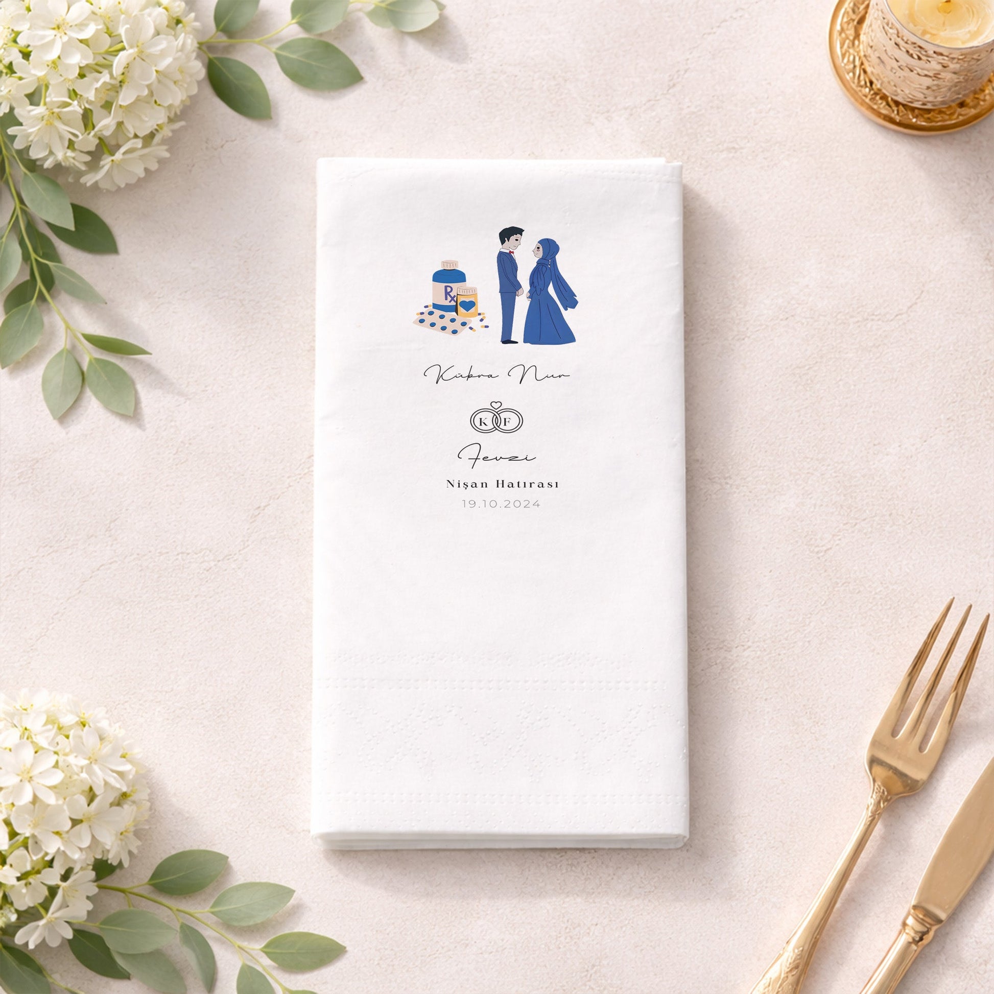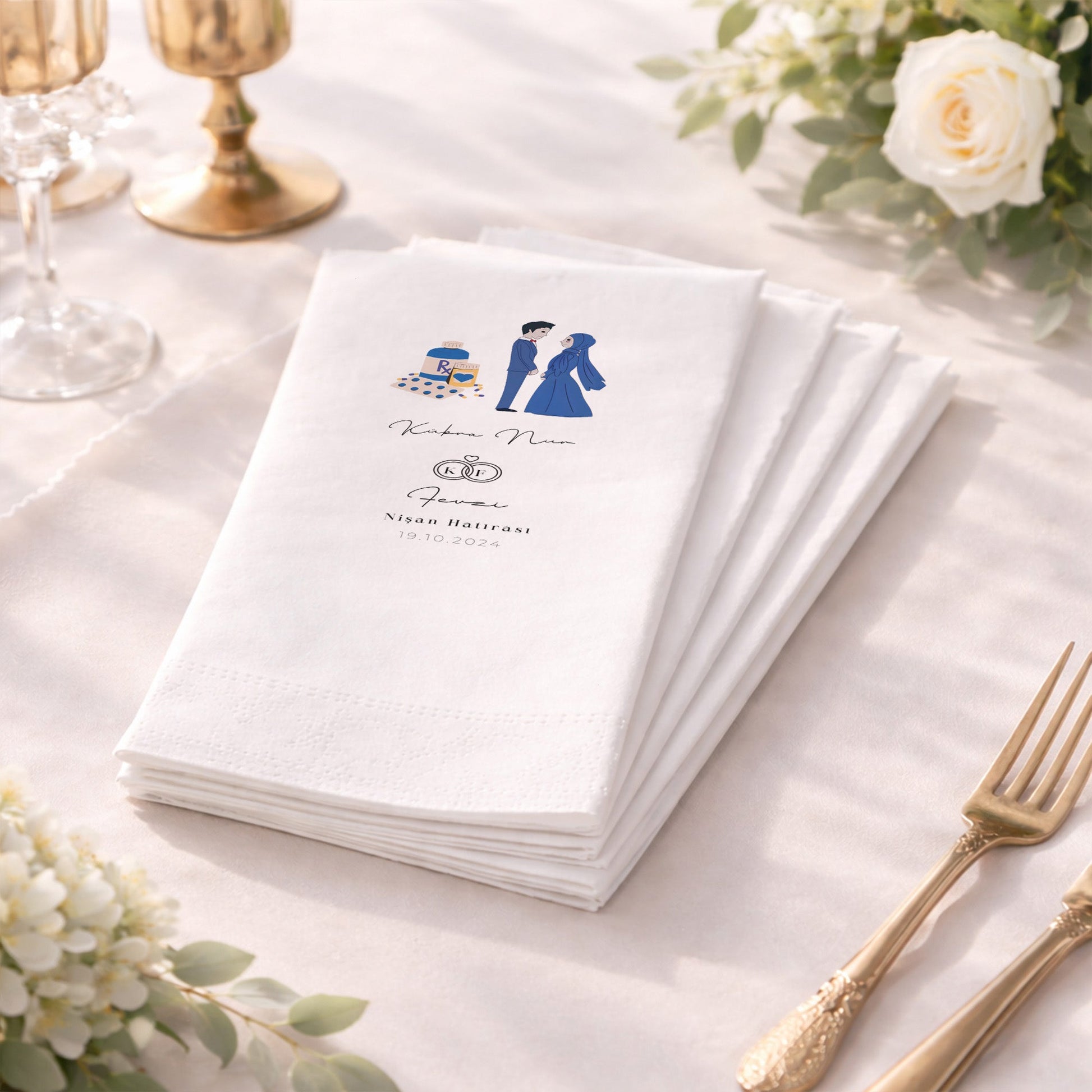Kübra Nur için tasarlanan bu nişan hatırası baskılı peçete, kişisel detaylarıyla öne çıkan özel bir üründür. Modern illüstrasyon ve zarif yazı karakteri, nişan organizasyonlarına samimi ve estetik bir hava katar. Özel gün peçetesi olarak masa düzenini tamamlar ve davetlilere anlamlı bir hatıra sunar. Organizasyon peçetesi olarak hem dekoratif hem de duygusal bir değer taşır. Baskılı peçete tasarımı sade arka planıyla her konsepte uyum sağlar. Nişan peçetesi arayanlar için kişiselleştirilebilir ve özgün bir alternatiftir.