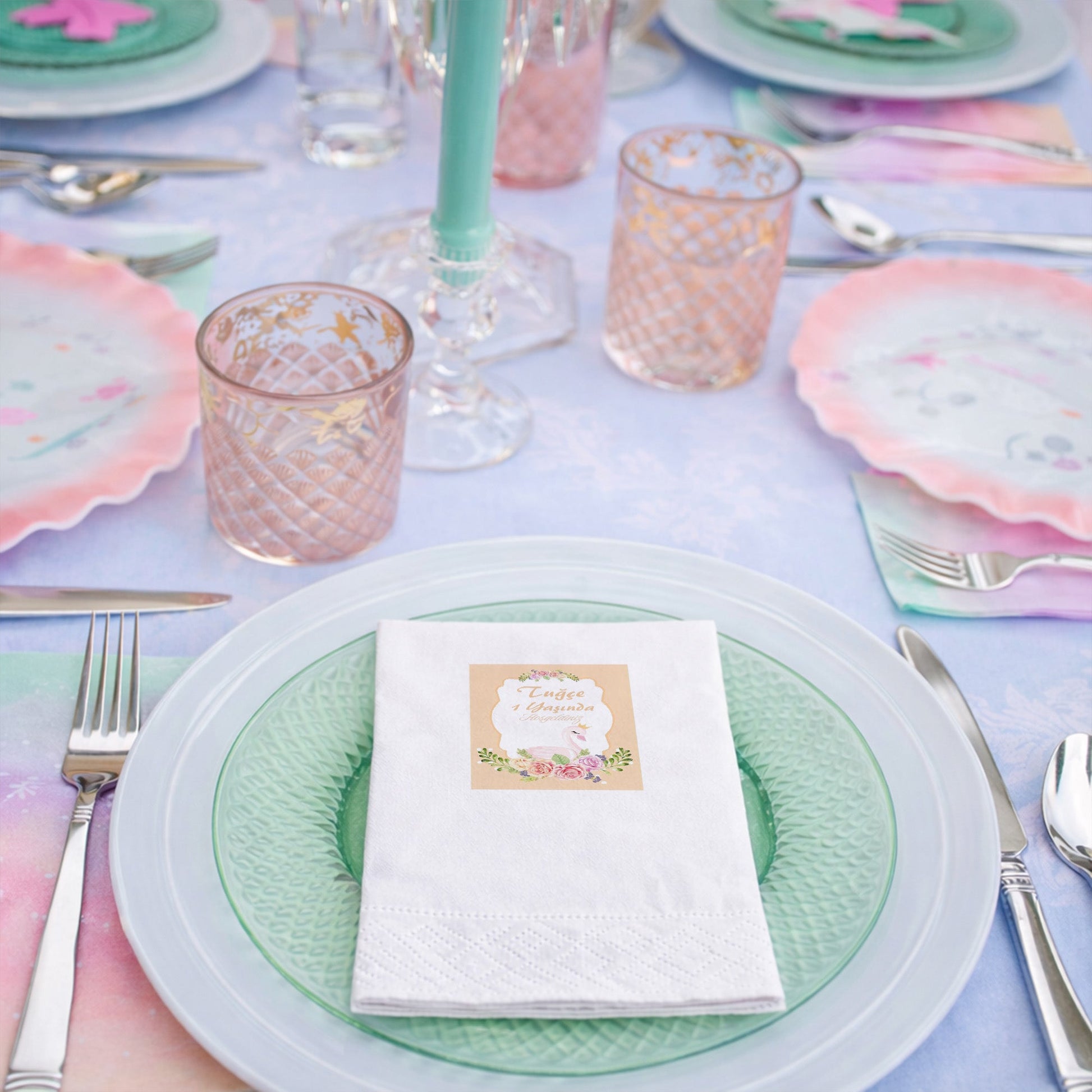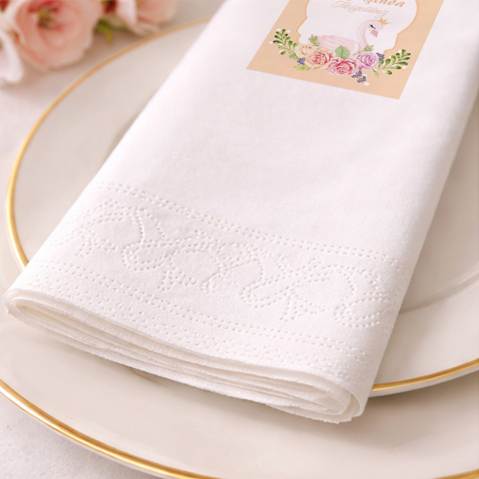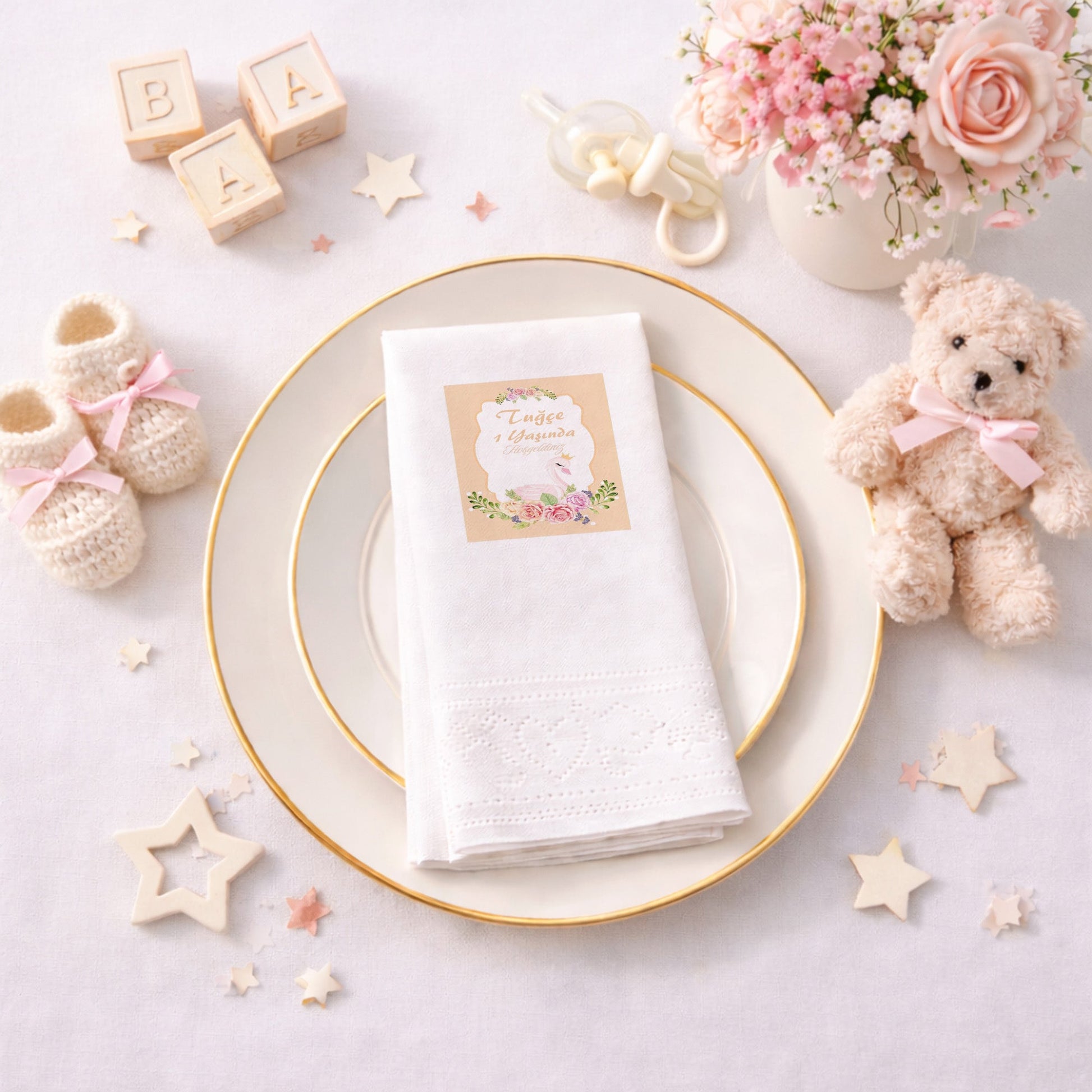 Kuğu ve çiçek detaylarıyla tasarlanan bu özel gün peçetesi, kız çocuk doğum günü ve baby shower organizasyonları için zarif bir alternatif sunar. Kişiye özel isim ve yaş bilgisi eklenerek hazırlanan tasarım, masa düzeninde bütünlük sağlar. Soft pastel renkleri ve romantik çiçek detayları ile şık bir atmosfer oluşturur. Çift katlı yapısı sayesinde dayanıklı ve yumuşaktır. Gıda temasına uygun baskı teknolojisi ile üretilmiştir. Doğum günü pastası, ikram tabakları ve masa süslemeleriyle uyumlu bir tamamlayıcıdır. Estetik sunumlara önem verenler için ideal bir üründür.