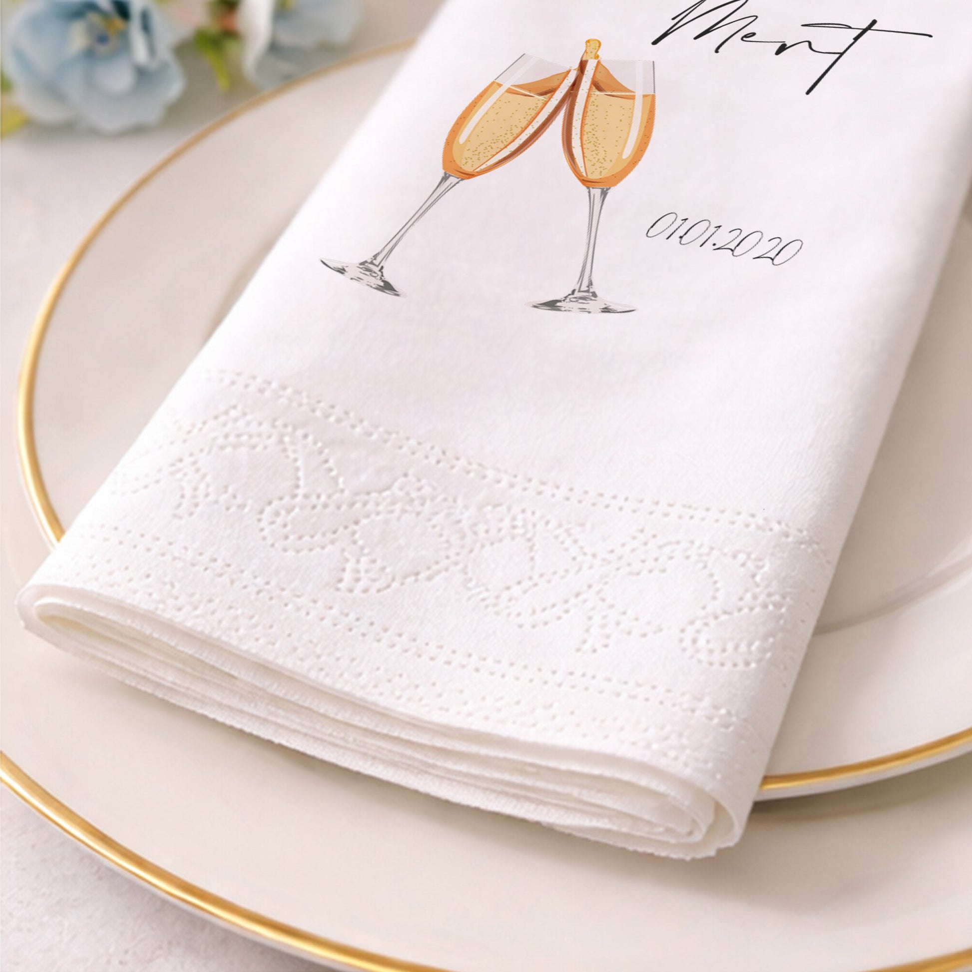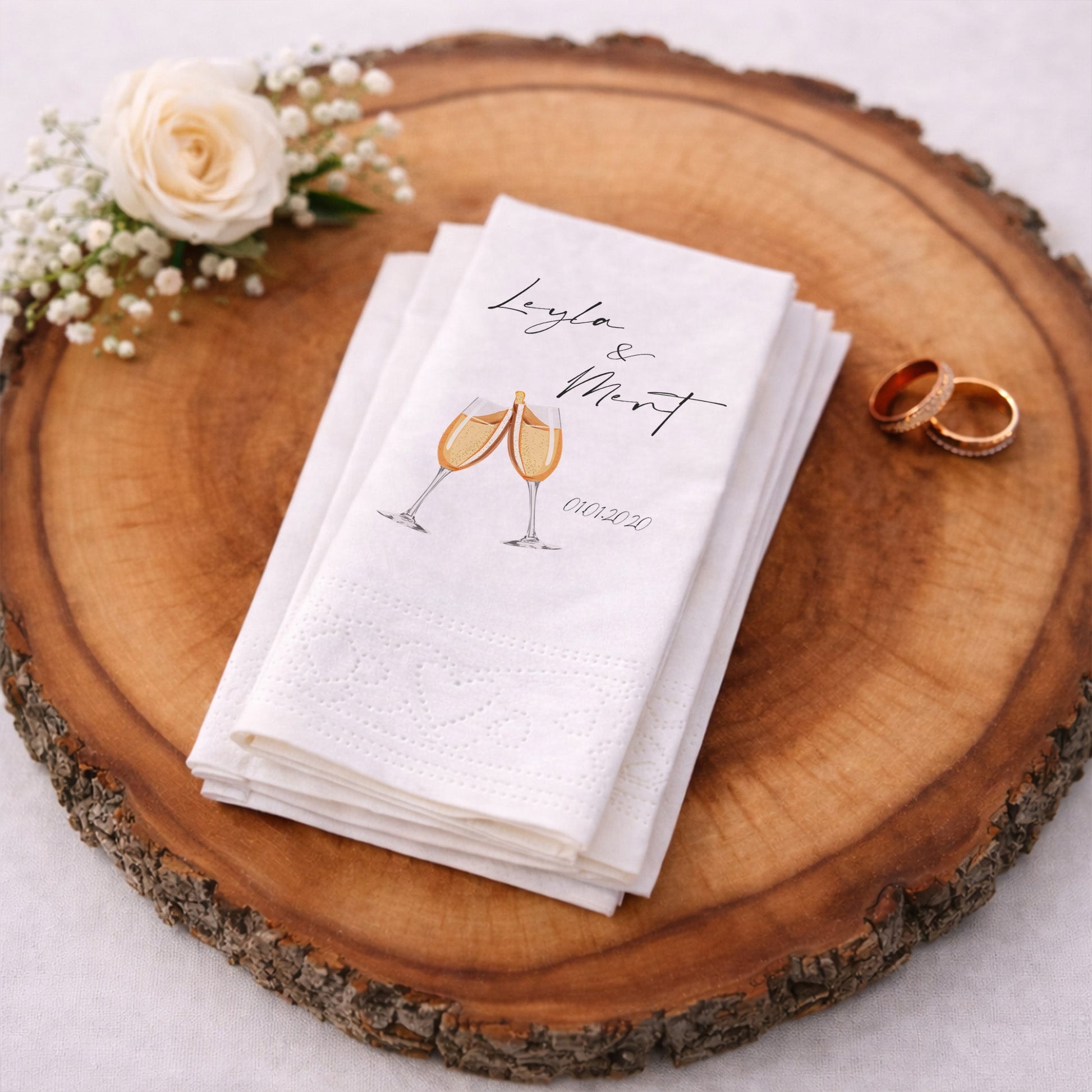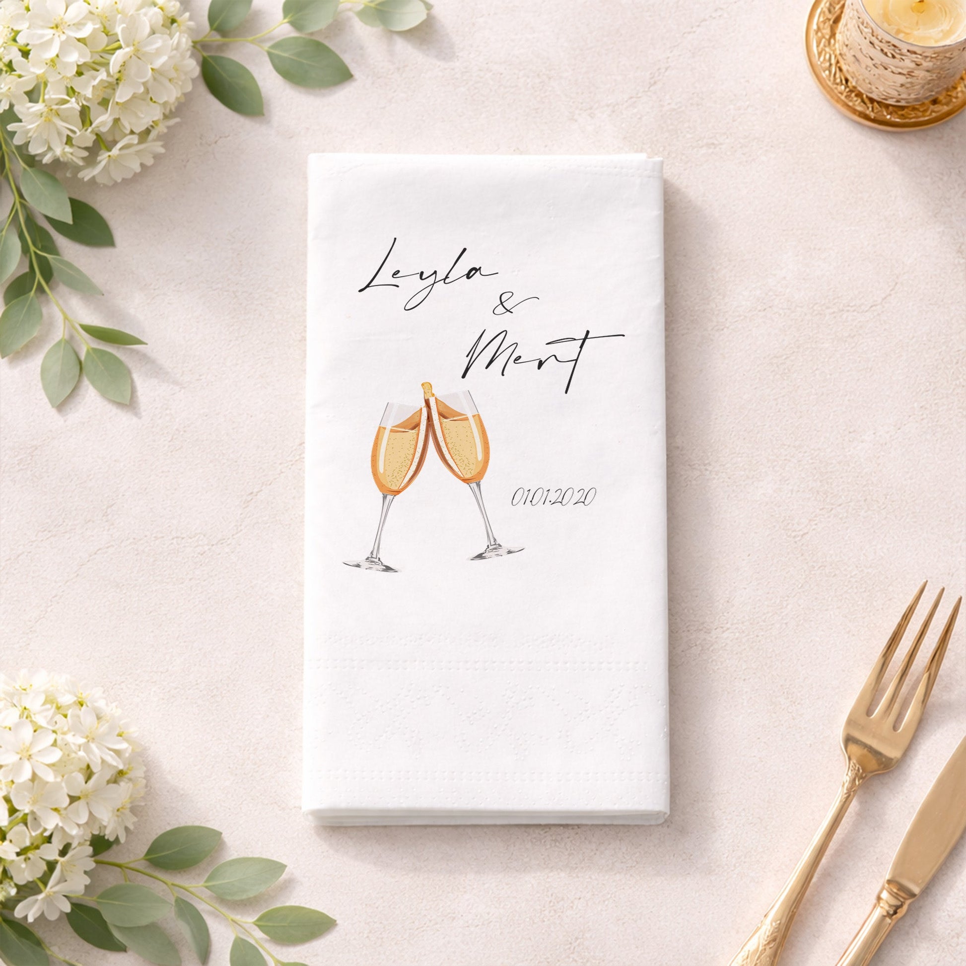 Leyla ve Mert çiftinin özel günlerini kutlamak için tasarlanan bu siyah peçete, tokuşturulan şampanya kadehleri görseliyle neşe ve kutlama ruhunu yansıtır. Altın sarısı baloncuk detayları ve zarif el yazısı fontuyla hazırlanan tasarım, düğün ve nişan partilerinizde harika bir aksesuardır. "01.01.2020" gibi önemli bir tarihle özelleştirilen bu baskılı peçete, davetinizdeki coşkuyu masalara taşır. Siyahın şıklığı ile kadehlerin ışıltısı mükemmel bir kontrast oluştururken, yüksek kaliteli baskı tekniği tasarımı canlı tutar. Organizasyon peçetesi olarak tercih edebileceğiniz bu ürün, hem görsel bir şölen sunar hem de kaliteli dokusuyla misafirlerinize konfor sağlar. Mutluluğa kaldırılan kadehlerin simgesi olan bu tasarım, en güzel anlarınızın şık bir eşlikçisidir.
