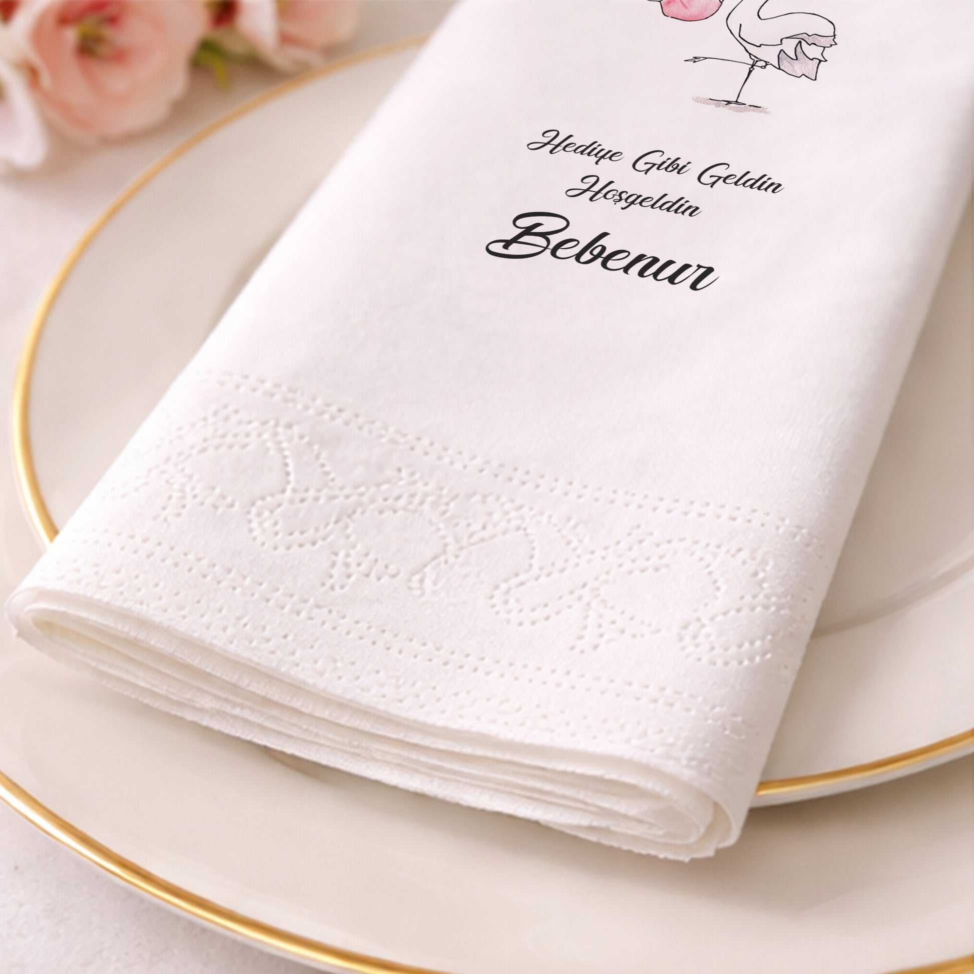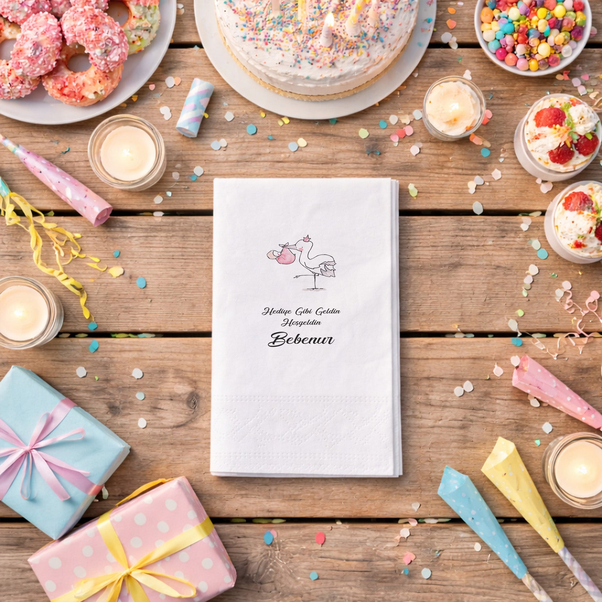 Geleneksel leylek figürünün modern çizgilerle birleştiği bu tasarım, "Hediye Gibi Geldin" sloganıyla duygusal bir karşılama sunuyor. Pembe detayları ve siyah şık zeminiyle kontrast oluşturan peçeteler, kız bebek kutlamalarında zarafeti ön plana çıkarır. Baby shower, yenidoğan mevlidi veya ilk yaş günü etkinliklerinde masalarınızın baş köşesinde yer alacak bu ürün, kaliteli baskı teknolojisi ile üretilmiştir. Bebenur ismiyle kişiselleştirilen tasarım, ailenize katılan minik mucizenin ilk büyük organizasyonunda fark yaratmanızı sağlar. Yumuşak dokusu misafirleriniz için konforlu bir kullanım sağlarken, estetik görünümü fotoğraflarınızda harika bir detay olarak kalacaktır. Sevdiklerinizle paylaştığınız bu anlamlı günü taçlandırmak için en ideal seçimlerden biri olan leylek temalı peçetelerle sunumunuzu tamamlayın.