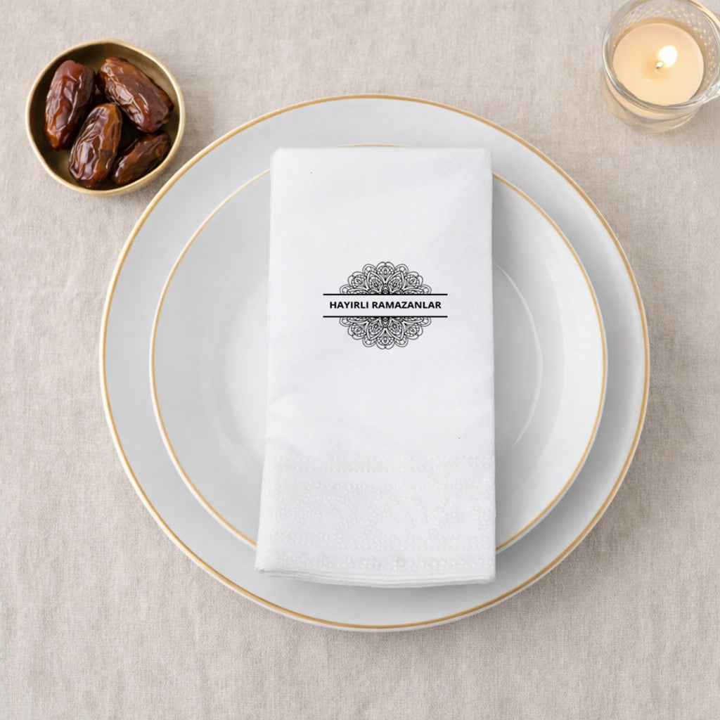 Ramazan sofralarına denge, huzur ve zarafet katmak için tasarlanan Ramazan Desenli Baskılı Peçete, ince mandala/rozet motifi ve “Hayırlı Ramazanlar” mesajıyla sade ama etkileyici bir görünüm sunar.