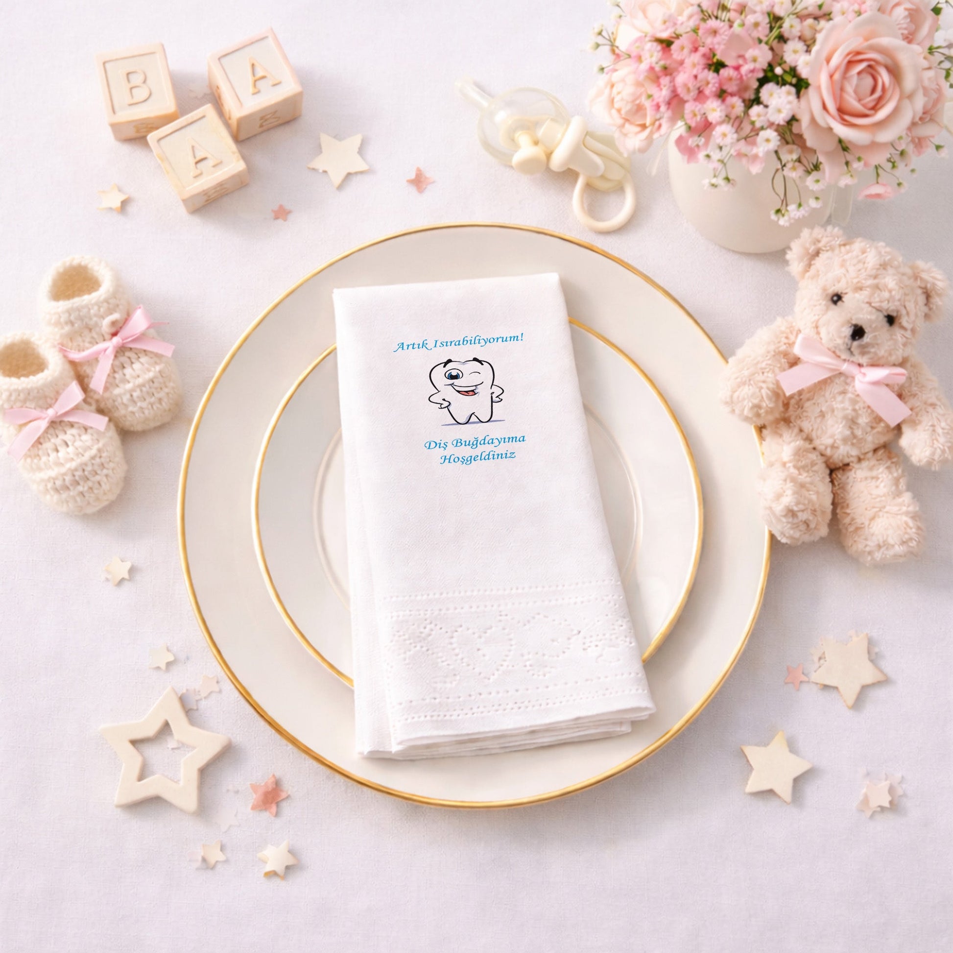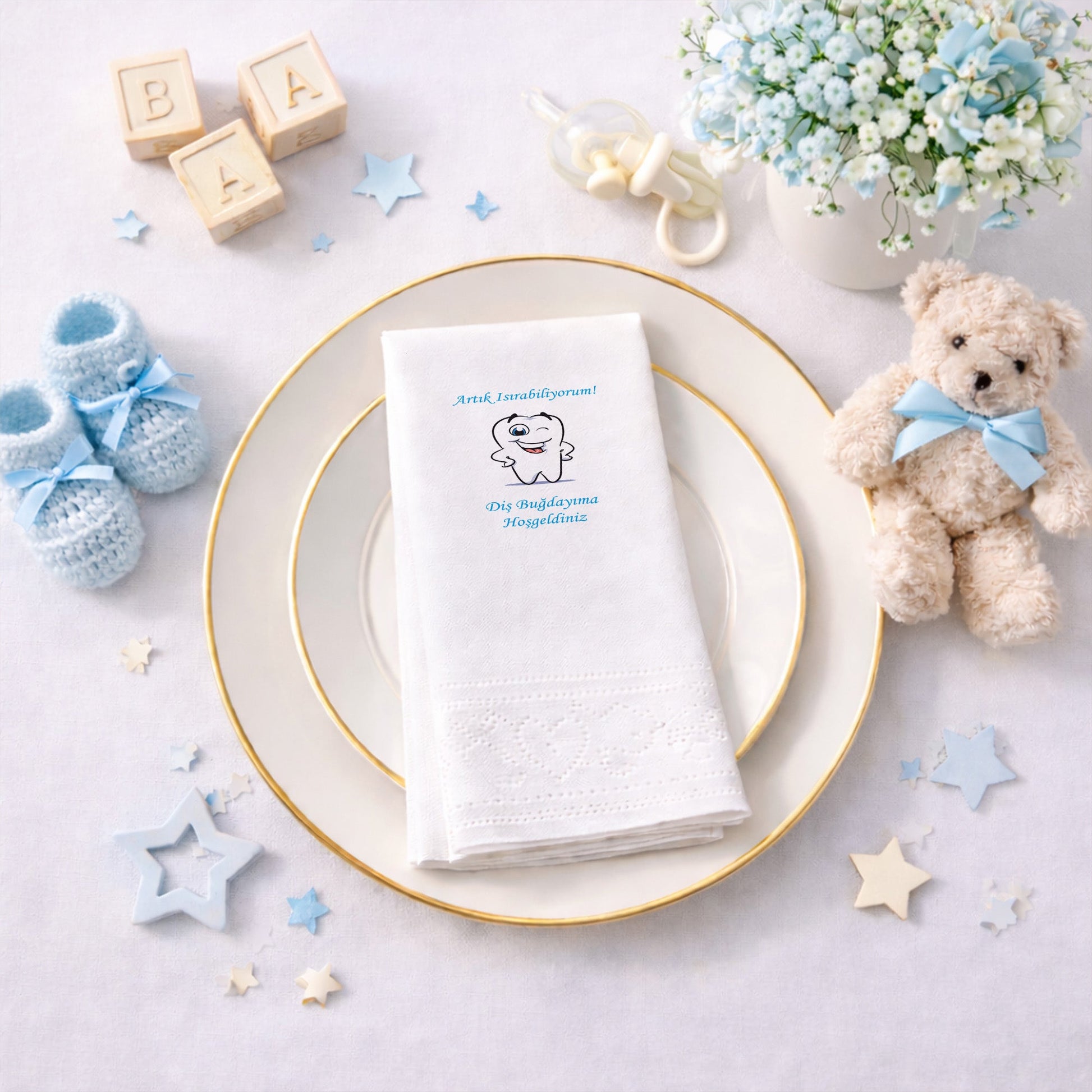 Diş buğdayı geleneğinizi modern ve eğlenceli bir dokunuşla kutlamak için tasarlanan bu özel peçeteler, mavi tonlarındaki "Artık Isırabiliyorum" sloganıyla sofralarınıza neşe katıyor. Sevimli diş karakteri ve kaliteli baskı detayları, bebeğinizin ilk diş heyecanını misafirlerinizle paylaşırken şık bir sunum yapmanızı sağlar. Emici dokusu ve dayanıklı yapısı sayesinde hem dekoratif hem de işlevsel bir kullanım sunar. Baby shower veya mevlit organizasyonlarında konsepti tamamlayan bu ürün, fotoğraf karelerinde harika bir detay olarak yer alacaktır. Hijyenik koşullarda üretilen peçetelerimiz, bebek sağlığına uygun boyalar kullanılarak hazırlanmıştır. Unutulmaz anılarınıza eşlik edecek bu tasarım, kutlama masanızın en dikkat çekici parçası olmaya adaydır.
