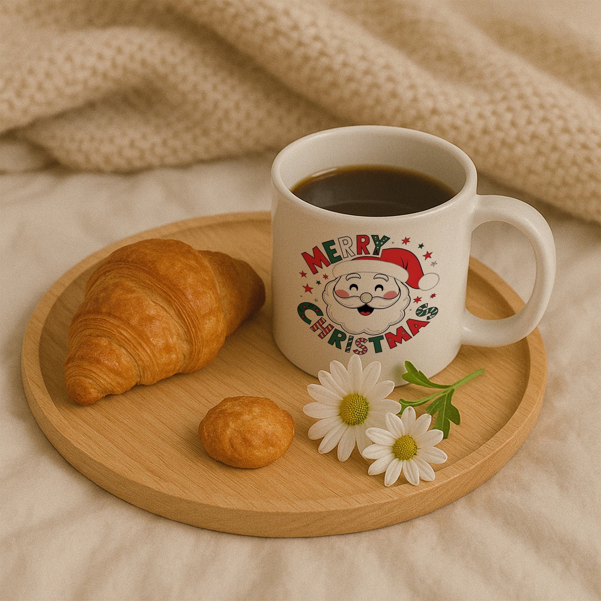 Gülümseyen Noel Baba illüstrasyonu ve renkli tipografiyle tasarlanmış, klasik yılbaşı ruhunu modern bir tarzla yansıtan özel kupa.