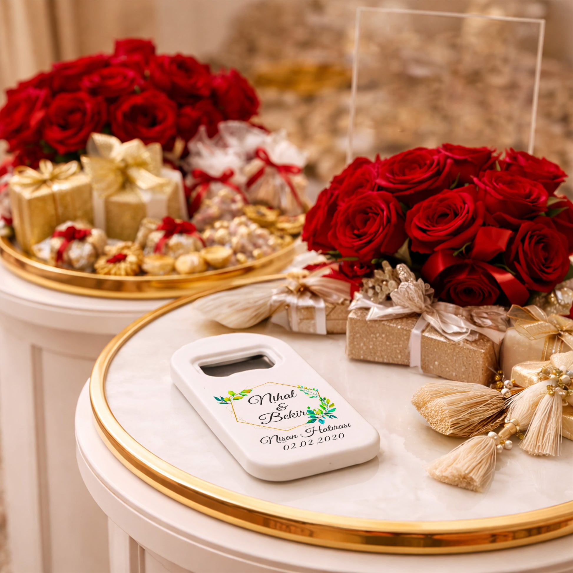 Doğal ve zarif detayları seven çiftler için tasarlanan bu minimal yaprak temalı magnet açacak, altın çerçeve ve yeşil yaprak dokunuşları ile modern ve şık bir görünüm sunar. Sade tasarımı sayesinde her düğün ve nişan konseptiyle uyum sağlar.
