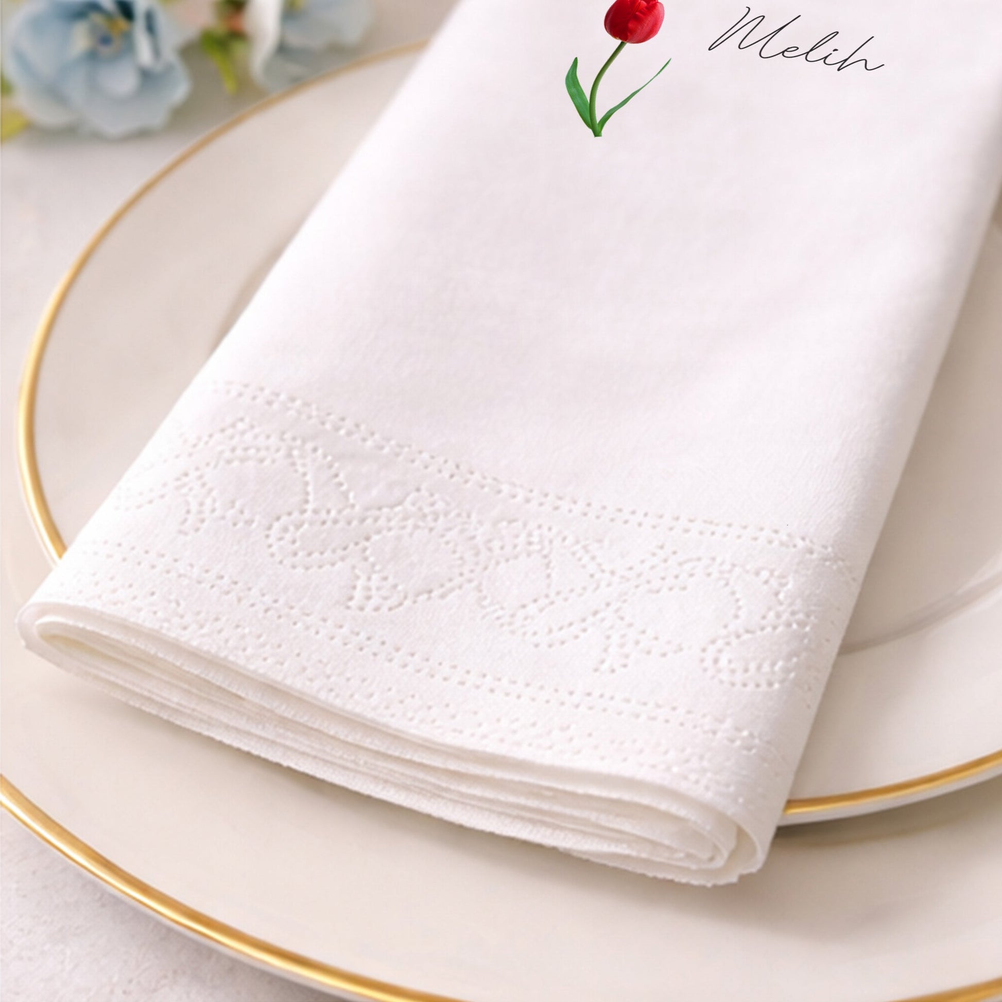 Minimalist ve modern bir tasarım anlayışıyla hazırlanan bu nişan peçetesi, siyah zemin üzerindeki asil kırmızı lale figürüyle dikkat çeker. Modern kaligrafi ile yazılan isimler, masanıza kişisel bir imza atmanızı sağlar. Nişan, söz veya akşam yemeği organizasyonlarınızda kontrastın gücünü kullanarak sofistike bir atmosfer yaratabilirsiniz. Yumuşak dokusu ve yüksek emiciliği ile hem estetik hem de işlevsel bir üründür. Özel günlerinizde konuklarınıza sunacağınız bu şık detay, organizasyonunuzun kalitesini yansıtır. Her bir baskı, netlik ve renk doygunluğu açısından titizlikle uygulanmıştır. Lale sembolünün zarafeti ile aşkınızı masalarınıza taşıyın. Modern çiftlerin tercihi olan bu tasarım, fotoğraf karelerinde de harika birer detay olarak yer alacaktır. Şıklığı ve kaliteyi bir arada sunan bu özel parça, masalarınızın yıldızı olmaya adaydır.