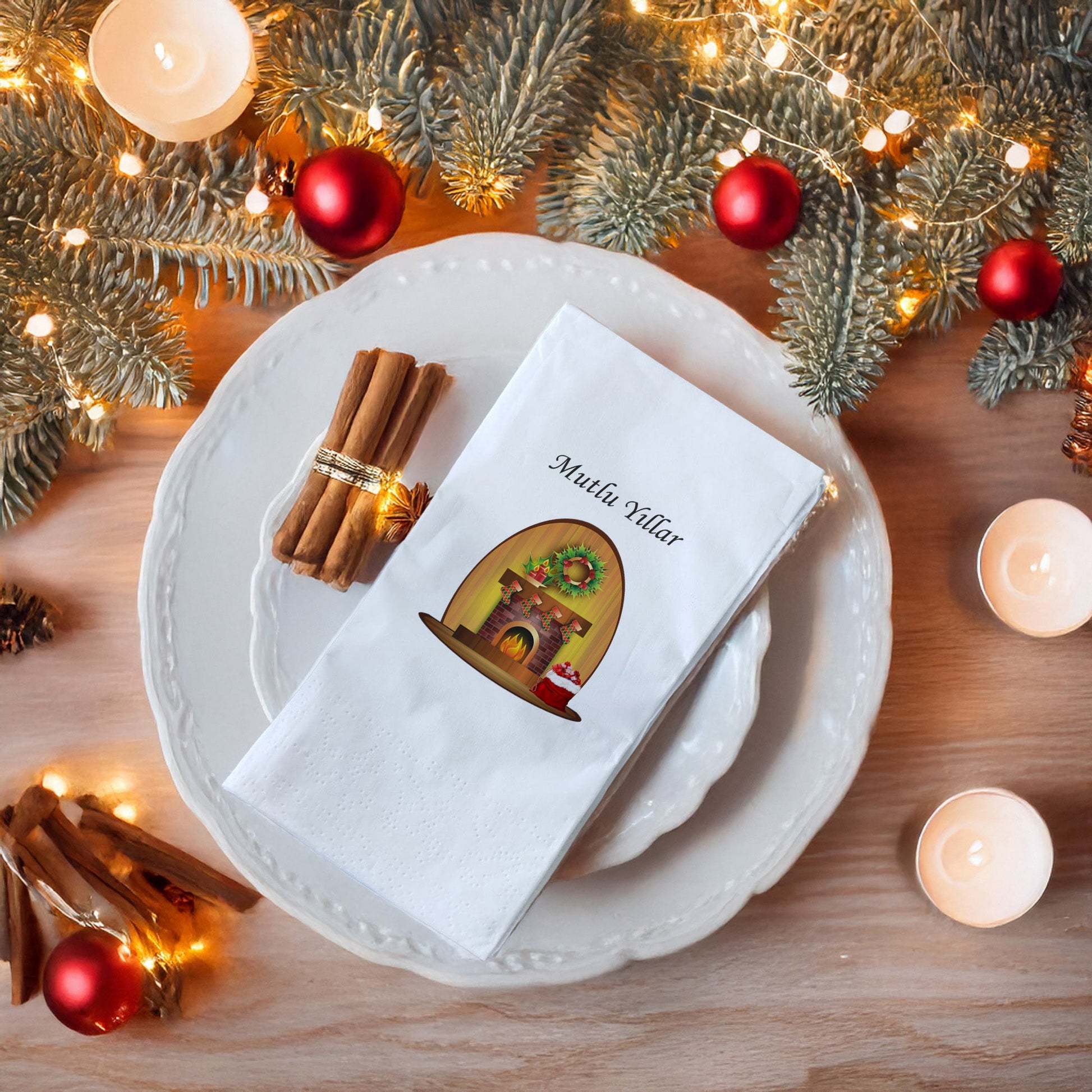 Yeni yıl sofralarınıza sıcaklık ve şıklık katacak Mutlu Yıllar Şömine Desenli Yılbaşı Peçetesi, özel tasarımıyla misafirlerinizi büyülüyor.