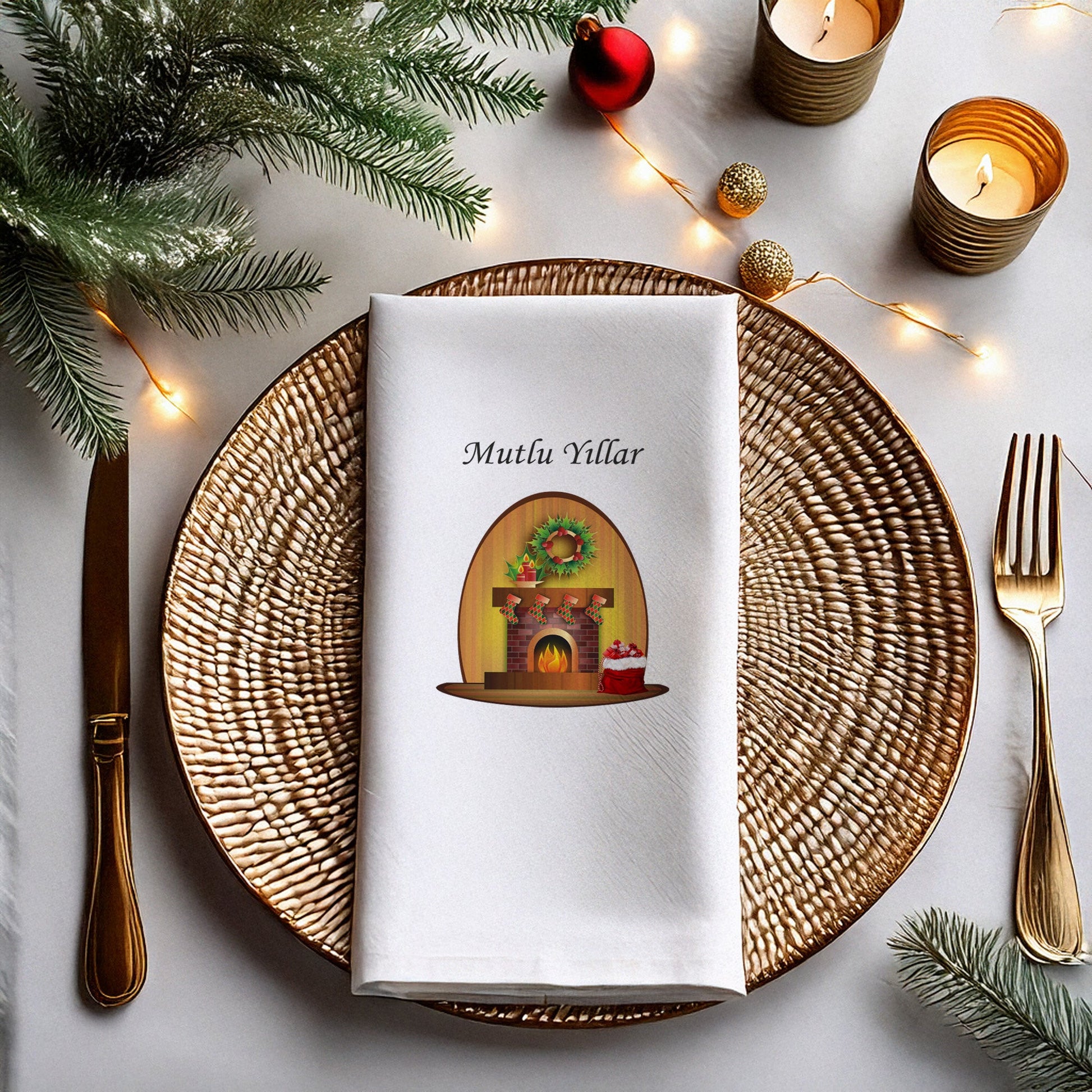 Vintage şömine illüstrasyonu, yılbaşı ruhunu zarif detaylarla buluştururken, beyaz zemin üzerindeki kaliteli baskı sofralarınıza modern bir dokunuş ekler.