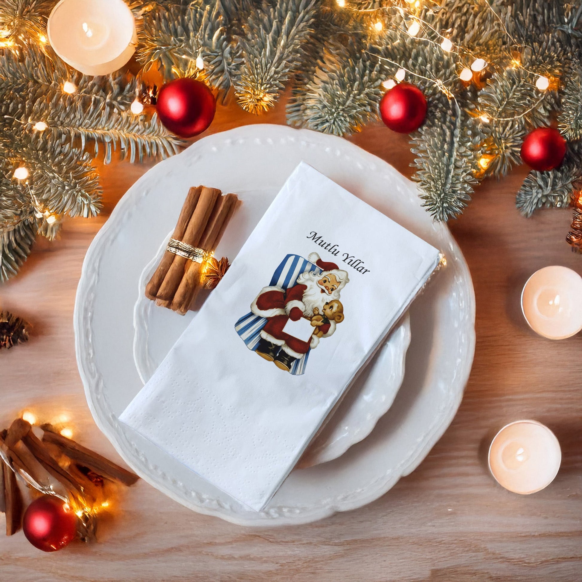 Yeni yıl sofralarında hem nostaljik hem sıcak bir atmosfer yaratmak istiyorsanız Kidzia Mutlu Yıllar Vintage Noel Baba Baskılı Peçete, 2026 koleksiyonunun en şık parçalarından biri. Antik illüstrasyon stilindeki Noel Baba ve elindeki oyuncak ayı figürü; yılbaşı ruhunu klasik, zarif ve duygusal bir şekilde sofralara taşır.