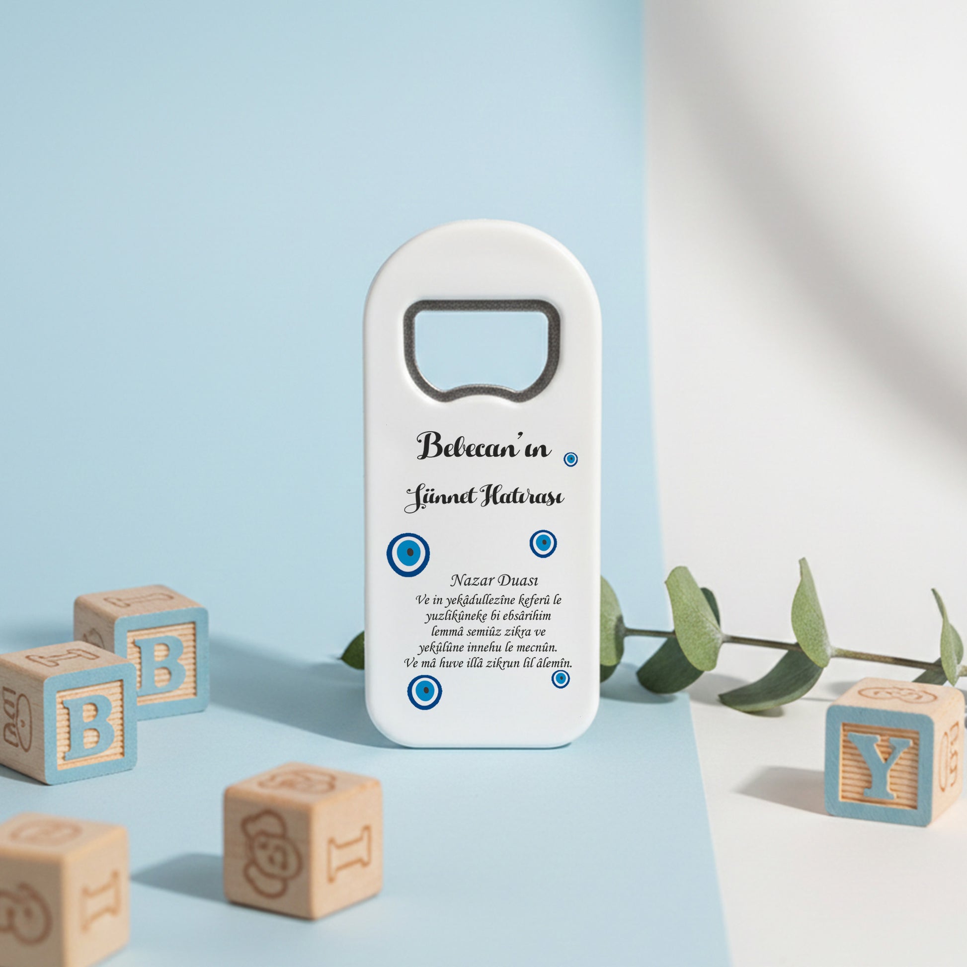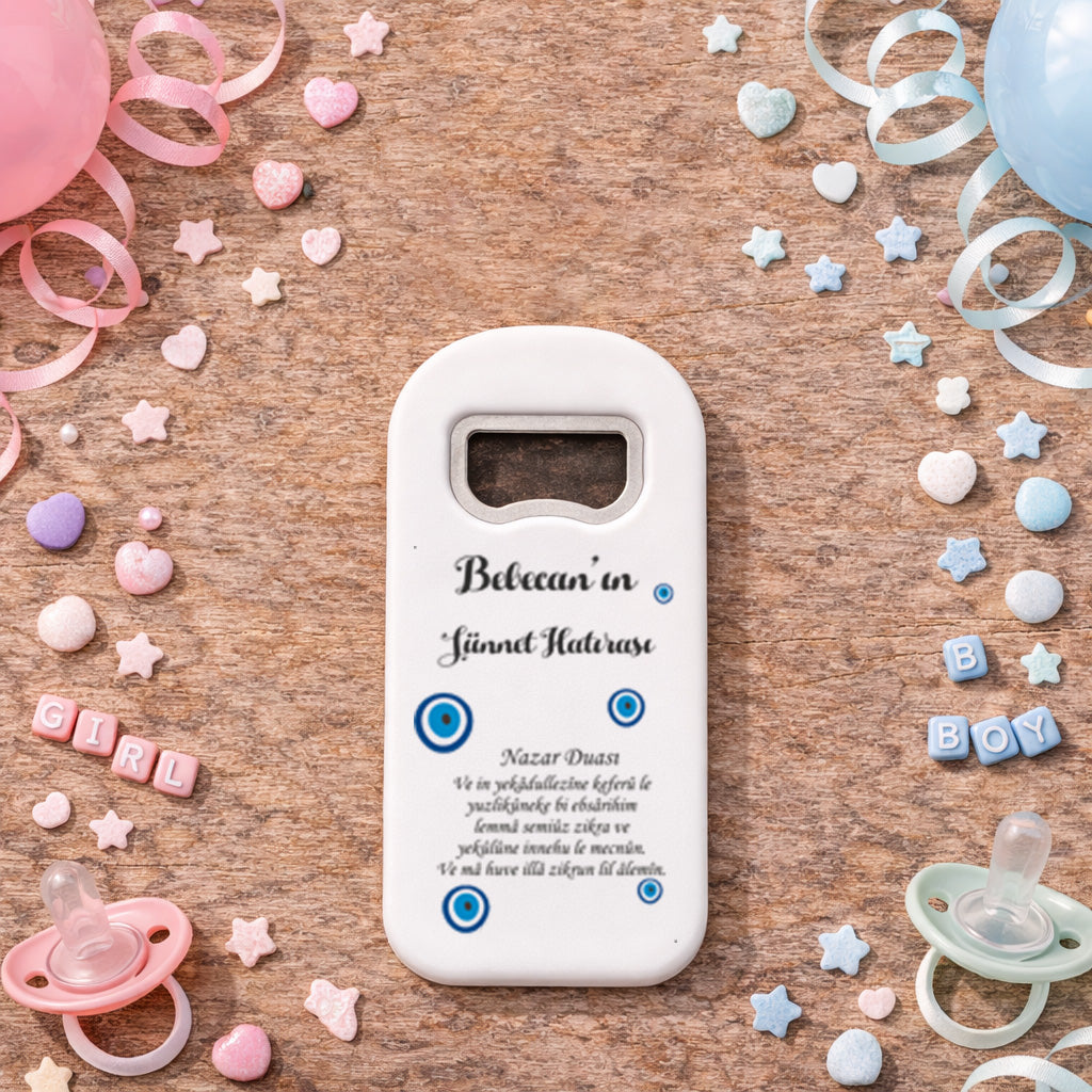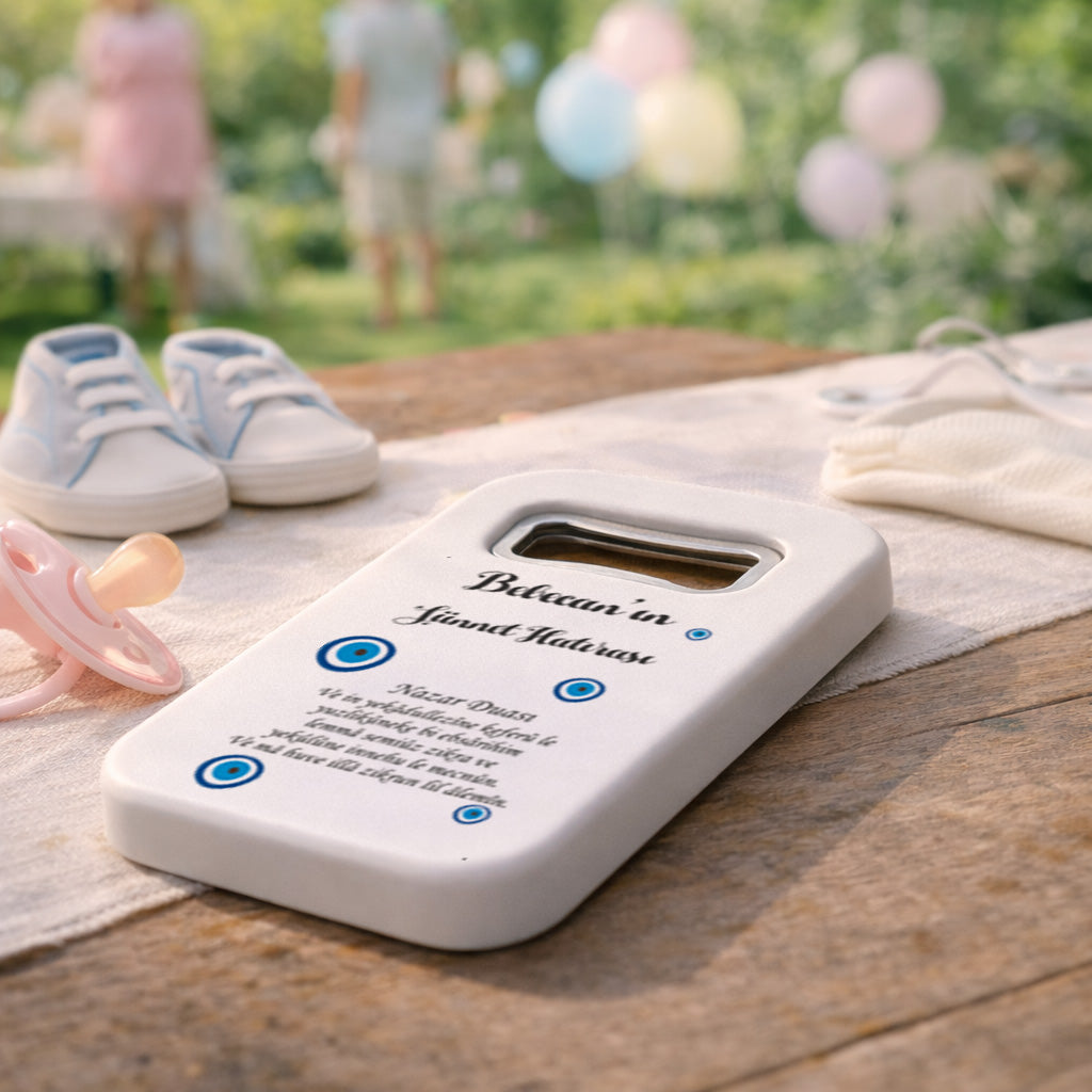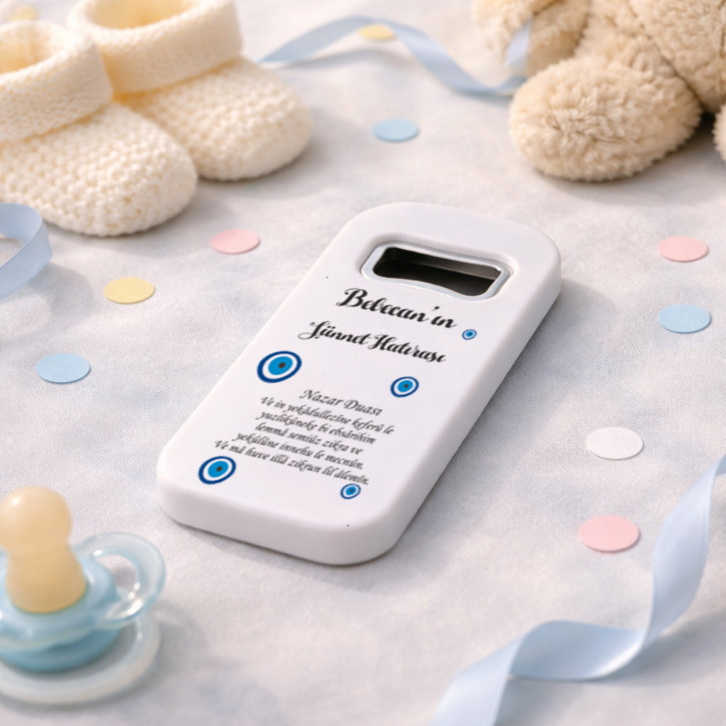 Sünnet mevlidiniz için sade, şık ve anlamlı bir hediyelik arıyorsanız, nazar boncuğu detaylı bu özel açacak magnet tam size göre 🧿