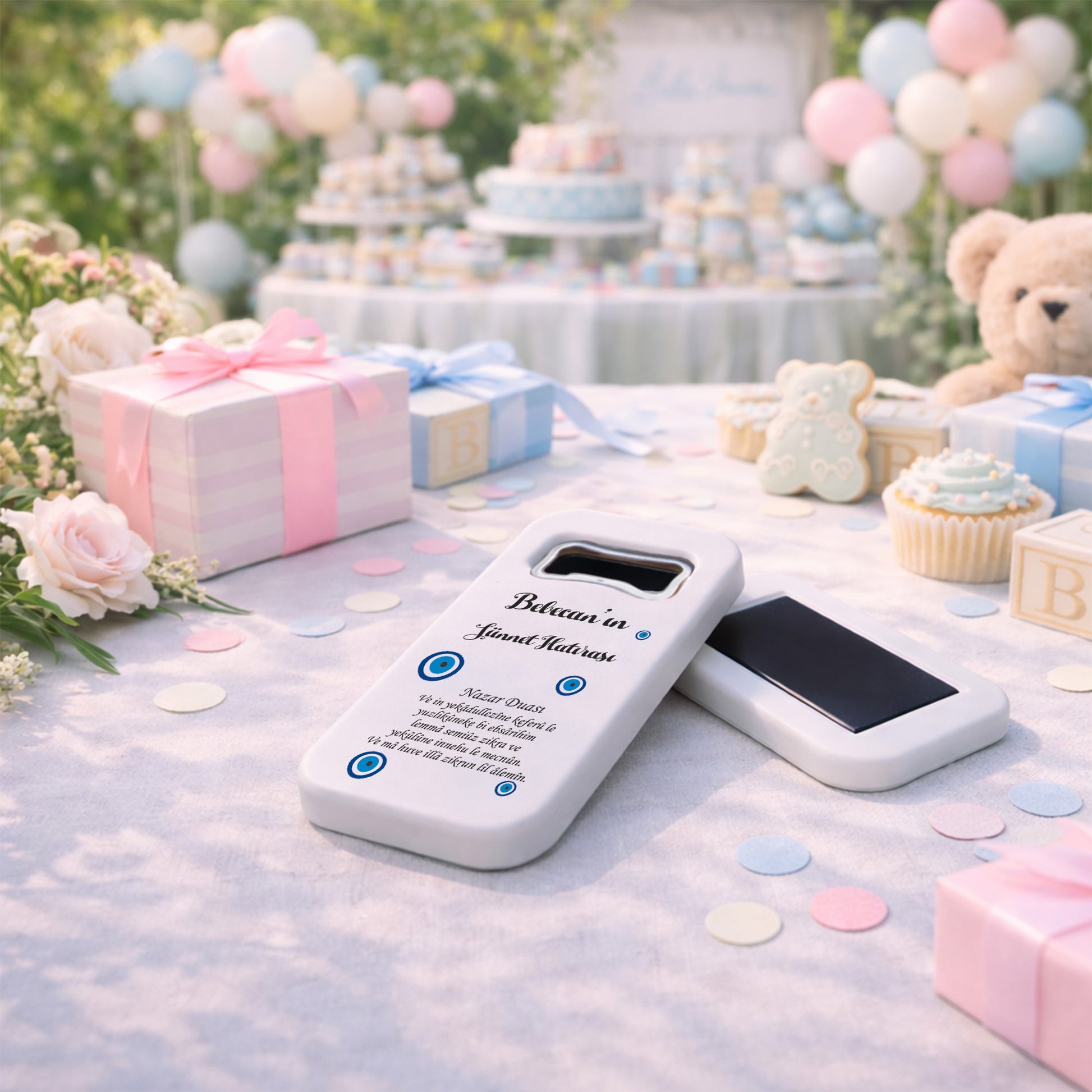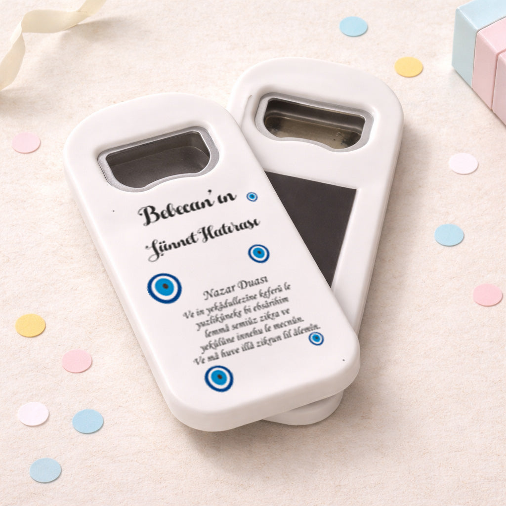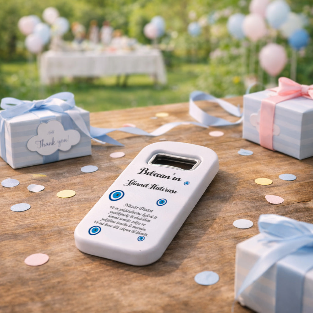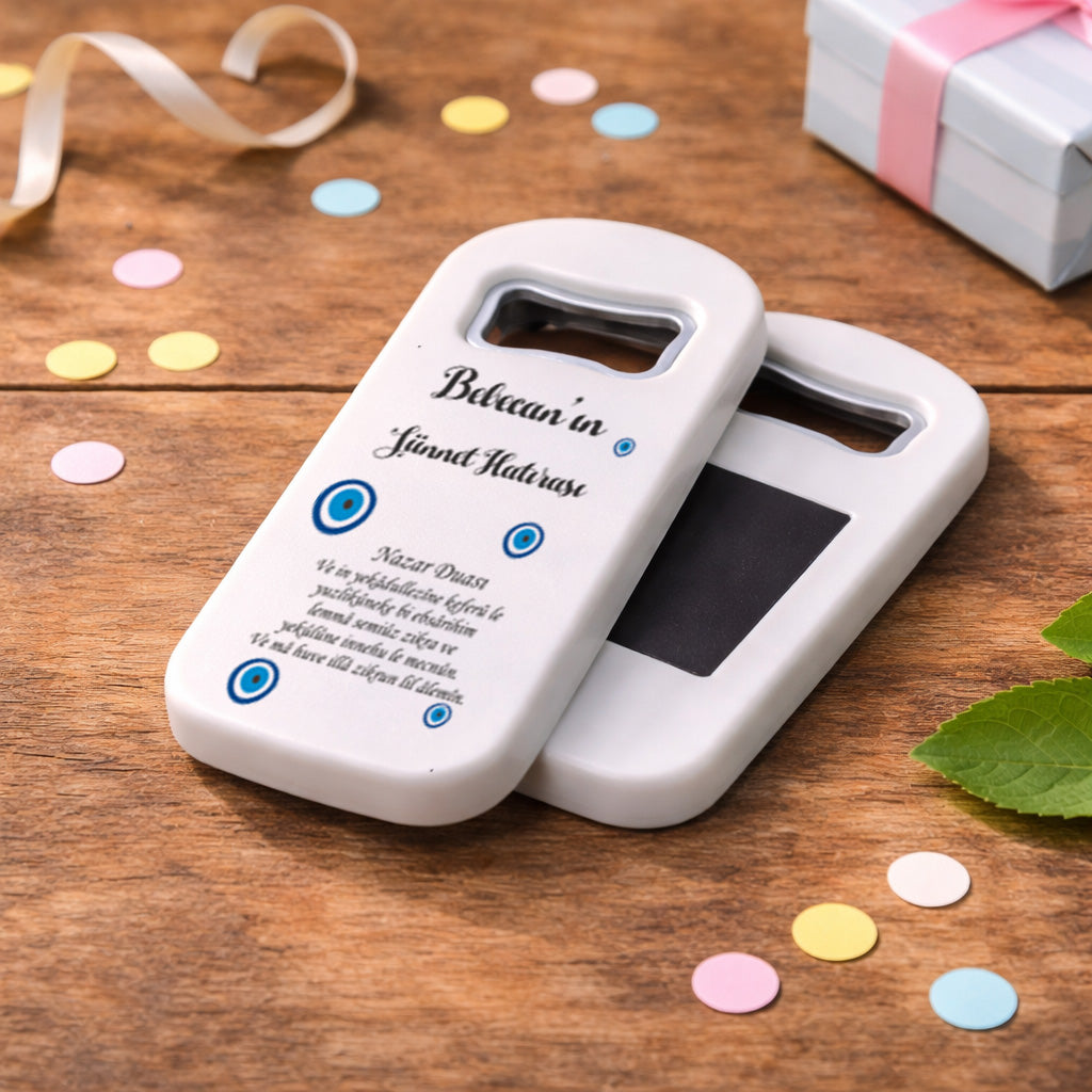 Sünnet mevlidiniz için sade, şık ve anlamlı bir hediyelik arıyorsanız, nazar boncuğu detaylı bu özel açacak magnet tam size göre 🧿