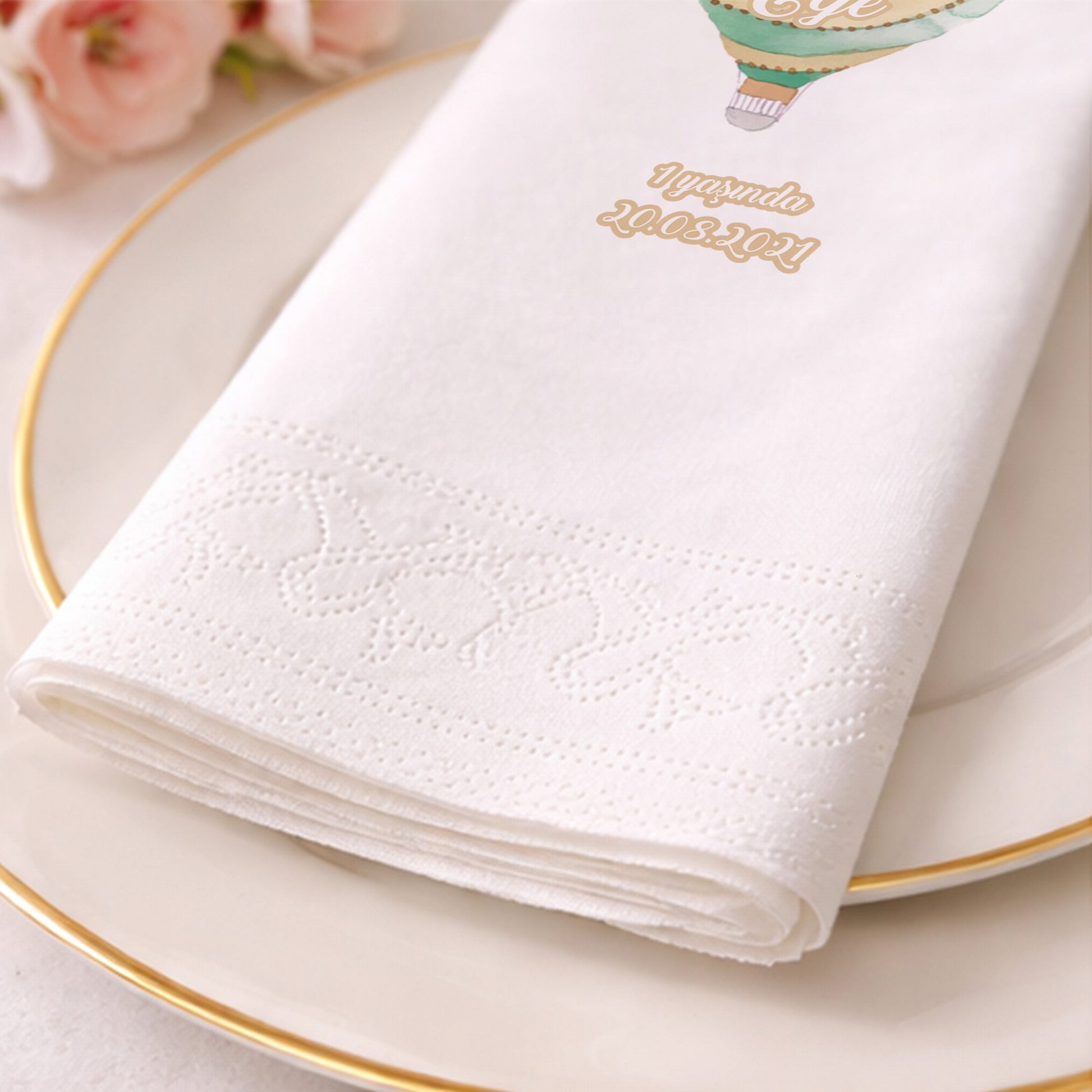 Bohem tarzın esintilerini taşıyan pastel yeşil ve bej tonlarındaki bu sıcak hava balonu tasarımı, Kaan Ege’nin kutlamasına doğal bir zarafet getiriyor. Suluboya tekniğiyle işlenen yumuşak hatlar ve boncuk dizimi detayları, klasik balon tasarımlarından ayrılan özgün bir stil sunar. Doğaya dönüş temasını benimseyen veya soft renk paletlerini seven ebeveynler için harika bir seçim olan bu peçete, sofrada sofistike bir görünüm yaratır. Kaliteli kağıt hamurundan üretilen yapısı sayesinde oldukça yumuşak ve emicidir. Kişiye özel tarih ve isim baskısı ile zenginleştirilen bu ürün, konuklarınızın hafızasında yer edecek şık bir detaydır. Diş buğdayından doğum gününe kadar tüm özel anlarınızda bu dingin tasarımı güvenle kullanabilirsiniz.