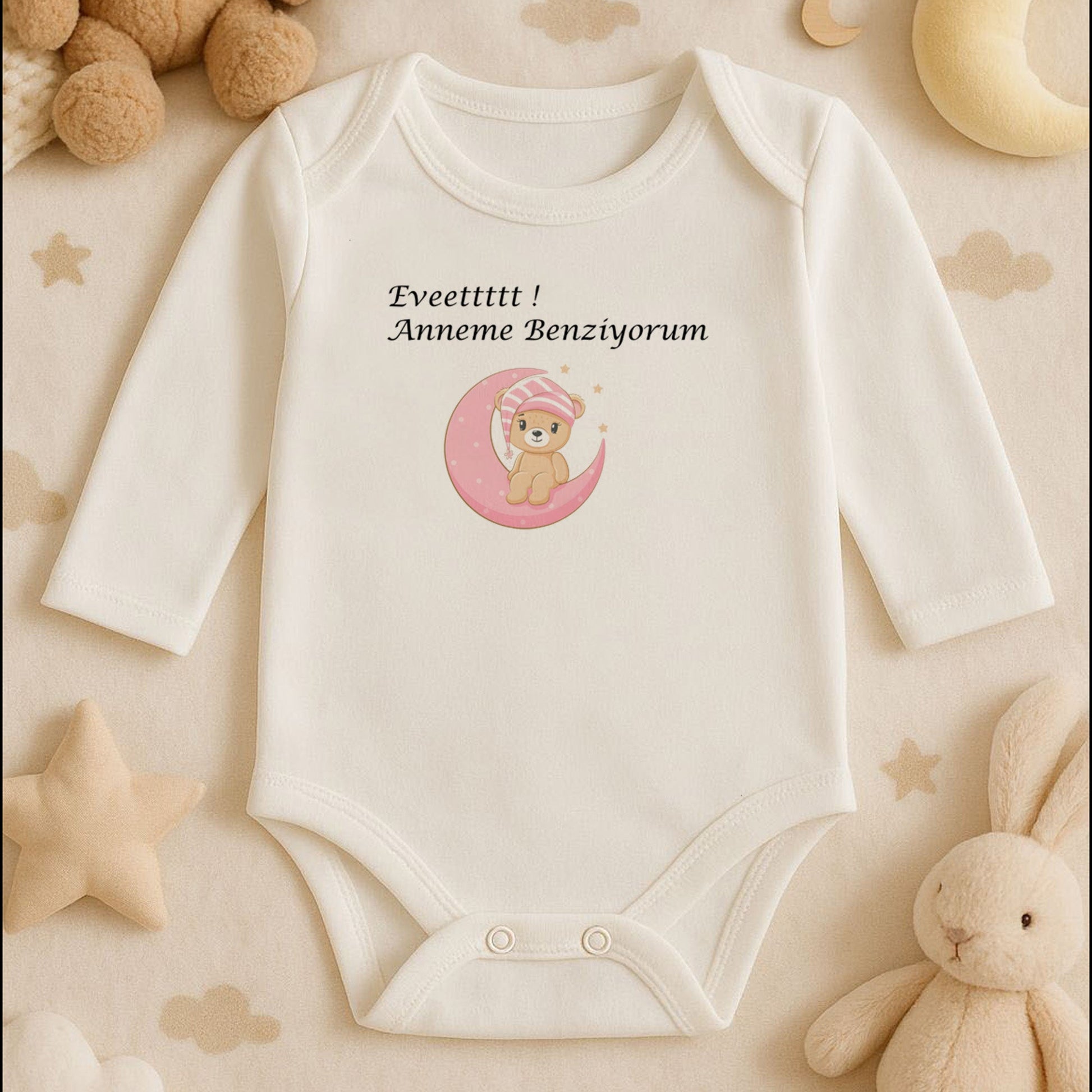 Miniklerin uyku masallarından fırlamış gibi görünen bu sevimli tasarım, pembe ay üzerinde oturan tatlı bir ayıcık figürü ile şirinliği zirveye taşıyor! 🌙🐻✨