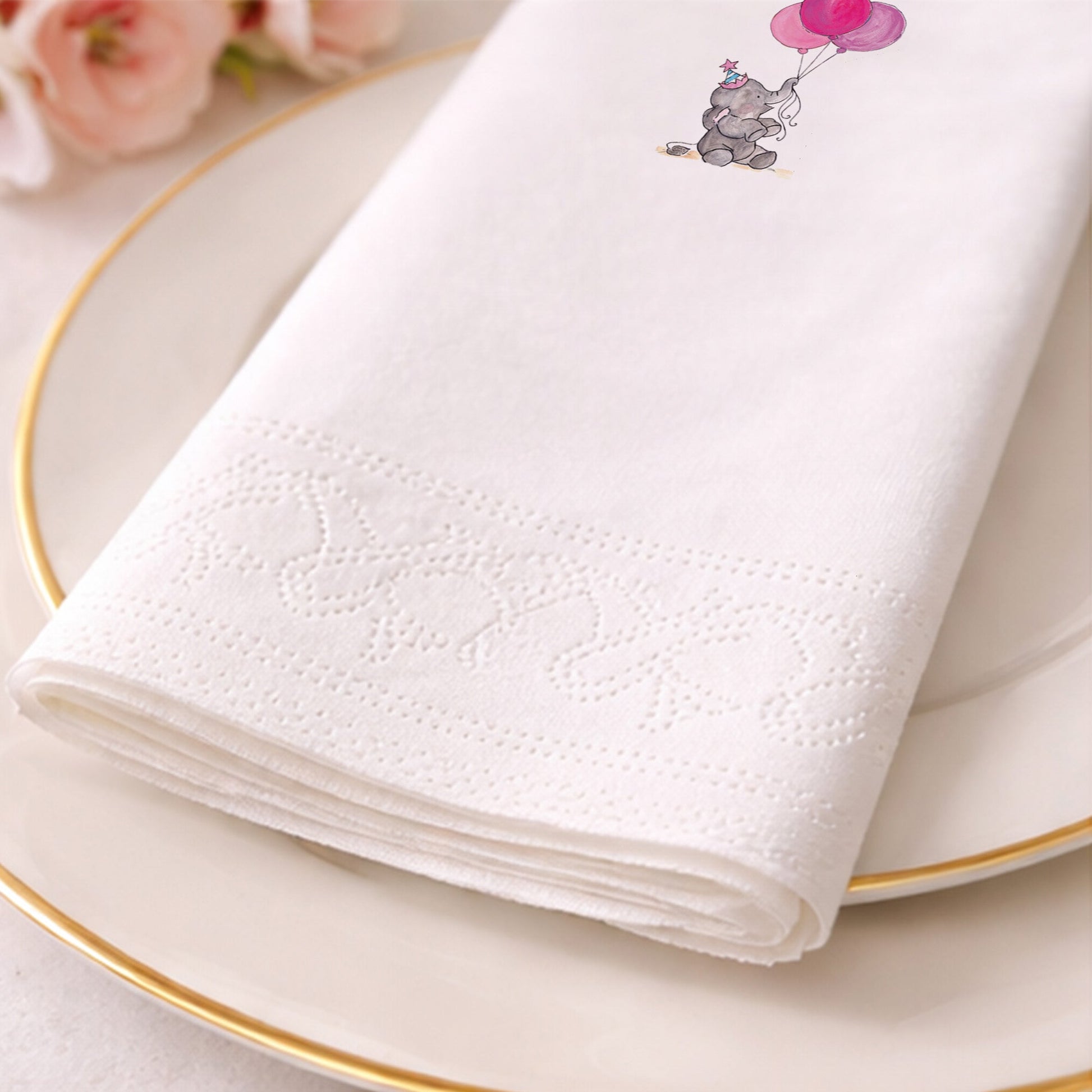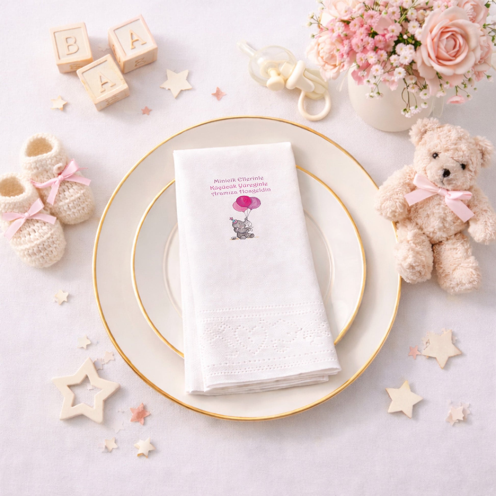 Bebeğinizin dünyaya gelişini kutlarken kullanabileceğiniz bu zarif peçete, pembe balonlar taşıyan sevimli bir fil illüstrasyonu ile süslenmiştir. Üzerindeki anlamlı şiirsel yazı, misafirlerinize duygusal ve sıcak bir karşılama sunmanıza yardımcı olur. Hastane odası süslemesi, baby shower veya ilk gün kutlamaları için ideal olan bu tasarım, yumuşak pembe tonlarıyla huzurlu bir ambiyans oluşturur. Yüksek emiciliğe sahip kağıt kalitesi, sunumlarınızda şıklıktan ödün vermeden kullanım kolaylığı sağlar. Estetik fontu ve kaliteli dijital baskısı ile masanızda görsel bir şölen yaratır. Bebek mevlidi gibi özel davetlerde küçük bir detayla büyük bir fark yaratmak isteyen ebeveynler için harika bir tercihtir.