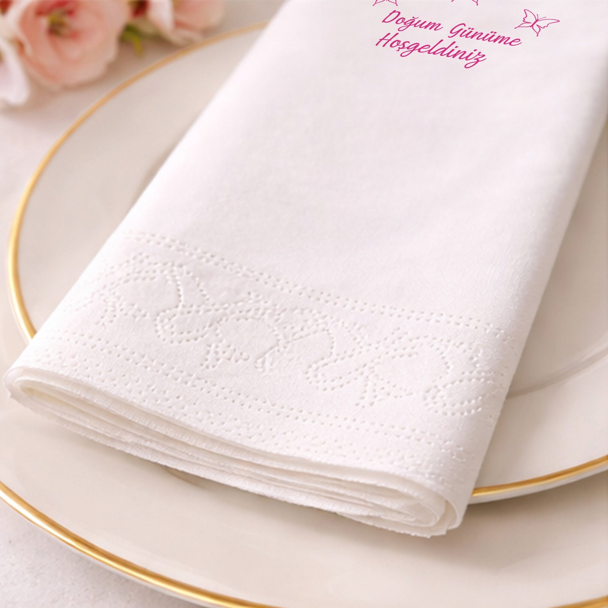 Zarif ve soft bir kutlama hayal edenler için pembe kelebek detaylarıyla süslenmiş bu peçete, şıklığın simgesidir. "Doğum Günüme Hoş Geldiniz" yazısıyla misafirlerinizi karşılayan bu tasarım, özellikle kız çocuk doğum günleri ve bahar temalı partiler için uygundur. Minimalist ama etkileyici çizgileriyle masada göz yormayan bir estetik sunar. Yumuşak dokusu ve emici yüzeyi ile pratik bir kullanım sağlar. Kelebeklerin özgür ve neşeli ruhunu sofranıza taşıyan bu ürün, pastel tonlardaki masa örtüleri ve tabaklarla harika bir kombin oluşturur. Kaliteli baskısı sayesinde renkler canlılığını korur. Özel günlerinize zarafet katmak için tasarlanmıştır.