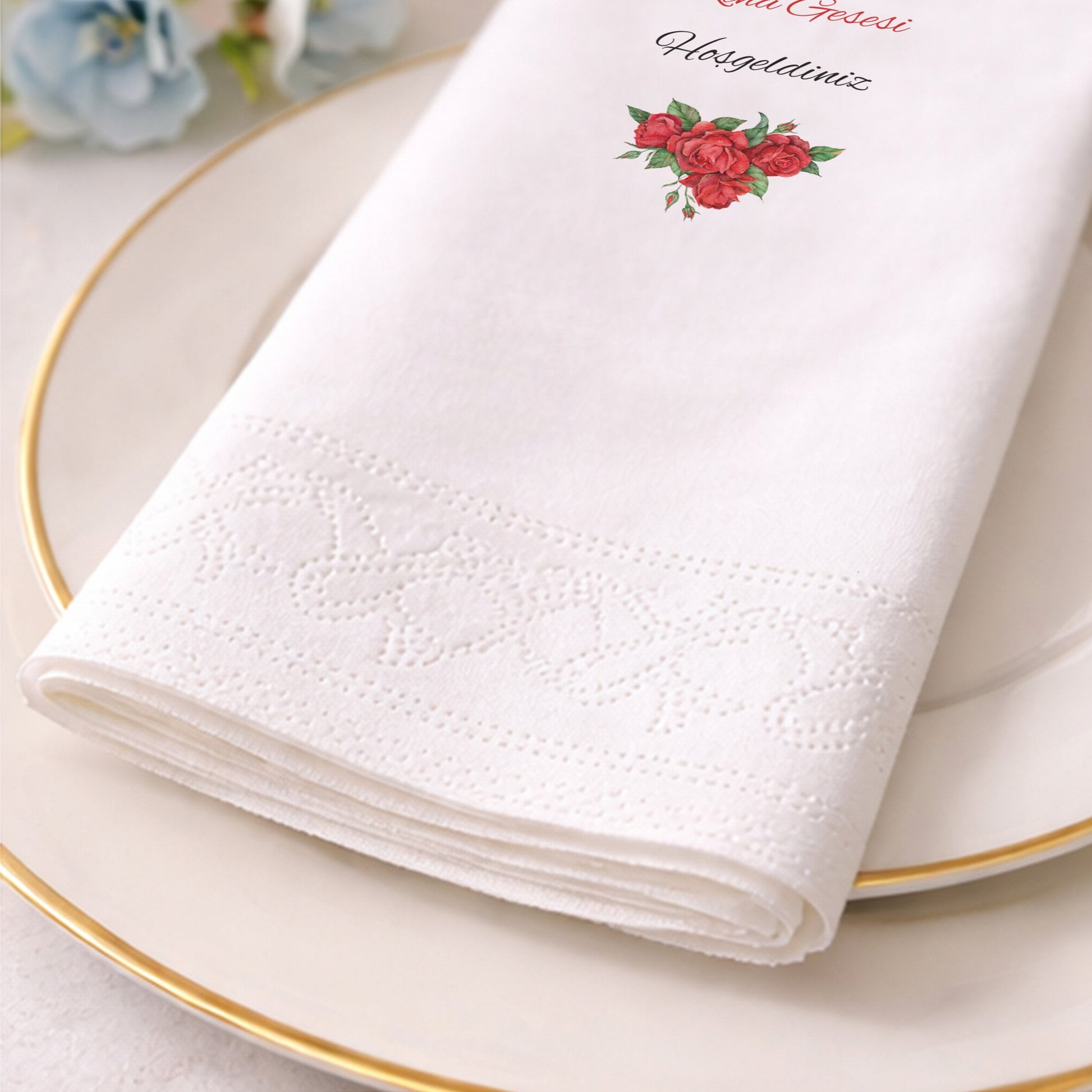 Geleneksel kına gecelerinin vazgeçilmezi olan kırmızı güller, Rabia'nın kına gecesi için özel olarak tasarlanan bu peçetelerde buluşuyor. Canlı kırmızı tonları ve romantik çiçek desenleriyle süslenen bu organizasyon peçetesi, kına masalarınıza sıcaklık ve zarafet katar. "Hoşgeldiniz" yazısı ile misafirlerinizi karşılayan bu tasarım, yüksek kaliteli baskısı ve yumuşak dokusuyla dikkat çeker. Kına gecesi konseptinizi tamamlayan bu özel ürün, estetik görünümüyle davetlilerinizin beğenisini kazanırken, gecenin ruhunu masalara taşır. Dayanıklı yapısı ve şık suluboya efektli gülleriyle her ayrıntısı düşünülmüş bir aksesuardır. Özel günlerinize anlam katan bu baskılı peçete, kına töreninizin unutulmaz detayları arasında yerini alacak. Hem şık hem de pratik bir kullanım sunan bu ürün, kaliteli sunumlar için tasarlandı.