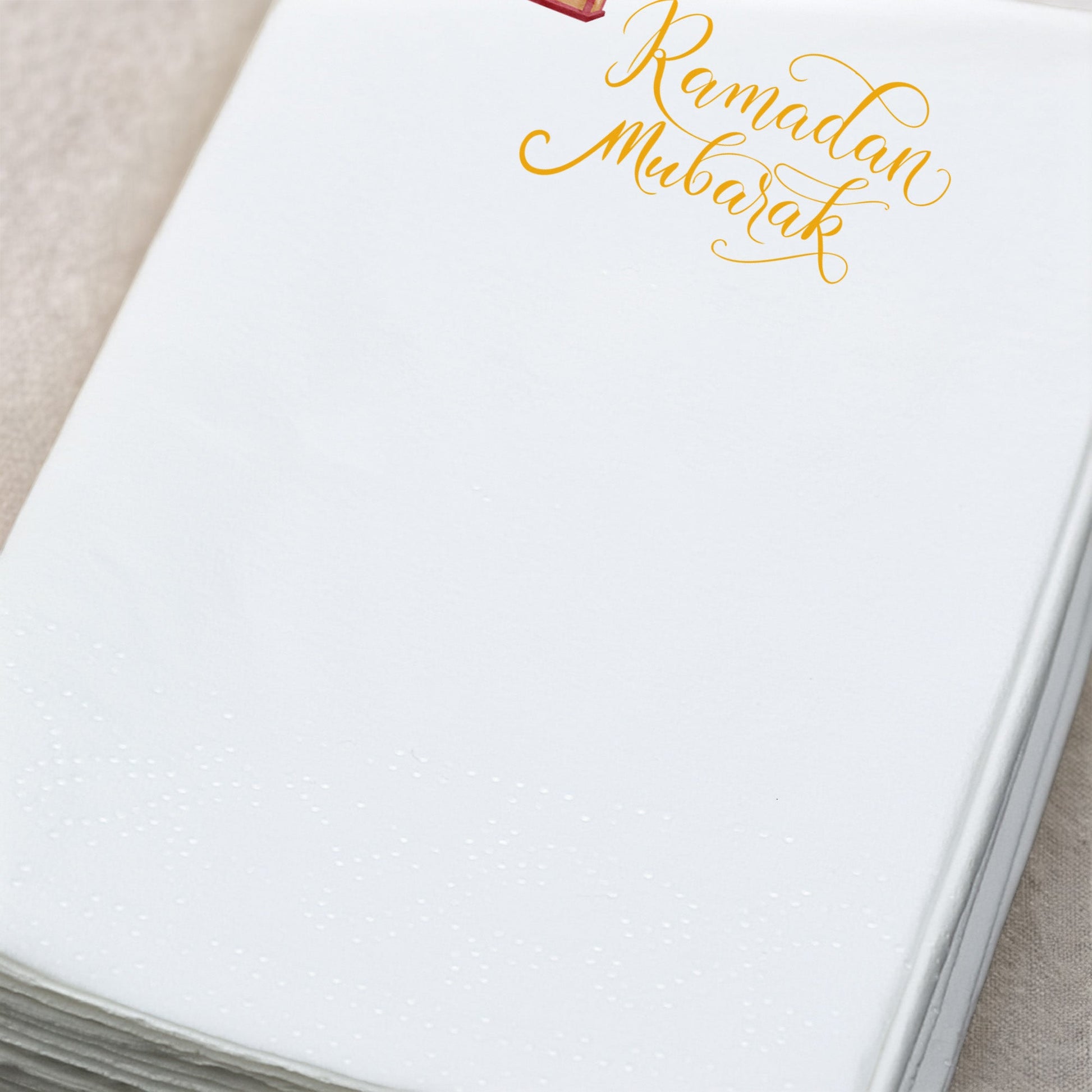 “Ramadan Mubarak” yazılı bu Ramazan Desenli Baskılı Peçete, sade ve estetik duruşuyla modern iftar sofralarına şıklık katar.