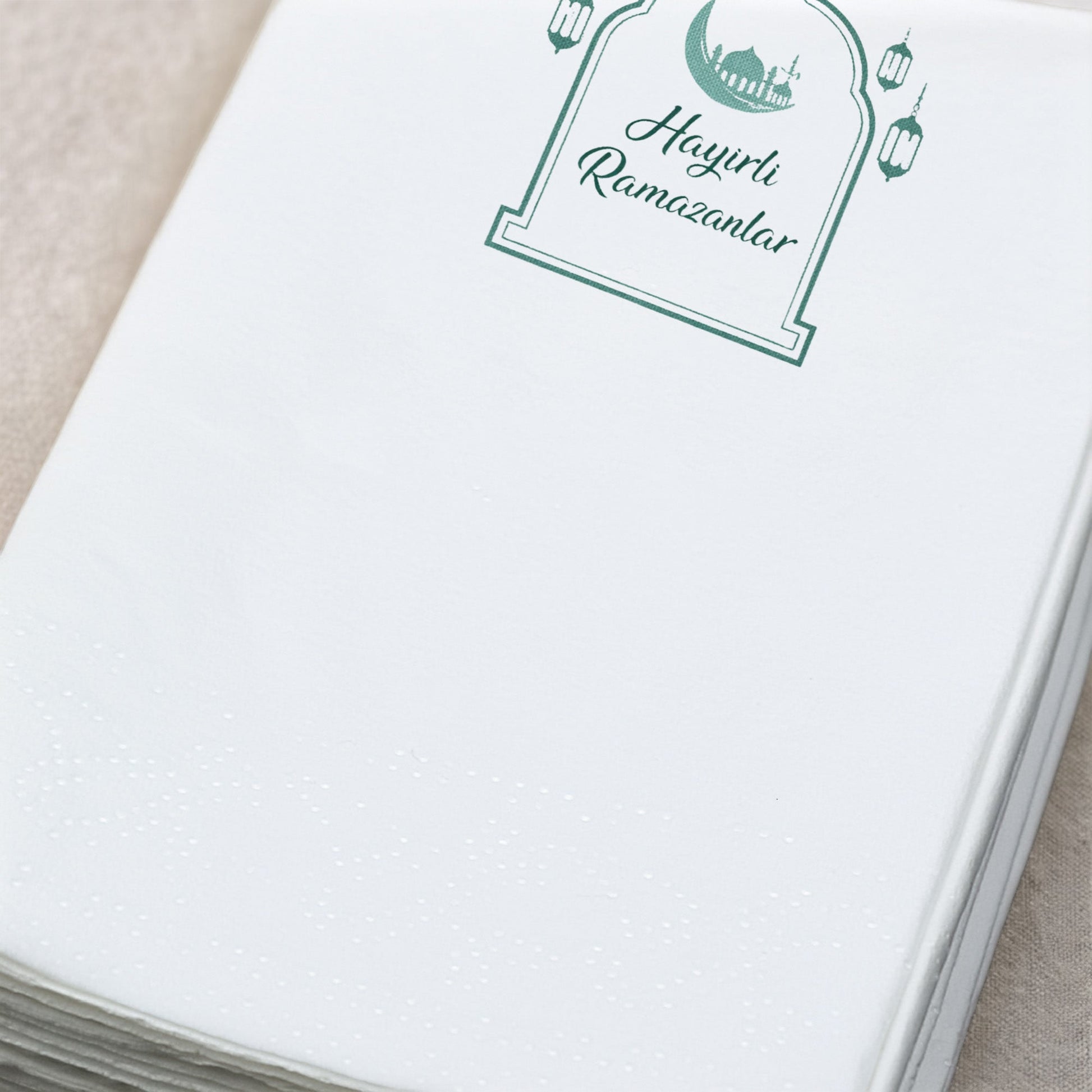 Mihrap formu içerisinde yer alan hilal, cami silüeti ve fener detaylarıyla tasarlanan bu Ramazan desenli baskılı peçete, “Hayırlı Ramazanlar” yazısıyla iftar ve sahur sofralarına manevi bir atmosfer kazandırır.