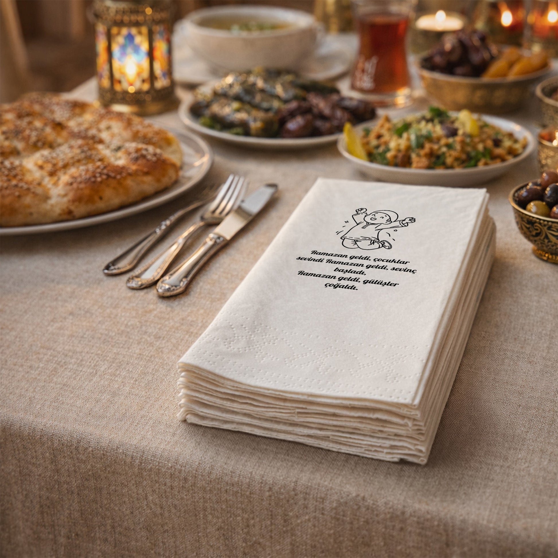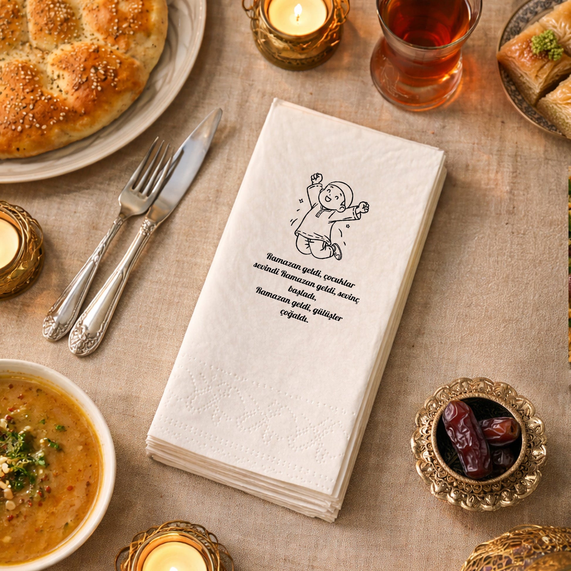 Ramazan sofralarınıza neşe ve anlam katmak için özel olarak tasarlanan Ramazan Desenli Baskılı Peçete, çocuk temalı sevimli illüstrasyonu ve duygusal Ramazan manisiyle iftar sofralarına sıcak bir dokunuş sunar.