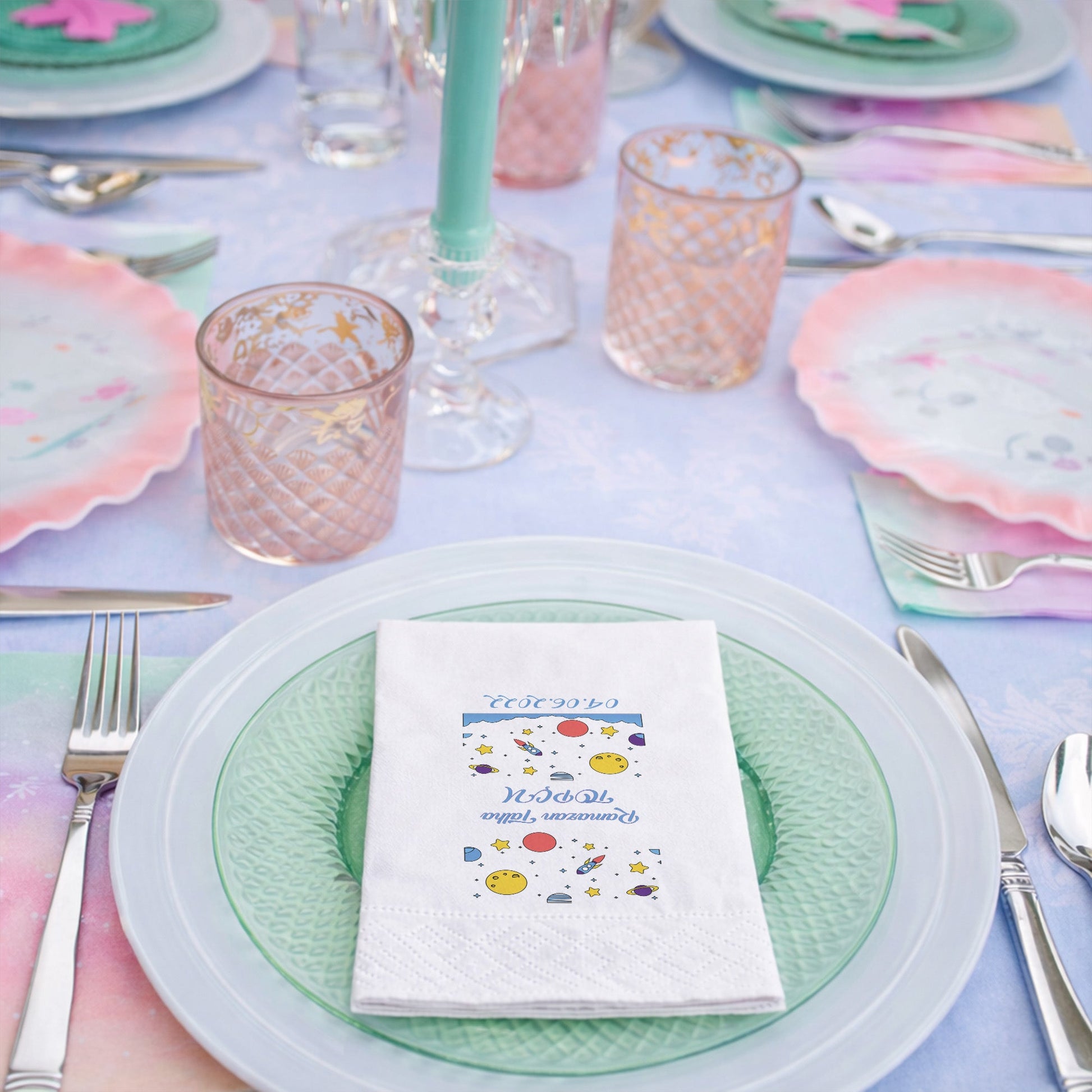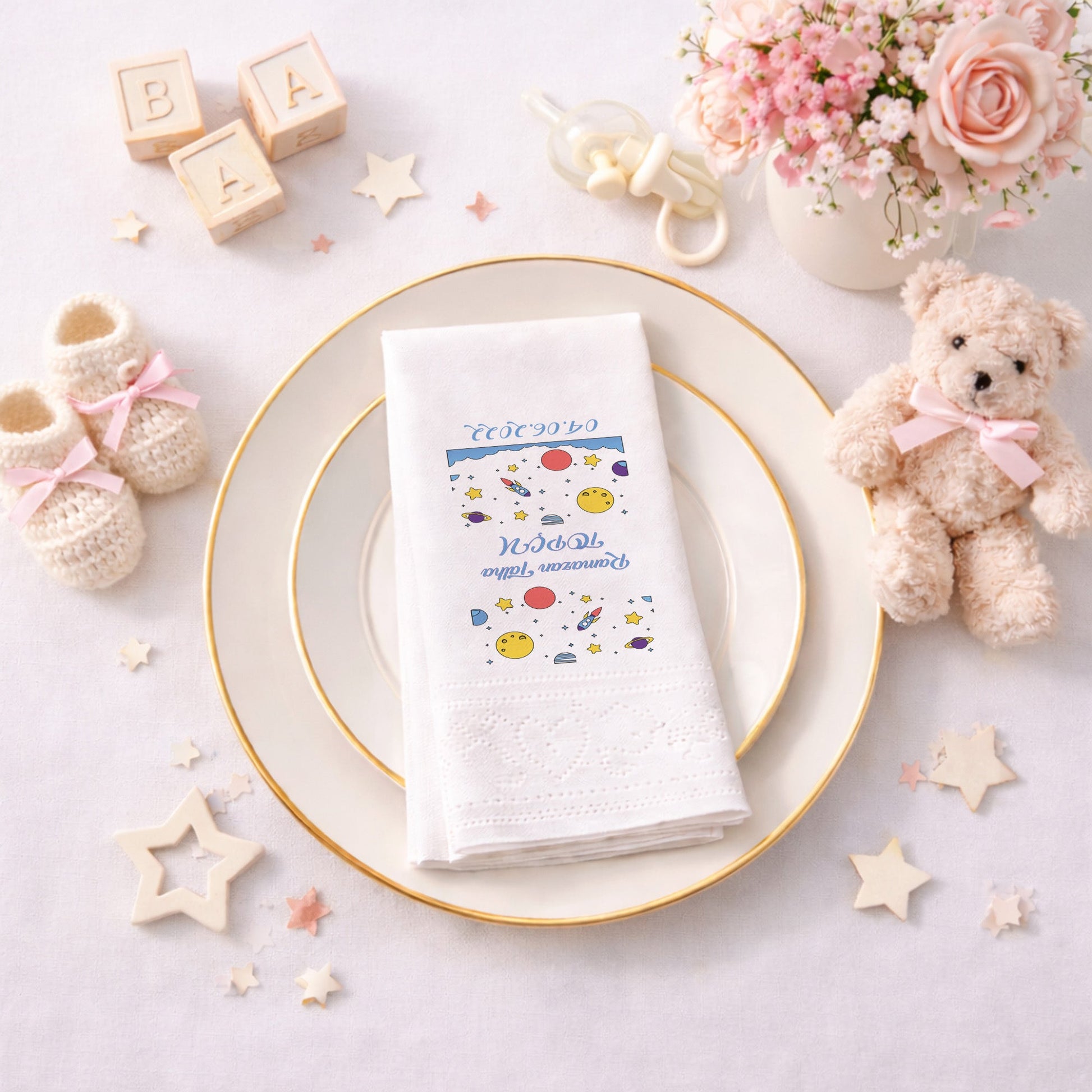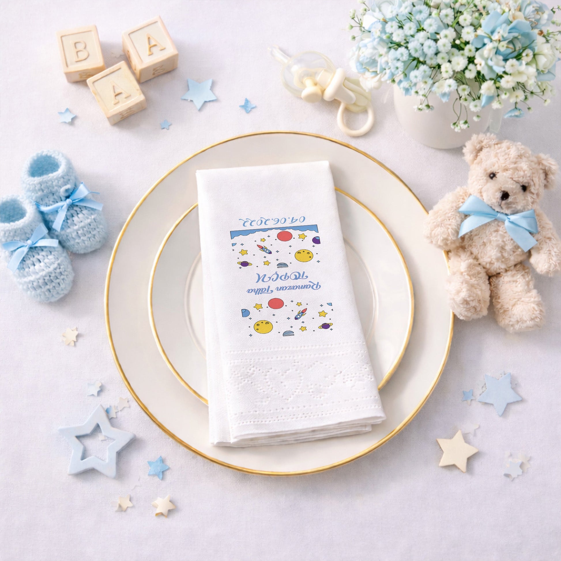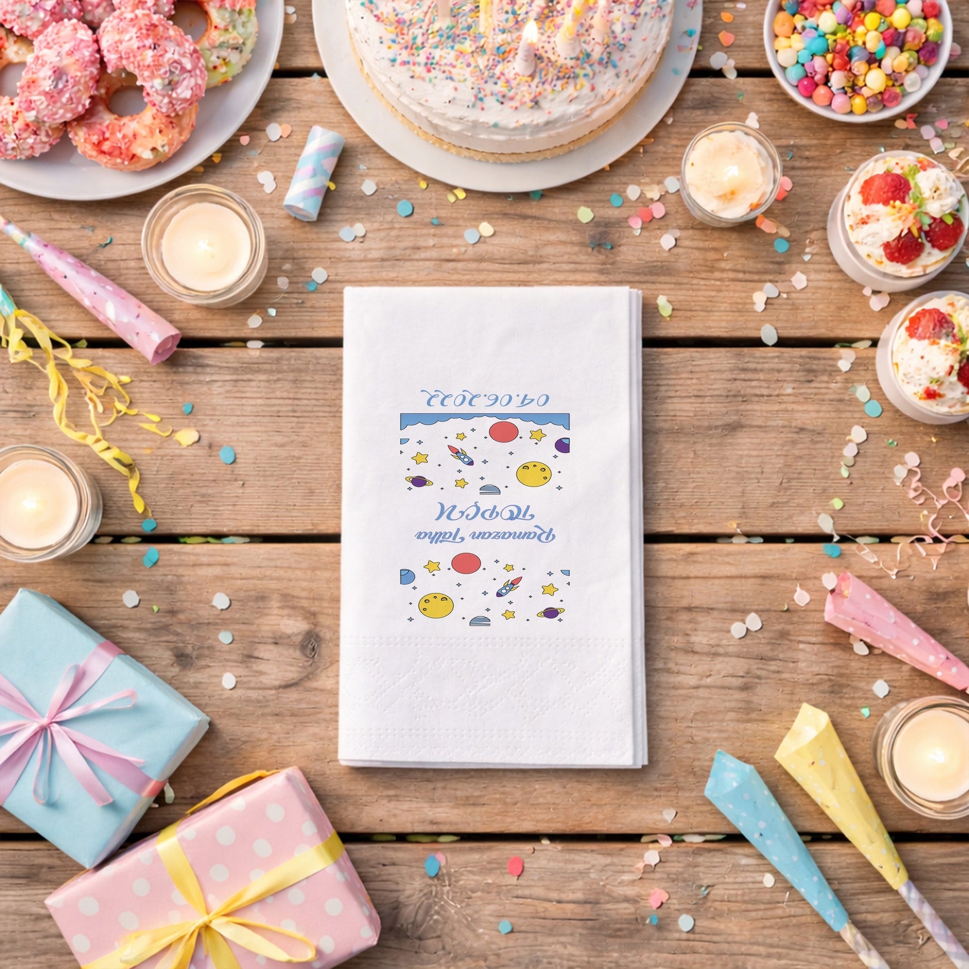 Ramazan Talha için hazırlanan bu özel tasarım, uzayın derinliklerini masanıza getiriyor. Ay, güneş, yıldızlar ve sevimli roket figürleriyle süslenmiş bu peçete, özellikle erkek çocuk doğum günleri için mükemmel bir seçimdir. 04.06.2022 gibi özel tarih eklemeleriyle peçeteyi tamamen kişiselleştirebilirsiniz. Siyah arka plan üzerindeki canlı sarı ve mavi tonlar, masada modern bir kontrast yaratır. Kaliteli malzemesi ve şık baskısıyla hem kullanışlı hem de dekoratiftir. Diş buğdayı veya 1 yaş kutlamaları için özgün bir detay arayan ebeveynler için tasarlanmıştır. Bu peçeteyle partinizdeki her ayrıntı profesyonel bir dokunuş kazanır.