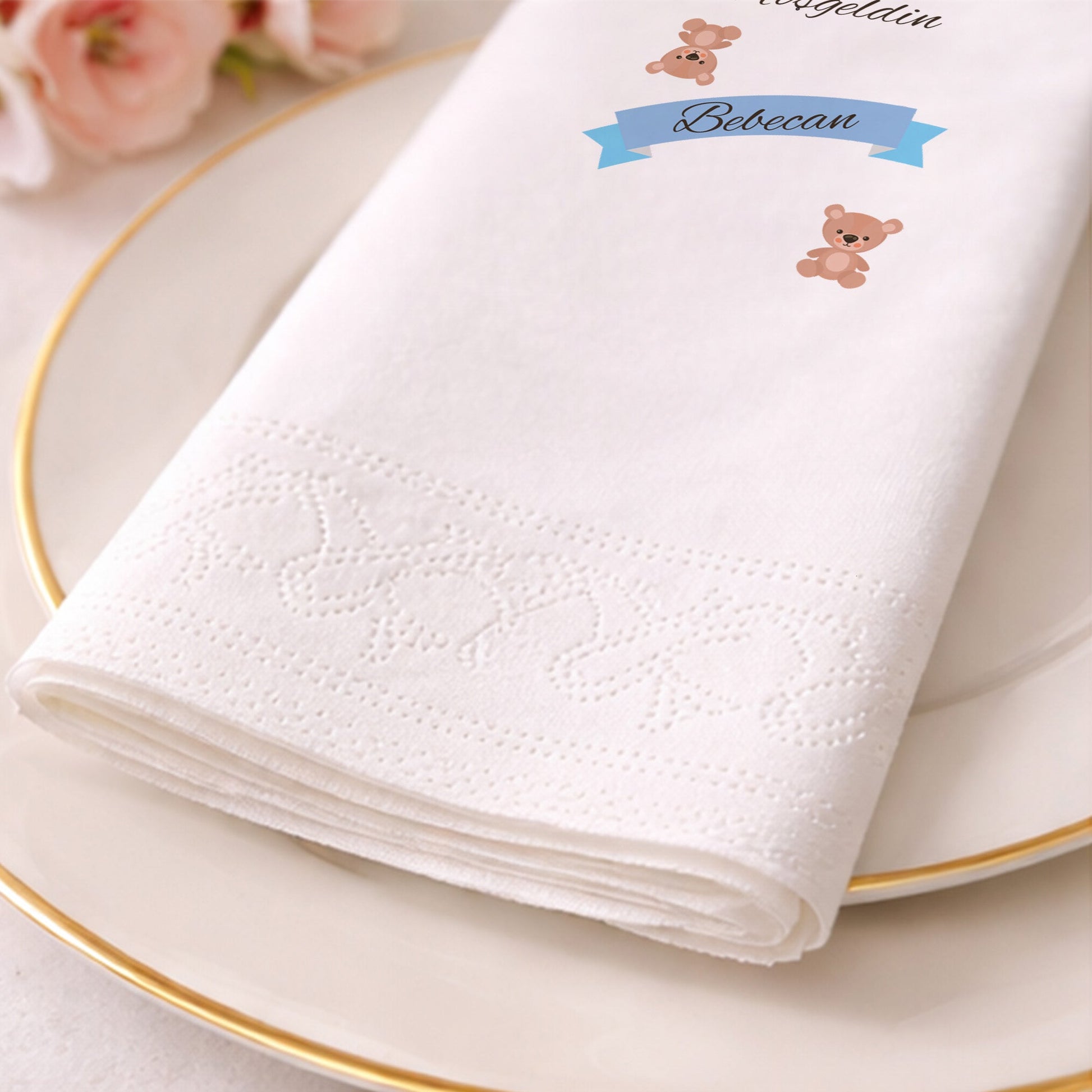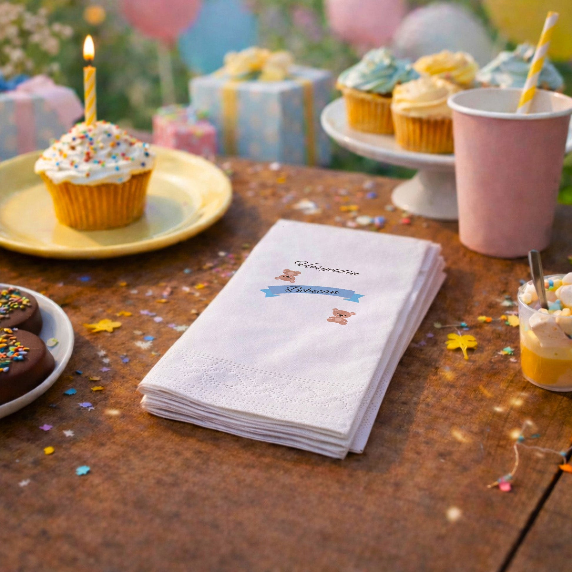 Renkli sıcak hava balonu illüstrasyonu ile tasarlanan bu peçete, kız bebek yenidoğan, baby shower ve diş buğdayı organizasyonları için neşeli ve masalsı bir masa düzeni sunar. Suluboya dokulu balon ve bulut detayları, yumuşak bir atmosfer oluşturur. Kişiye özel isim eklenerek hazırlanan tasarım, organizasyonu tamamen bebeğe özel hale getirir. Çift katlı yapısı hem dayanıklı hem de yumuşak kullanım sağlar. Gıda temasına uygun baskı teknolojisi ile üretilmiştir. Renkli ama sade konseptleri sevenler için ideal bir seçimdir.
