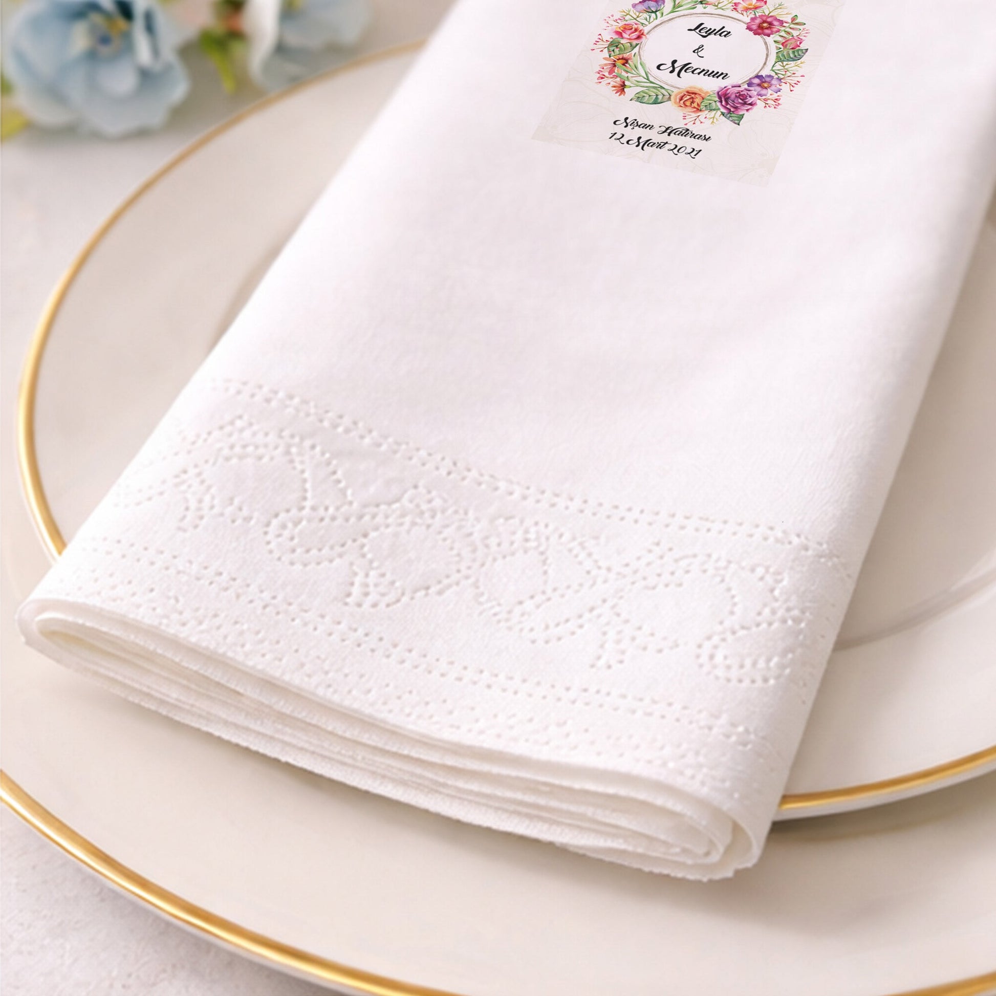 Canlı renklerde çiçek çerçevesiyle tasarlanan bu baskılı peçete, nişan ve düğün organizasyonlarına enerjik ve sıcak bir hava katar. İsim ve tarih eklenebilen tasarım, özel gün peçetesi olarak masalarda dikkat çekici bir detay oluşturur. Organizasyon peçetesi olarak kullanıldığında davet konseptini tamamlayan güçlü bir görsel etki sağlar. Nişan peçetesi ve düğün peçetesi olarak farklı organizasyonlarda rahatlıkla tercih edilebilir. Baskılı peçete kalitesi, desenlerin canlılığını uzun süre korur. Samimi, güven veren ve profesyonel bir marka diliyle hazırlanan bu tasarım, unutulmaz bir masa düzeni oluşturmak isteyen çiftler için ideal bir alternatiftir.