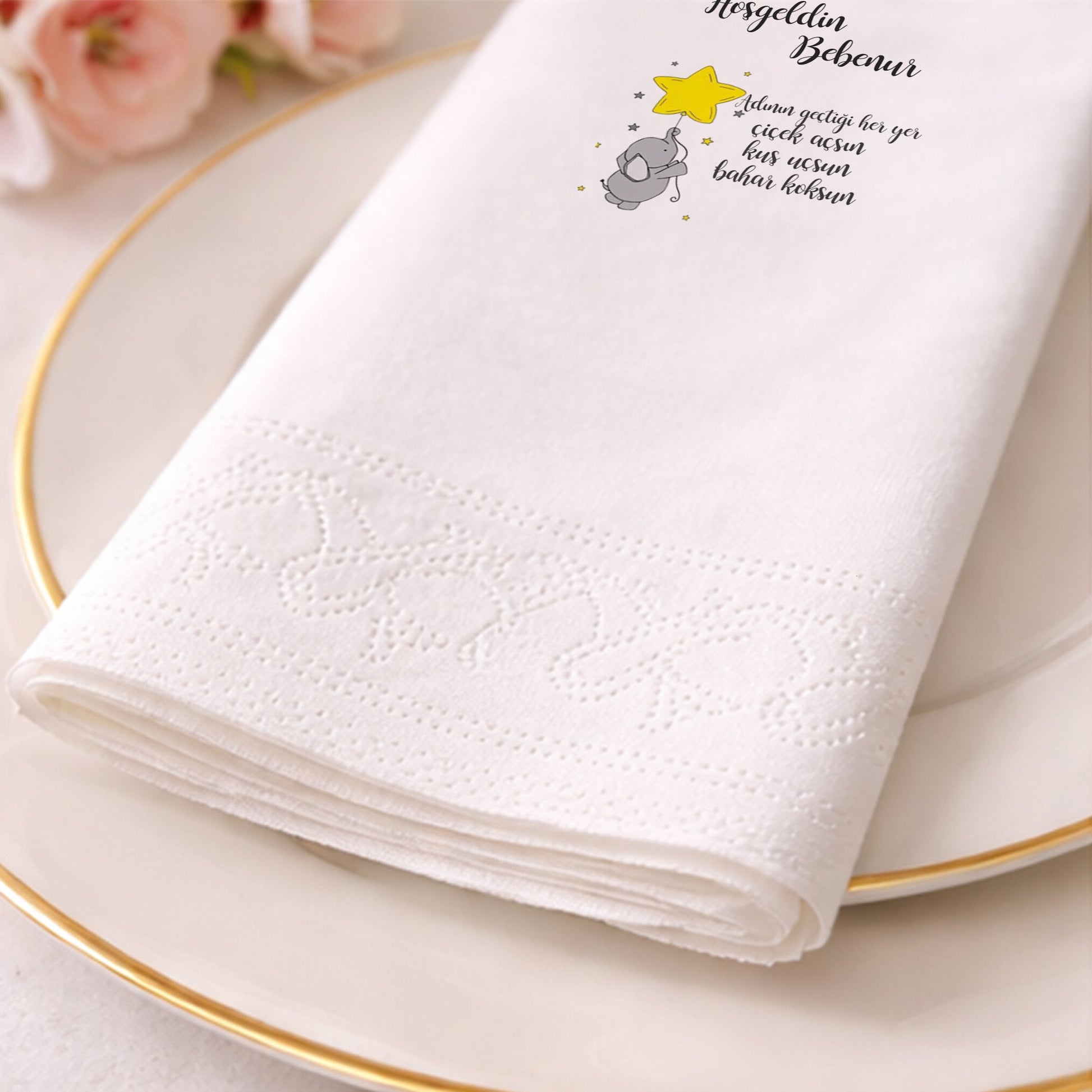 Sarı yıldız balon tutan fil illüstrasyonu ile hazırlanan bu peçete, yenidoğan ziyareti ve baby shower organizasyonları için sıcak ve samimi bir masa düzeni sunar. Şiirsel metni ve sade tasarımıyla duygusal bir atmosfer oluşturur. Kişiye özel isim eklenerek hazırlanan tasarım, misafirler için anlamlı bir hatıra niteliği taşır. Çift katlı yapısı sayesinde yumuşak ve dayanıklıdır. Gıda ile temasa uygun baskı teknolojisi ile üretilmiştir. Evde yapılan sade kutlamalarda veya özel konseptli davetlerde masa sunumunu tamamlayan zarif bir detaydır.
