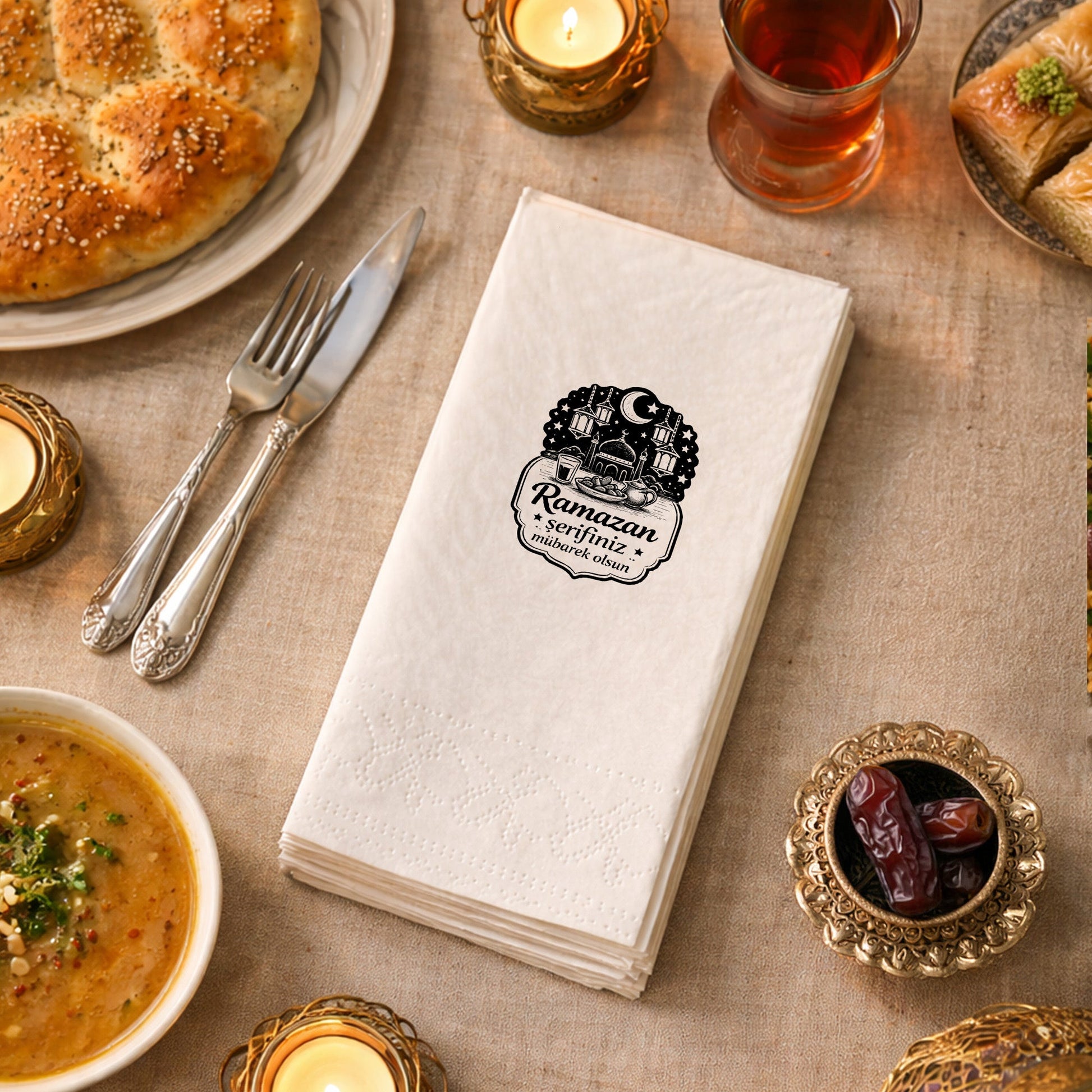 Siyah Etiket Desenli Baskılı Ramazan Peçetesi, cami, ay ve fener detaylarının yer aldığı zarif mühür formu tasarımıyla şık ve dengeli bir sunum sağlar.