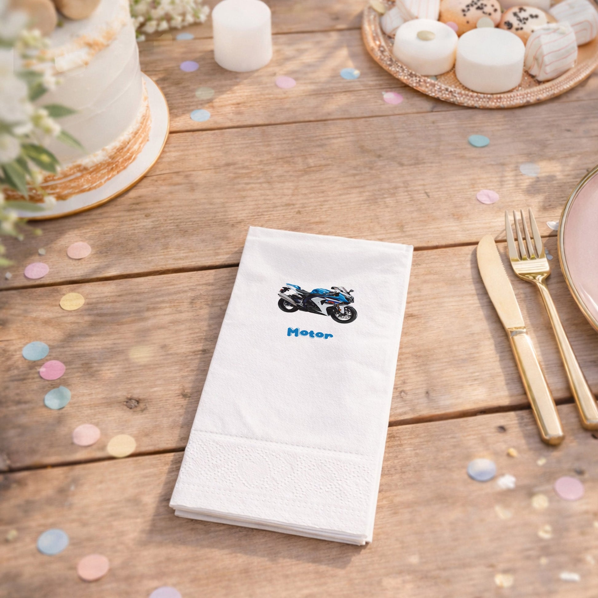 Adrenalin ve hız tutkusunu sofralara taşıyan spor motosiklet figürlü peçete, modern ve havalı bir parti atmosferi yaratır. Mavi ve beyaz renkli detaylı motosiklet tasarımı, gençlerin ve çocukların çok hoşuna gidecek bir görselliğe sahiptir. Yarış temalı doğum günleri için mükemmel bir tamamlayıcıdır. Kaliteli baskısı ve pürüzsüz yüzeyi ile sunumlarınızda profesyonel bir görünüm sağlar. Yumuşak yapısı cilt dostudur ve günlük kullanım konforundadır. Masadaki diğer yarış aksesuarlarıyla birleştiğinde temayı tamamen ortaya çıkarır. Sadece çocuk partilerinde değil, motor sporları meraklısı yetişkinlerin kutlamalarında da fark yaratan, stil sahibi bir üründür.