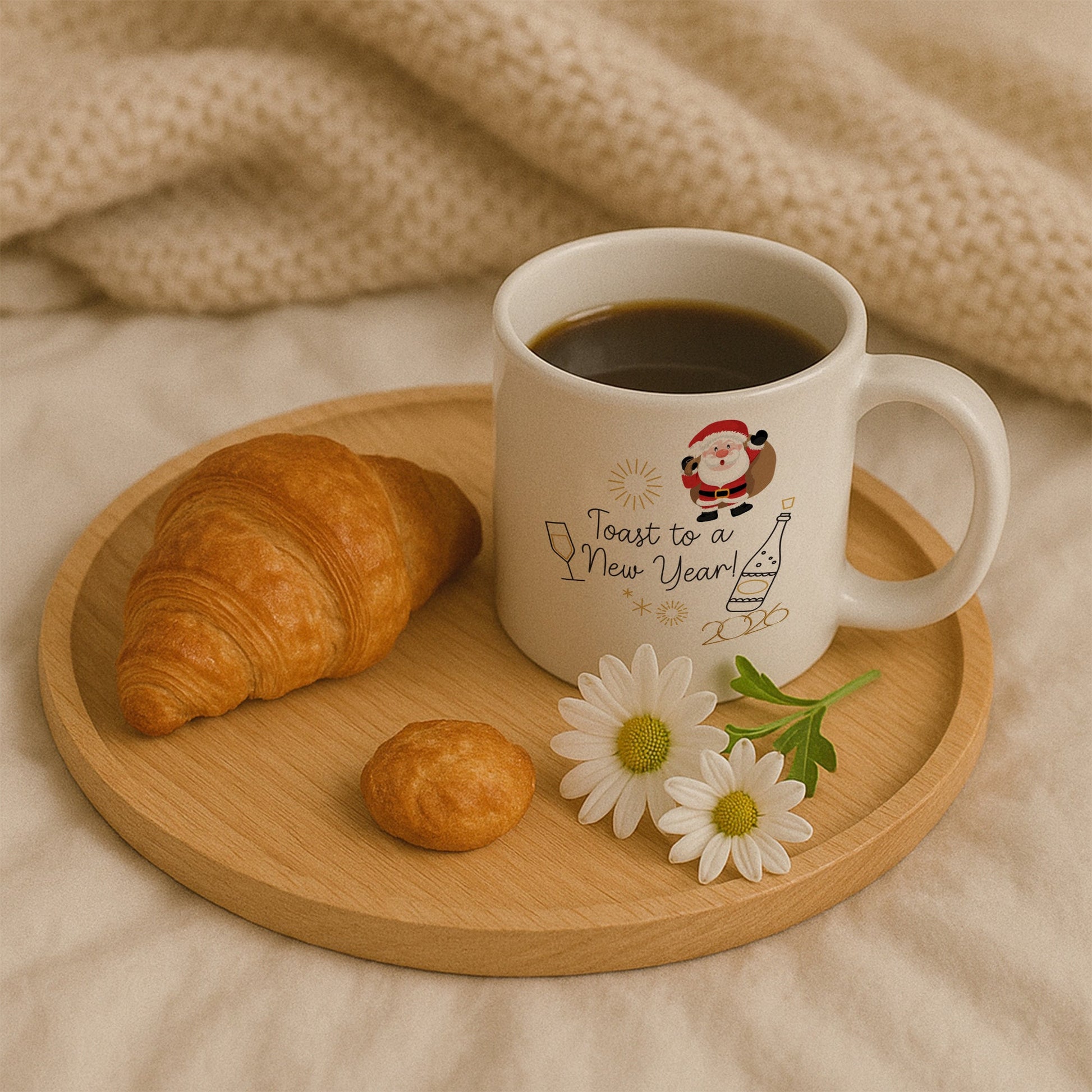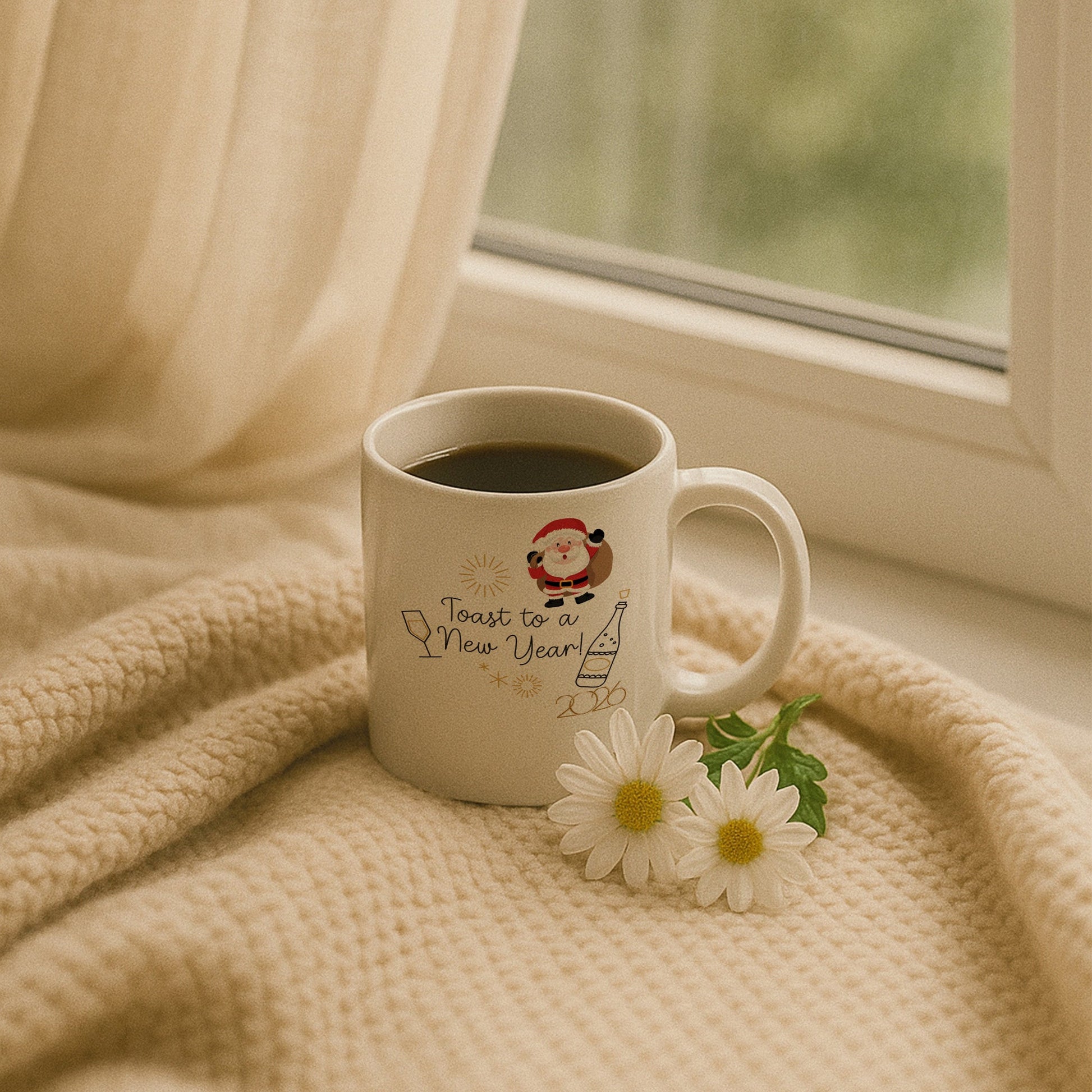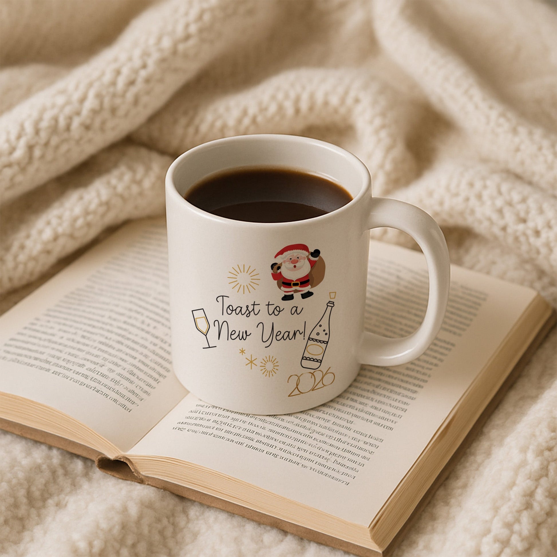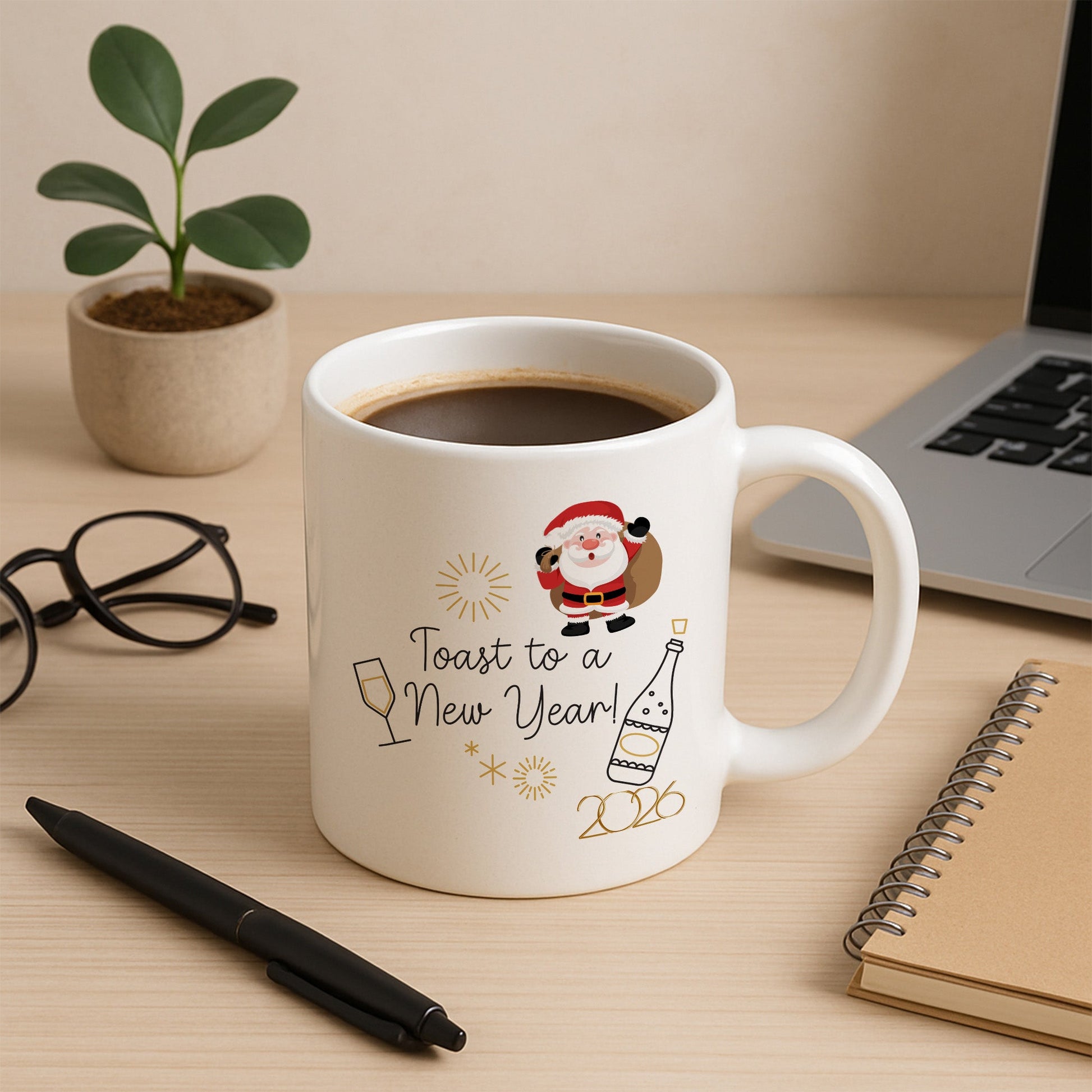 Bu özel tasarım kupa, yeni yılı kutlama heyecanını eğlenceli detaylarla bir araya getirir. Noel Baba figürü, kadeh ve şişe illüstrasyonlarıyla tamamlanan tasarım, yılbaşı sofralarının neşeli ve enerjik atmosferini yansıtır. Ortadaki “Toast to a New Year!” yazısı ve 2026 detayı, kupayı yeni yıla özel anlamlı bir hatıraya dönüştürür.
