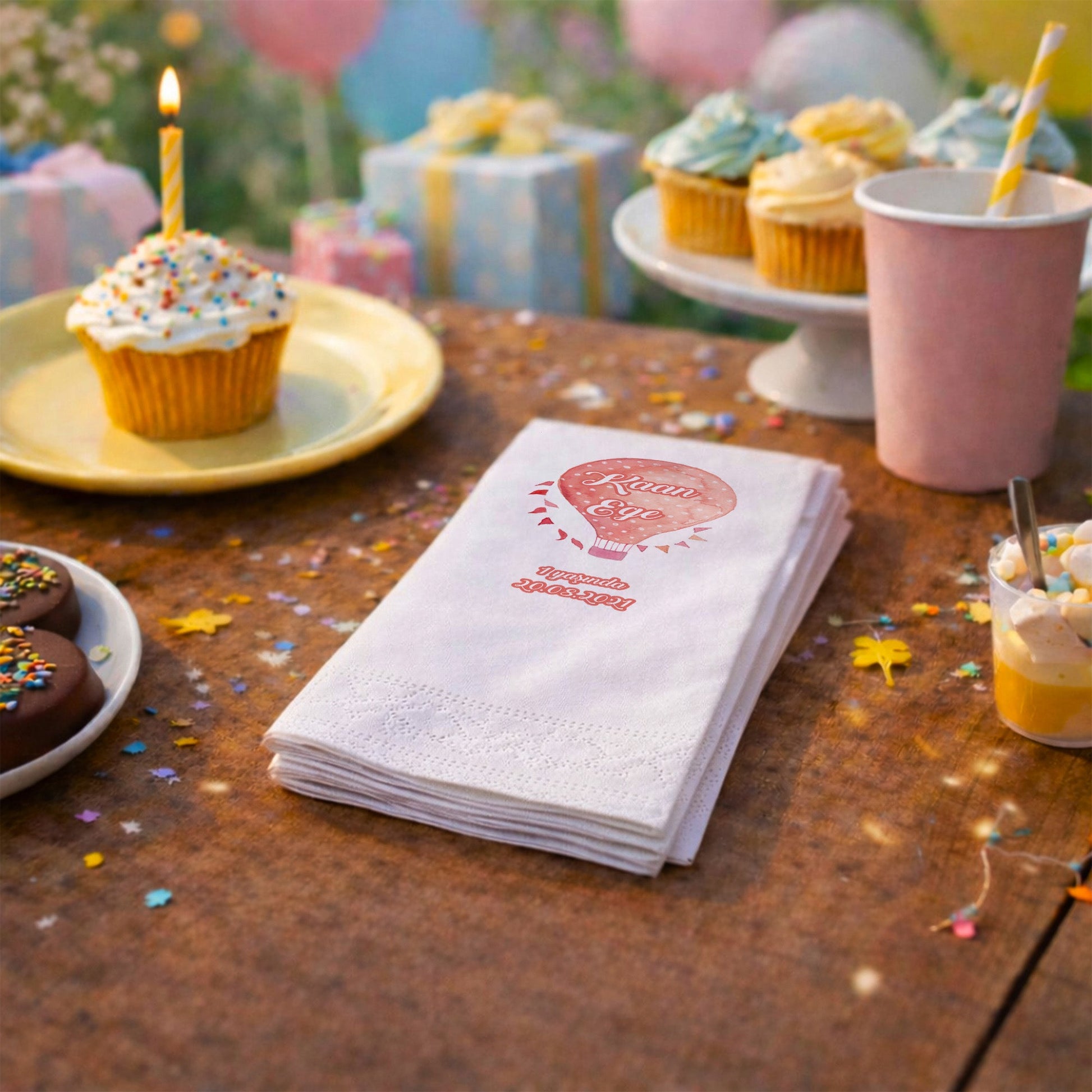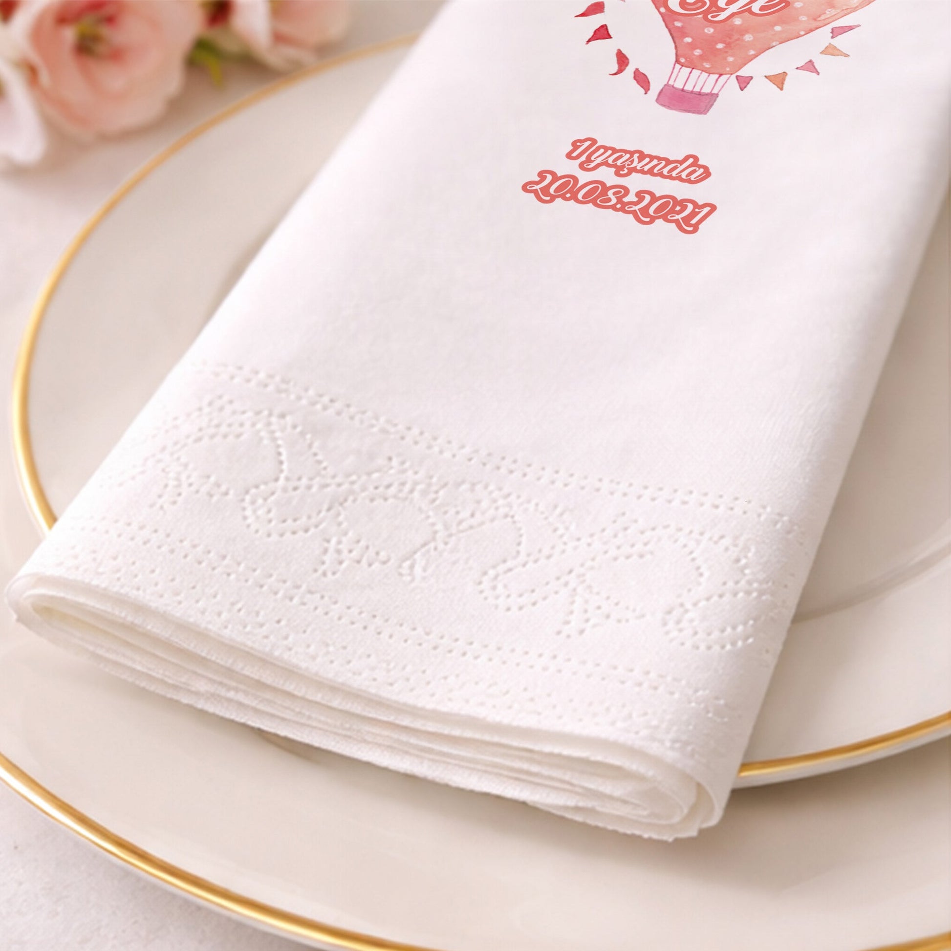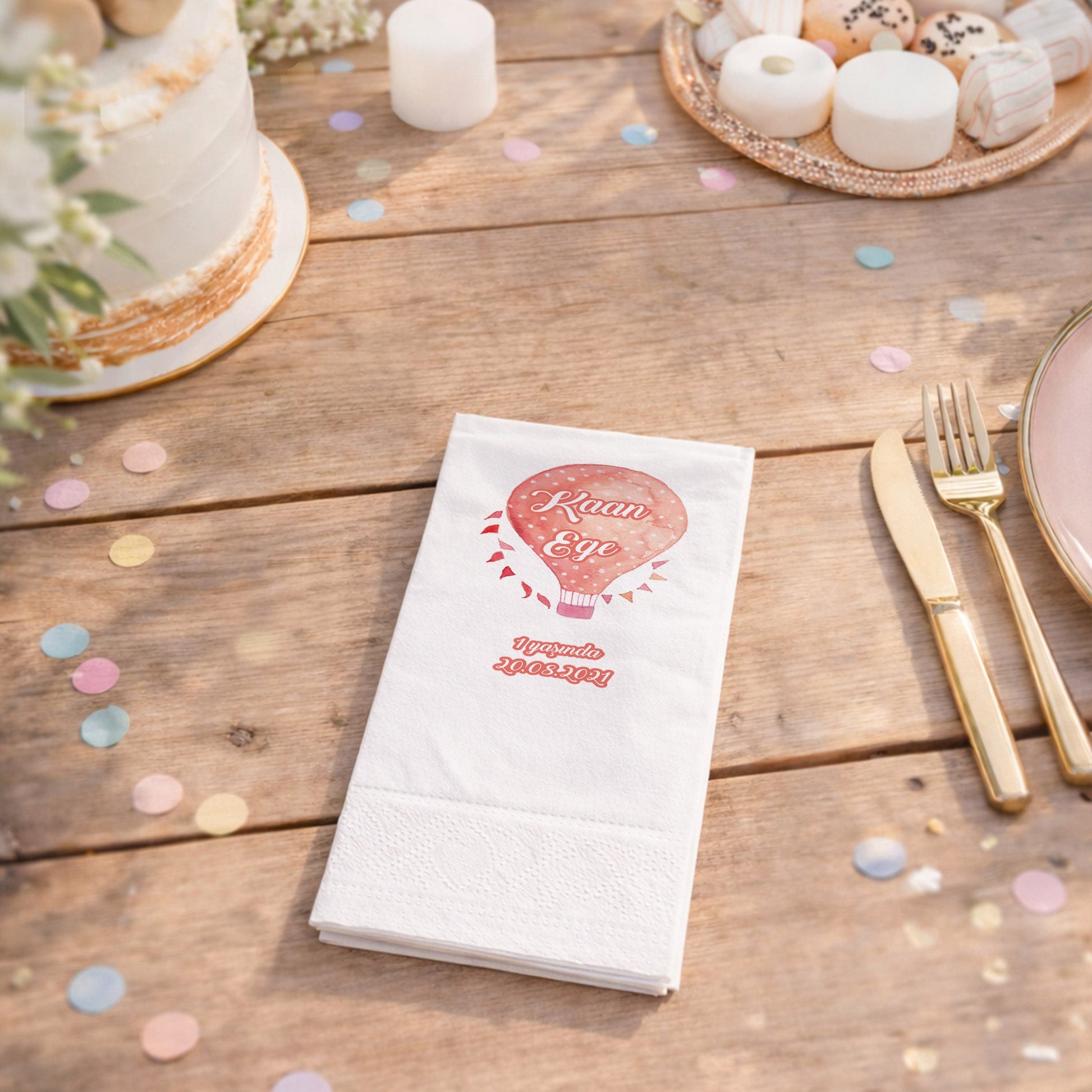 Enerjik turuncu tonları ve beyaz puantiye detaylarıyla hazırlanan bu suluboya sıcak hava balonu tasarımı, Kaan Ege’nin doğum günü masasına sıcaklık katıyor. Yanlardaki küçük flama detayları, kutlama ruhunu pekiştirirken modern ve sanatsal bir görünüm sunuyor. Hem canlı hem de göz yormayan renk geçişleri sayesinde bu peçete, farklı konseptlerle kolayca uyum sağlar. Yüksek kaliteli baskı teknolojisi ile üretilen tasarım, sıvı ile temas ettiğinde dağılma yapmaz ve şıklığını korur. Baby shower, ilk yaş günü veya yenidoğan kutlamalarında fark yaratmak isteyenler için ideal bir tercihtir. İsim ve tarih baskısıyla tamamen size özel hale getirilen bu ürün, davetinizdeki özeni ve kaliteyi misafirlerinize en iyi şekilde yansıtır.