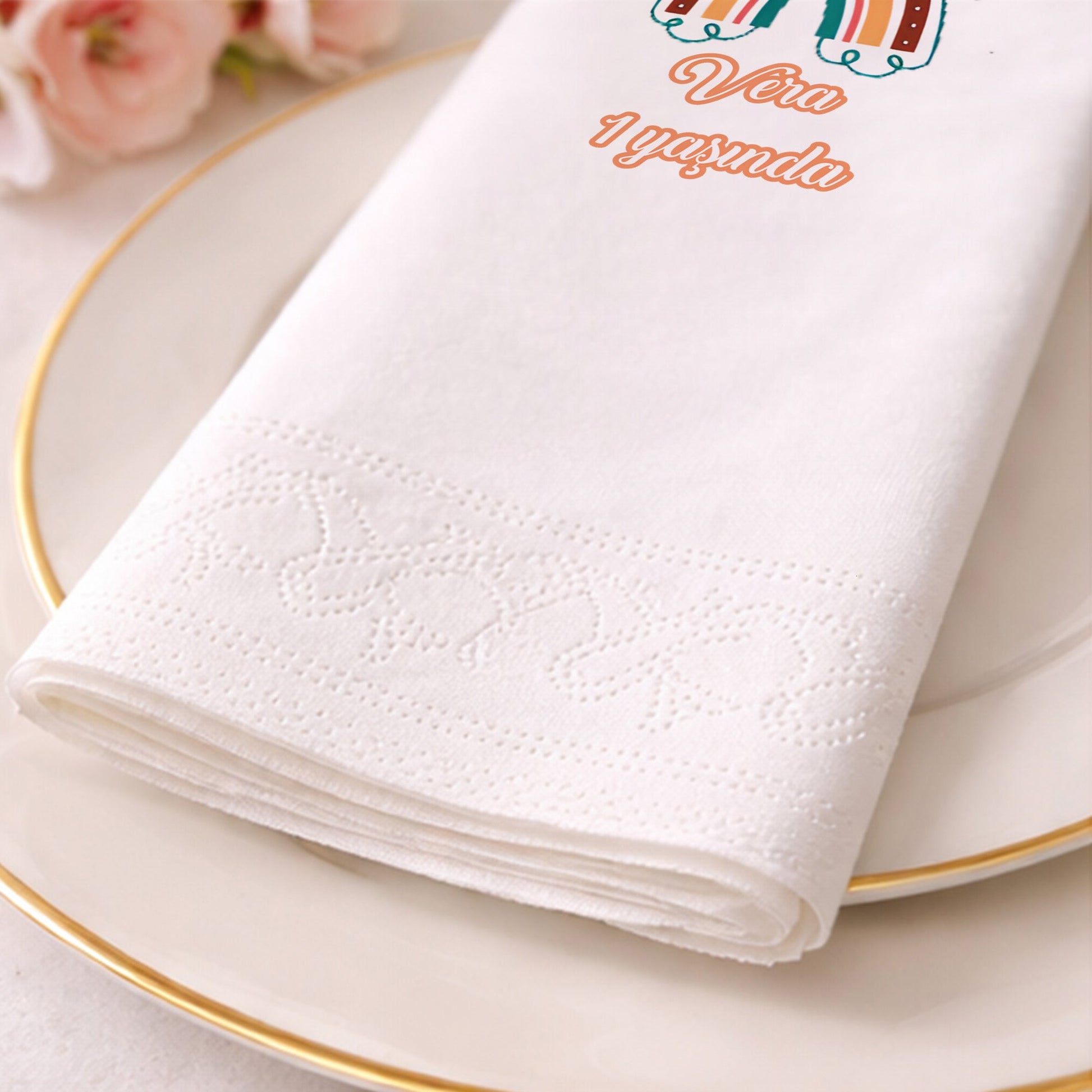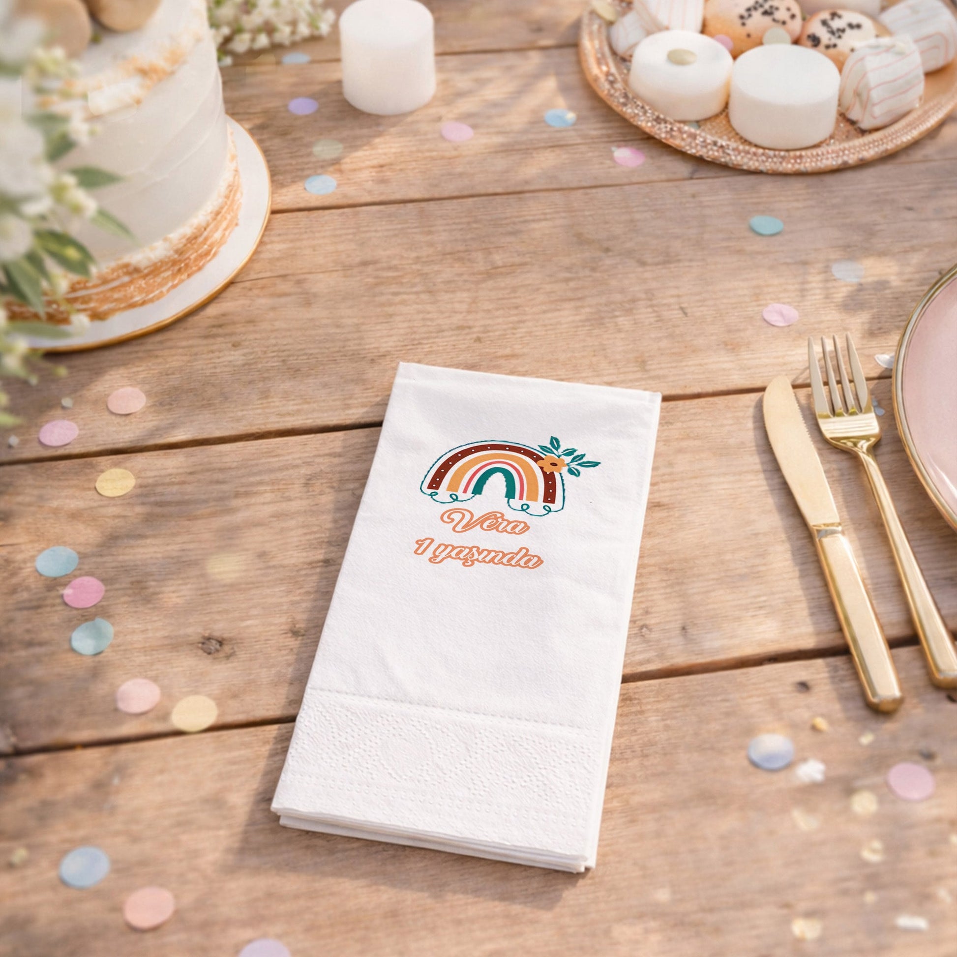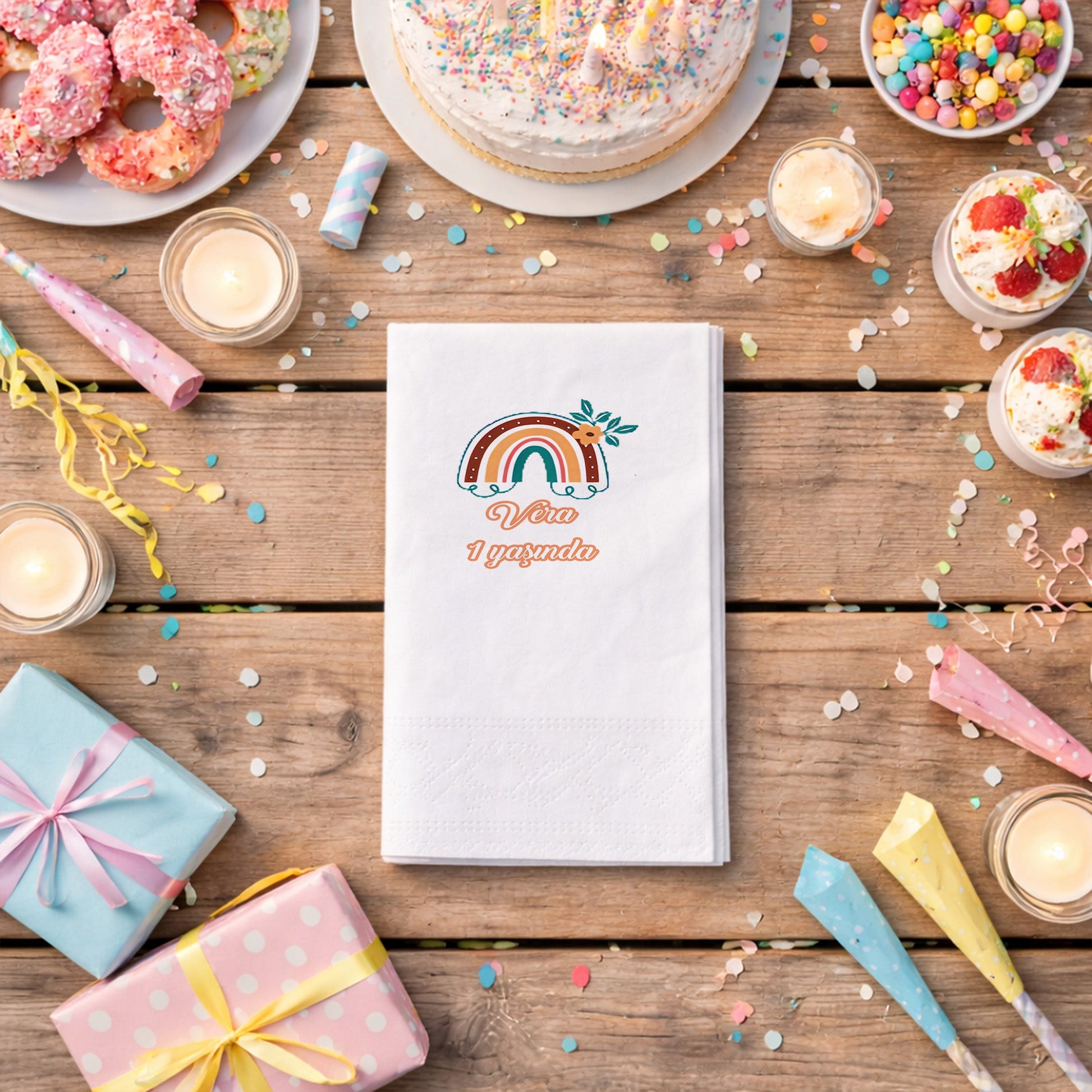 Vera’nın 1. yaş günü için özel olarak tasarlanan bu peçete, bohem tarzı çiçekler ve toprak tonlarındaki gökkuşağı ile doğallığı ön plana çıkarıyor. Turuncu ve yeşilin soft uyumu, özellikle dış mekan veya rustik temalı partiler için mükemmel bir tamamlayıcıdır. Vera ismi, zarif bir fontla tasarımın merkezine yerleştirilmiştir. Yüksek kaliteli baskı tekniği ile hazırlanan bu peçete, masanıza sıcaklık ve samimiyet katar. Baby shower veya doğum günü organizasyonlarında farklılık yaratmak isteyenler için idealdir. Doğal renk paleti sayesinde her türlü sofra dekoruyla kolayca uyum sağlar ve konuklarınızın hafızasında yer eder.