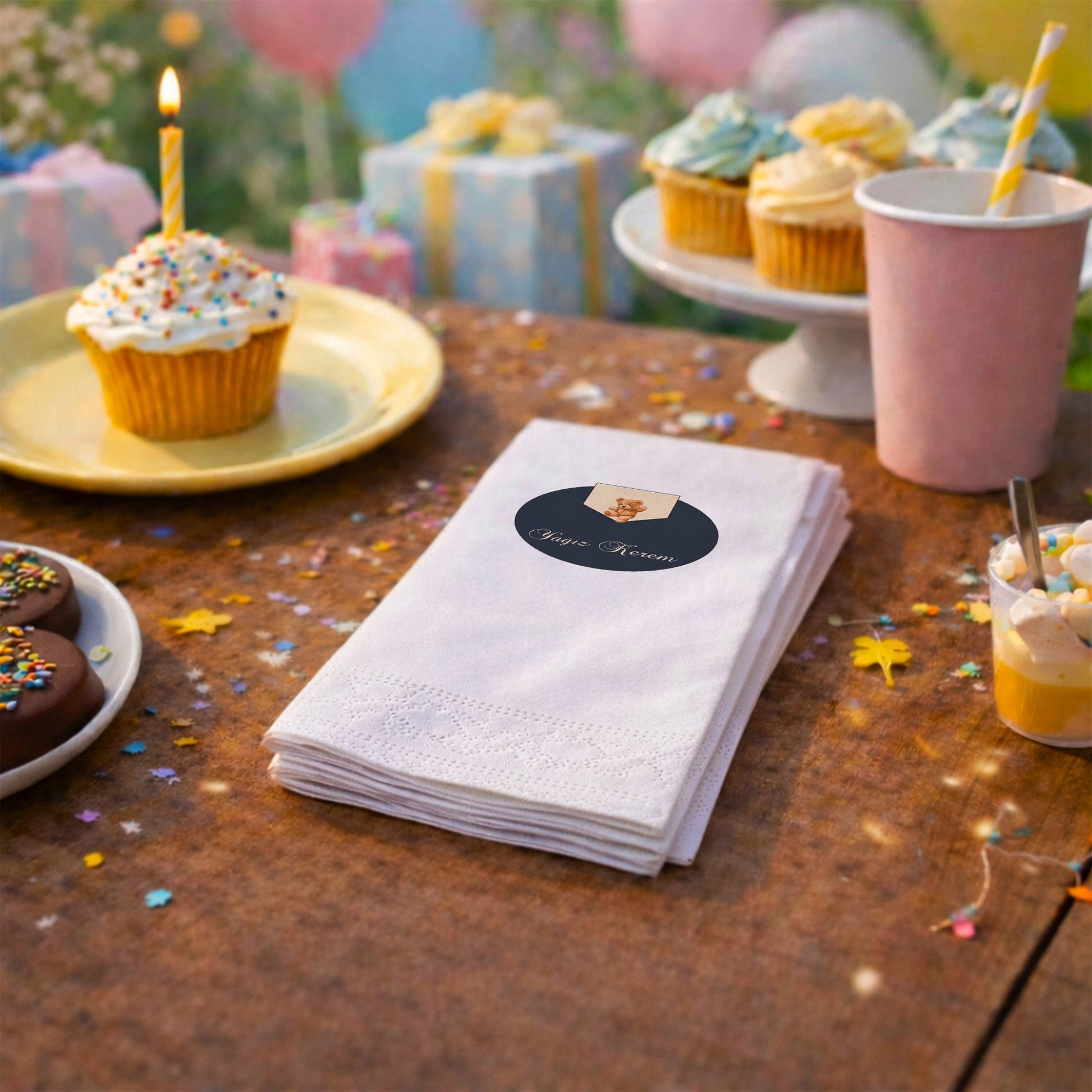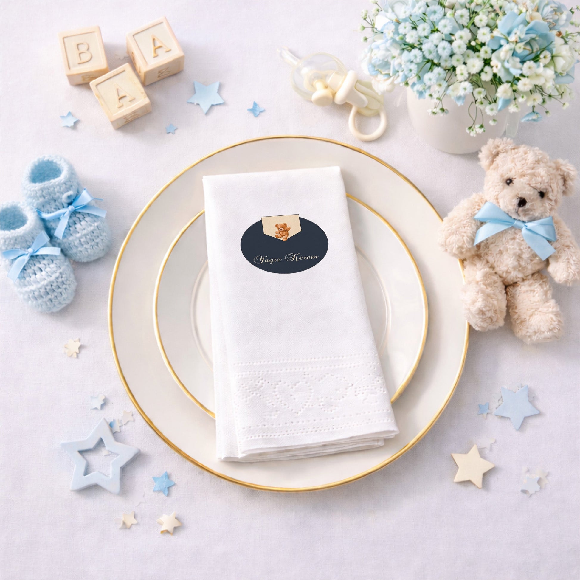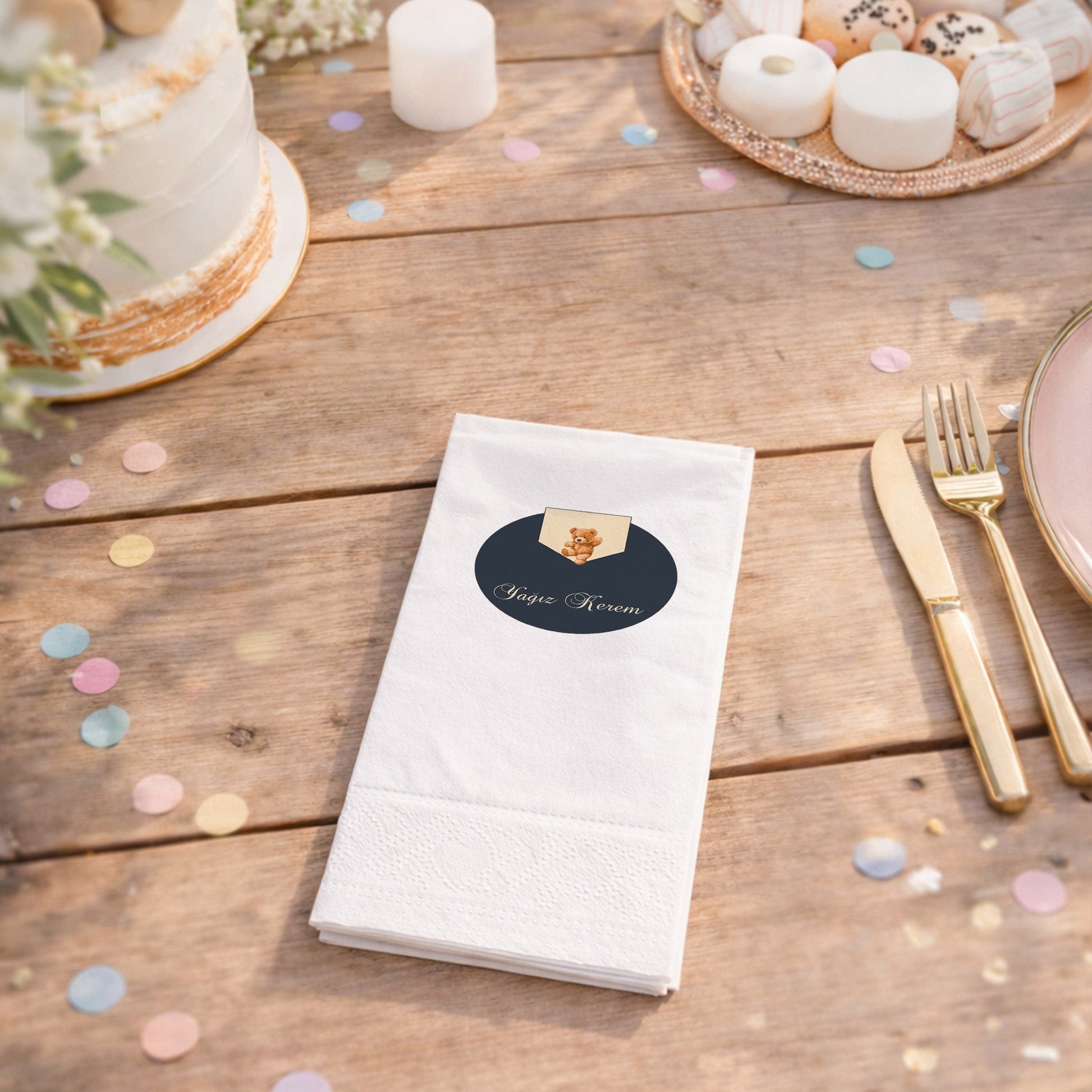 Küçük beylerin özel günleri için tasarlanan bu şık peçete, lacivert zemin üzerinde sevimli ayıcık figürü ve kişiye özel isim detayıyla lüks bir görünüm sunar. Baby shower, mevlit veya doğum günü kutlamalarında tercih edebileceğiniz bu ürün, masanıza asalet ve sıcaklık katar. Krem ve lacivert renklerin uyumu, modern ve klasik tarzı bir araya getirerek sofistike bir atmosfer yaratır. Yumuşak dokulu ve kaliteli kağıttan üretilen peçeteler, özel gün sofralarınızda fark yaratmanız için idealdir. Bebeğinizin isminin yer aldığı bu tasarım, misafirleriniz için de hoş bir anı niteliği taşır. Özenle hazırlanan kutlama sofralarınızın kalitesini artıracak bu özel tasarım peçeteye hemen sahip olun.