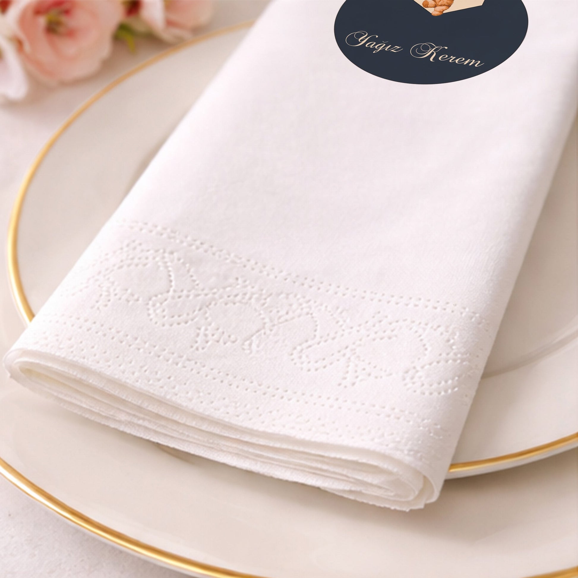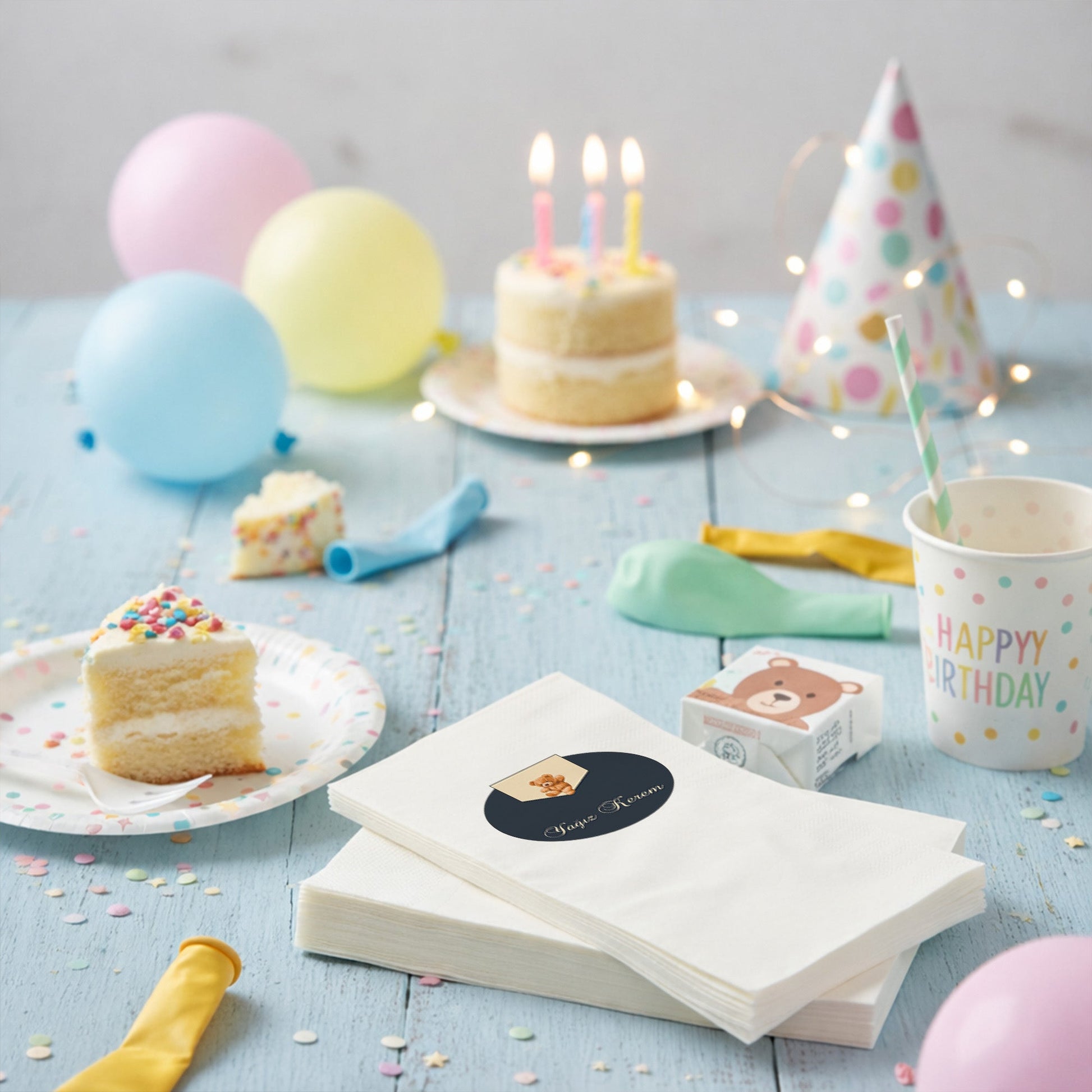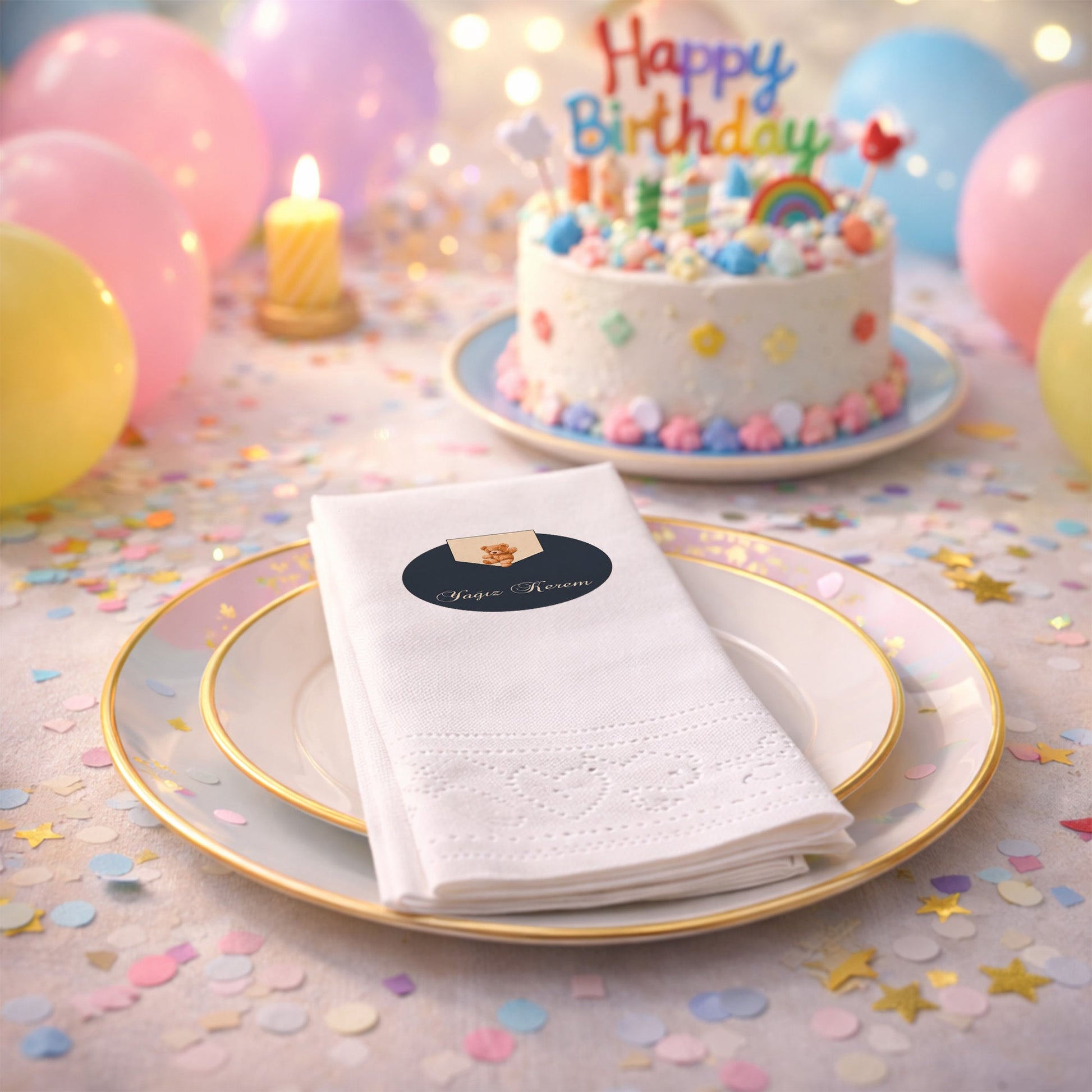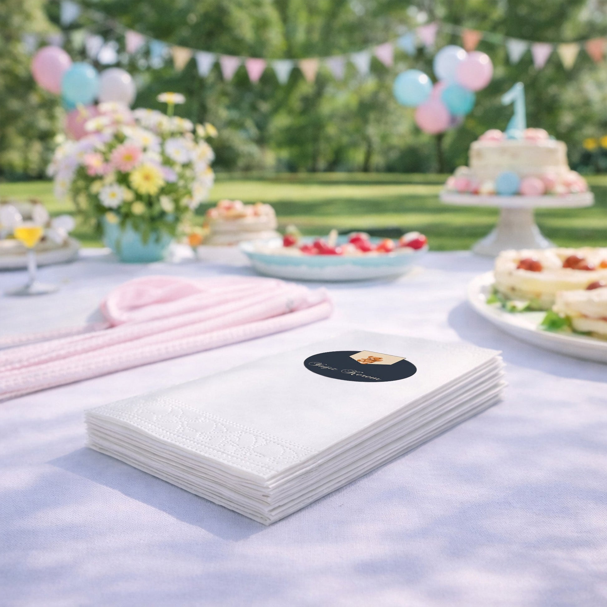 Küçük beylerin özel günleri için tasarlanan bu şık peçete, lacivert zemin üzerinde sevimli ayıcık figürü ve kişiye özel isim detayıyla lüks bir görünüm sunar. Baby shower, mevlit veya doğum günü kutlamalarında tercih edebileceğiniz bu ürün, masanıza asalet ve sıcaklık katar. Krem ve lacivert renklerin uyumu, modern ve klasik tarzı bir araya getirerek sofistike bir atmosfer yaratır. Yumuşak dokulu ve kaliteli kağıttan üretilen peçeteler, özel gün sofralarınızda fark yaratmanız için idealdir. Bebeğinizin isminin yer aldığı bu tasarım, misafirleriniz için de hoş bir anı niteliği taşır. Özenle hazırlanan kutlama sofralarınızın kalitesini artıracak bu özel tasarım peçeteye hemen sahip olun.