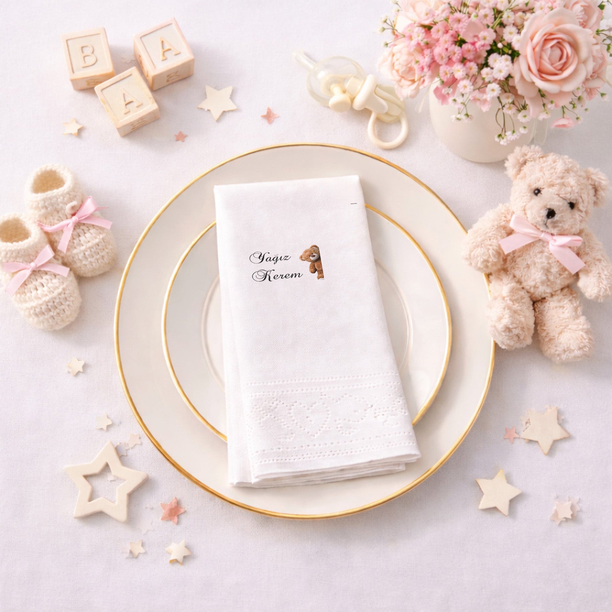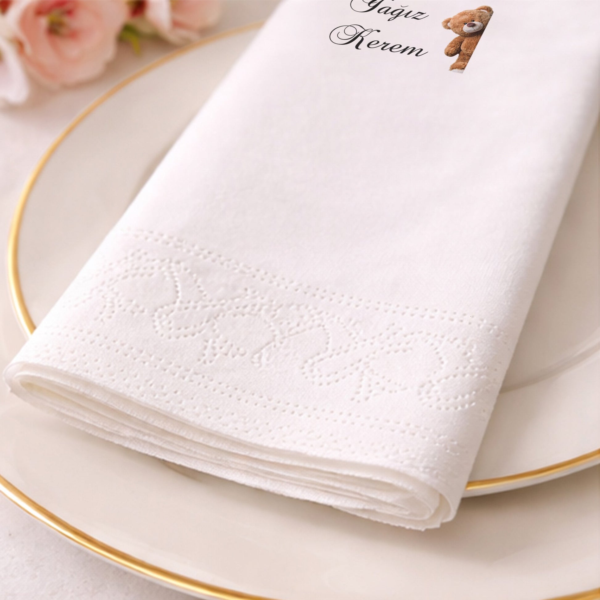 Modern ve minimalist bir tarzı benimseyen ebeveynler için hazırlanan bu özel tasarım, siyah zemin üzerindeki derinliği sevimli bir ayıcık figürüyle yumuşatıyor. Yağız Kerem isminin zarif bir fontla işlendiği peçete, maskülen ve şık bir parti konsepti için birebirdir. Yüksek kontrastlı tasarımı sayesinde masanızda dikkat çekici bir stil oluşturur. Kaliteli hamurdan üretilen peçeteler, hem dayanıklılığı hem de yumuşaklığı ile kullanım sırasında konfor sağlar. Doğum günü partilerinden bebek mevlitlerine kadar geniş bir yelpazede kullanılabilir. Farklı ve unutulmaz bir sunum arayışındaysanız, kişiye özel bu tasarım kutlamanızın en ilgi çekici parçalarından biri olmaya adaydır. Şıklığı ve işlevselliği bir arada sunan bu ürünü kaçırmayın.