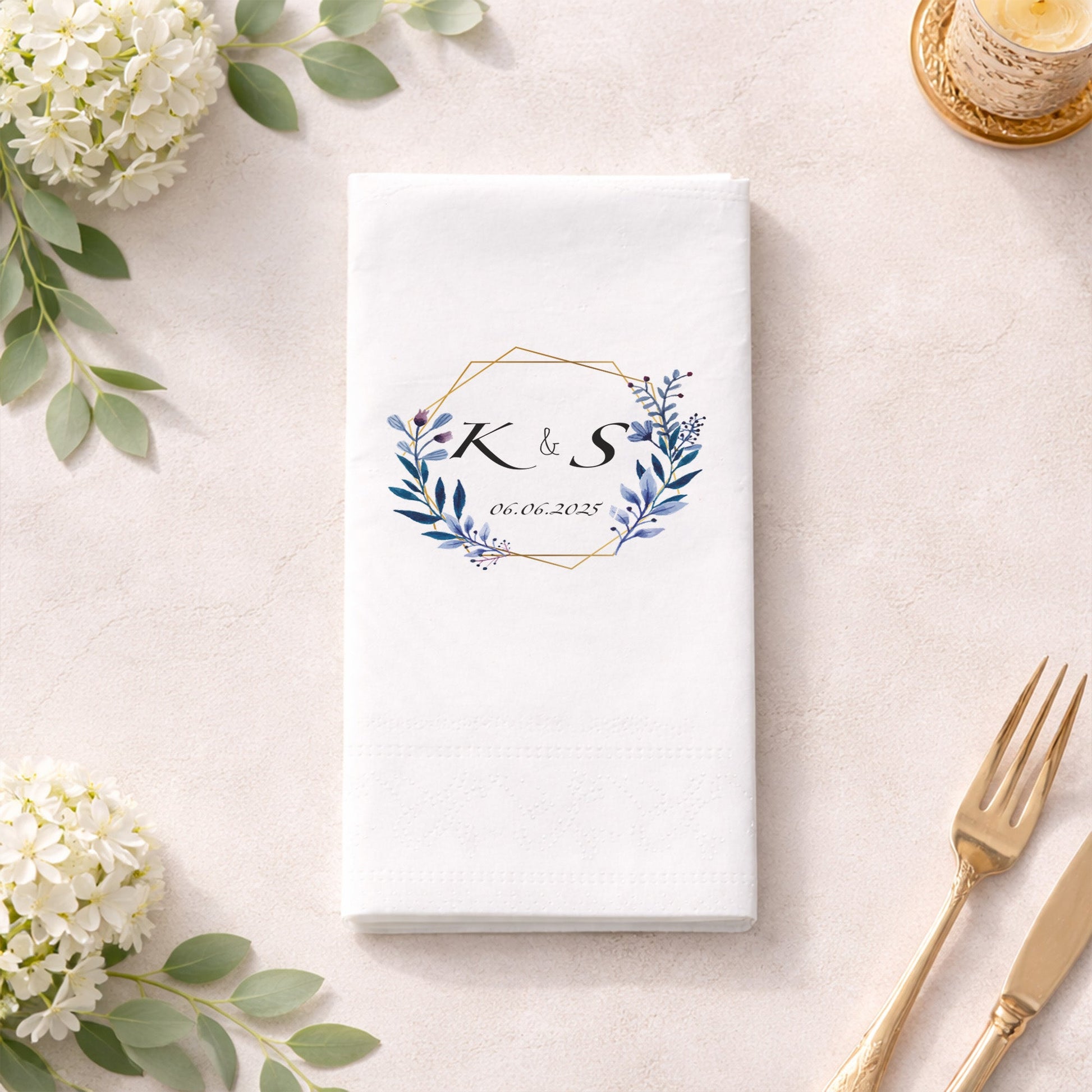 Geometrik altın çerçeve ve mavi tonlarda yaprak illüstrasyonlarıyla tasarlanan bu baskılı peçete, düğün ve nişan organizasyonlarında modern ve zarif bir sunum sağlar. İsim ve tarih bilgisiyle kişiselleştirilebilen tasarım, özel gün peçetesi olarak masalara bütünlük kazandırır. Organizasyon peçetesi kullanımında sade ama güçlü bir görsel etki sunar. Düğün peçetesi ve nişan peçetesi olarak farklı konseptlerle uyumludur. Baskılı peçete kalitesi sayesinde yazılar net, desenler dengelidir. Zamansız bir tasarım arayan çiftler için profesyonel, güven veren ve estetik bir tercih sunar.