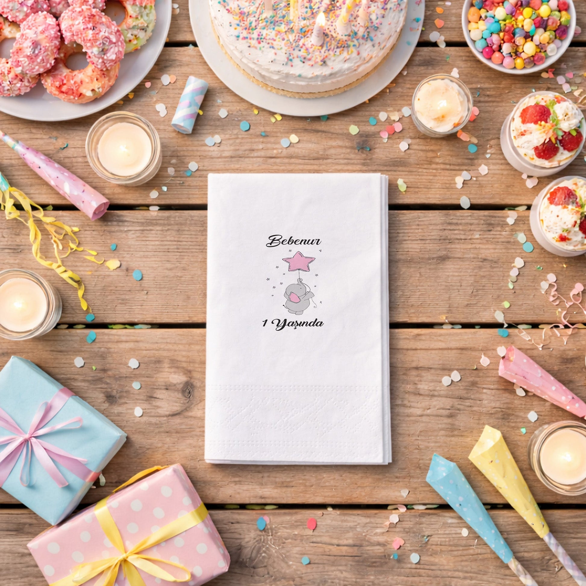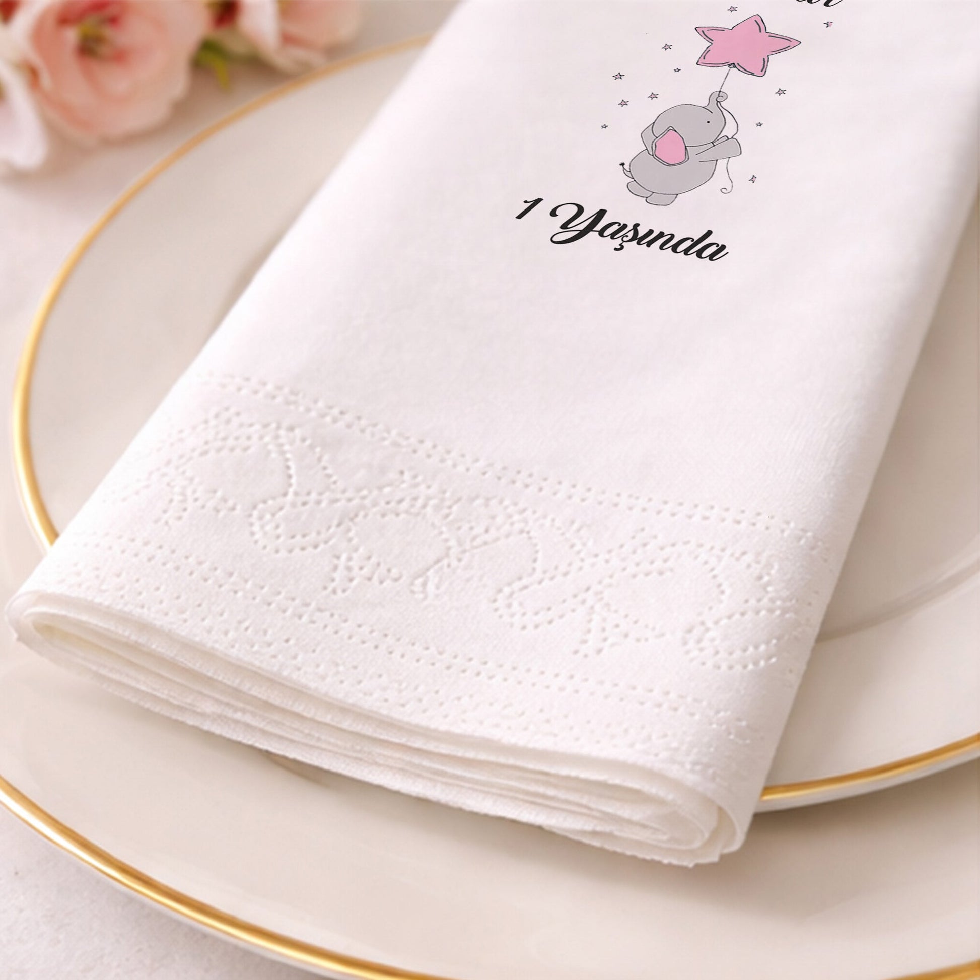 Yıldız şeklinde balon tutan sevimli fil illüstrasyonu ile tasarlanan bu peçete, kız bebek 1 yaş doğum günü, baby shower ve diş buğdayı organizasyonları için neşeli ve yumuşak bir masa düzeni oluşturur. Pastel pembe tonları, sade arka planla birleşerek ferah ve huzurlu bir görünüm sunar. Kişiye özel isim ve yaş bilgisi eklenerek hazırlanan tasarım, organizasyonu tamamen bebeğe özel hale getirir. Çift katlı yapısı sayesinde dayanıklı ve yumuşak bir kullanım sağlar. Gıda ile temasa uygun baskı teknolojisi ile üretilmiştir. Evde yapılan kutlamalar ve sade konseptli davetler için şık ve anlamlı bir masa tamamlayıcısıdır.