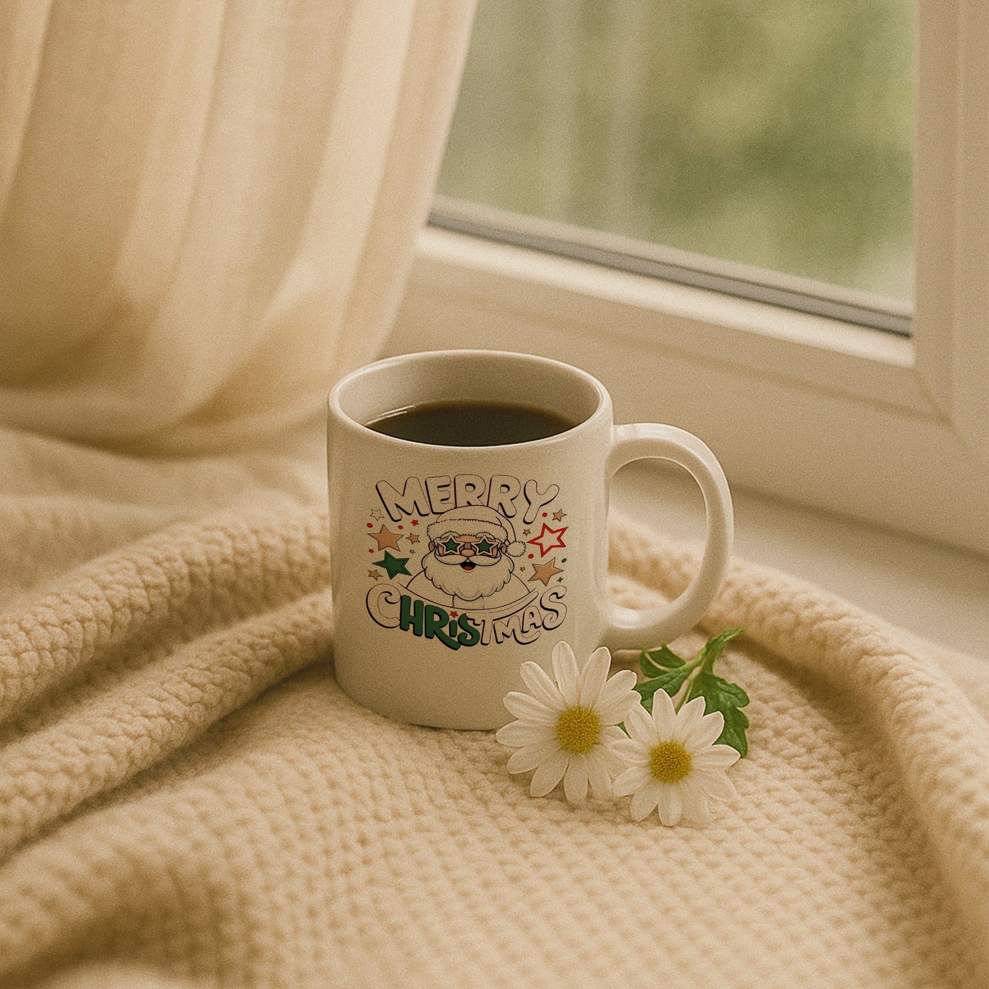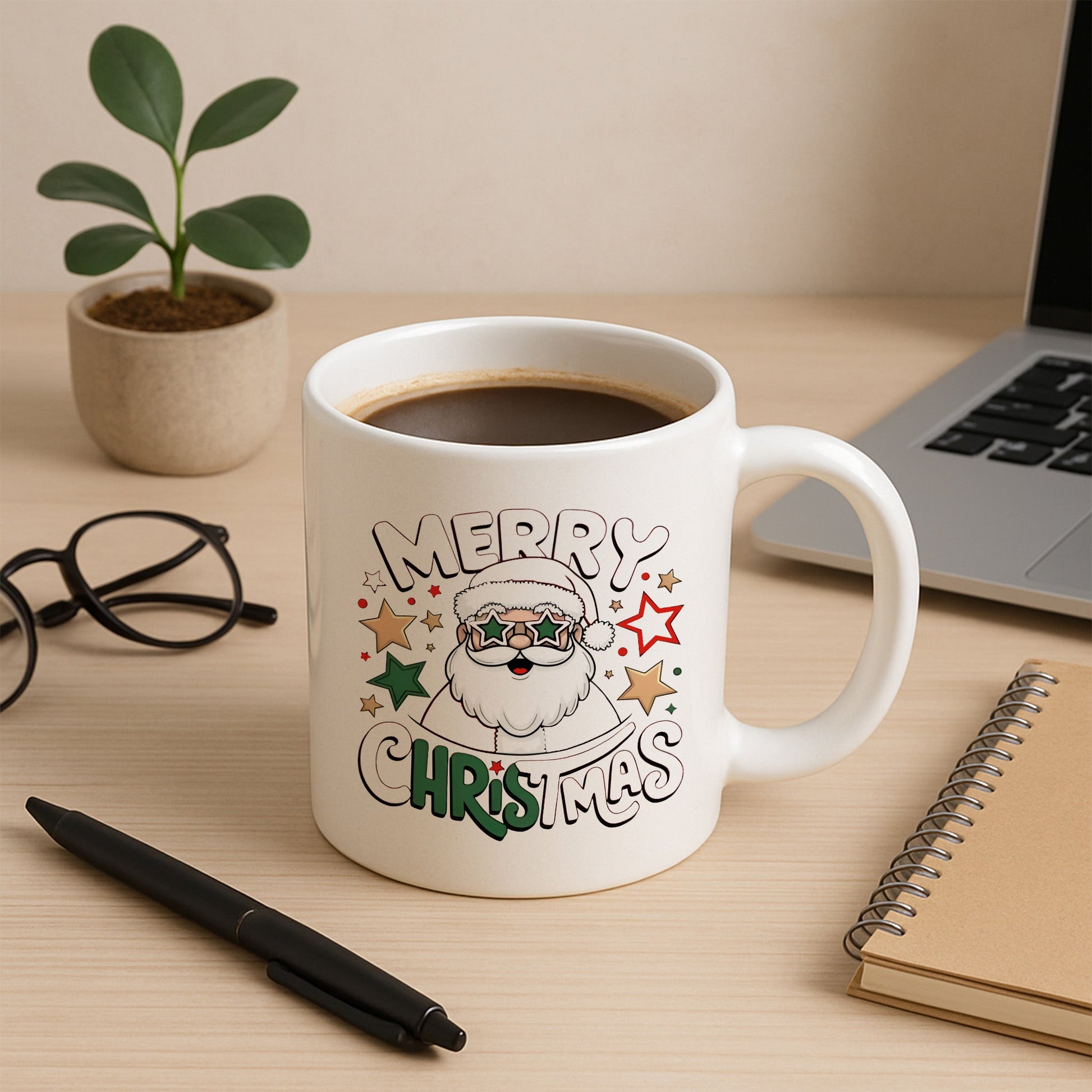 Yıldız detaylı gözlük tasarımıyla öne çıkan, eğlenceli ve modern Noel Baba temalı yılbaşı kupası.
